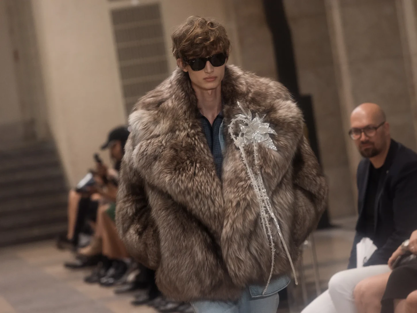 Koma, z właściwym sobie poczuciem humoru i autoświadomością, czerpie z różnych archetypów męskości. Beckham – ikona popu i futbolu, symbol mężczyzny z okładki tabloidu. Jego styl z początku lat 2000: przetarte dżinsy, ciężkie płaszcze ze skóry, kurtki z woskowanej bawełny i czerwony shearling – wraca tu jak echo paparazzi epoki przed Instagramem. Najbardziej bezpośredni hołd? T-shirt z aplikacją i kryształowym napisem „I LOVE DAVID” – pastisz kultowej koszulki Beckhama „I KISS FOOTBALL”.