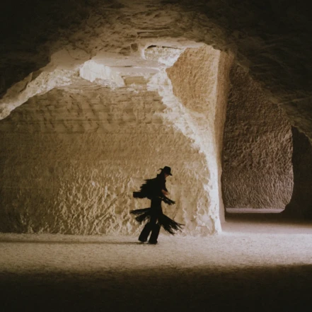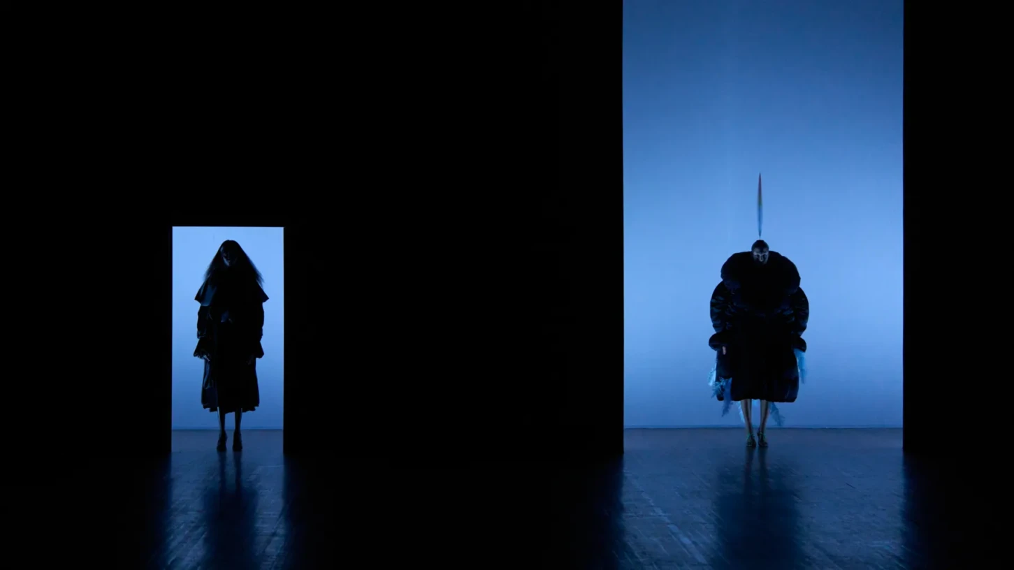 Na wybiegu pojawiło się 30 sylwetek, podzielonych na 15 par: każda para to dwa technicznie identyczne czarne outfity, ale o zupełnie innym nastroju. Pierwszy – przesadzony, upierzony, spektakularny. Drugi – gładki, cichy, jak cień poprzedniego. Zestawione razem tworzą duet obecności i nieobecności.
