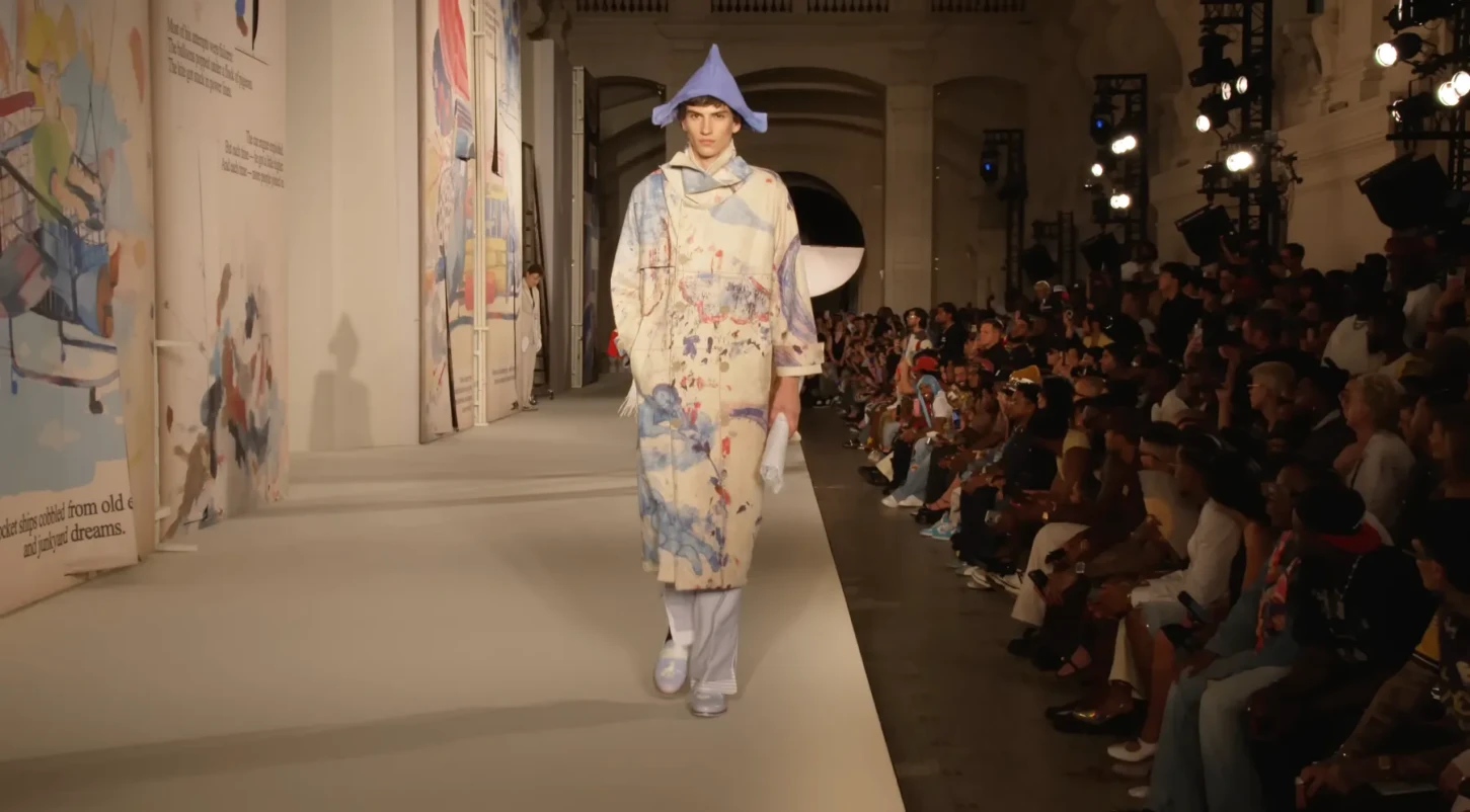 Pokaz odbył się w Musée des Arts Décoratifs przy Luwrze — ale zapomnij o muzealnym patosie. Scenografia przypominała sen rysowany w zeszycie do matmy — z nutą kosmicznego absurdu, dziecięcej naiwności i poetyckiego rozmachu. Dillane dosłownie i metaforycznie wzbił się w powietrze: od garniturów w księżycowe printy, przez sylwetki jak zatrzymane w locie, po paletę kolorów rodem z dziecięcych bajek. To moda, która nie sili się na bycie „modną” — ona po prostu jest opowieścią.