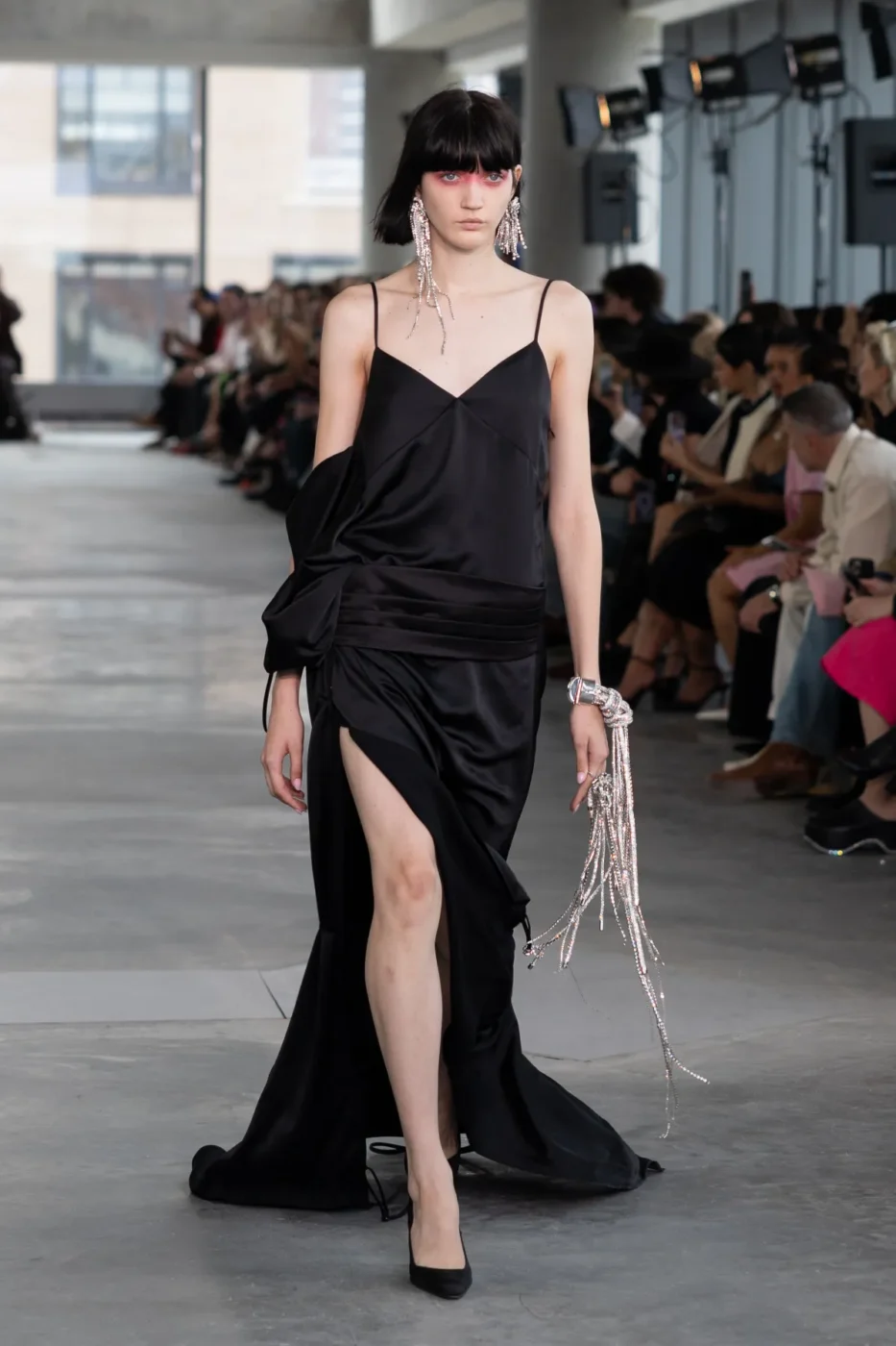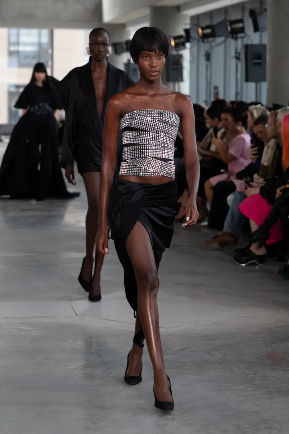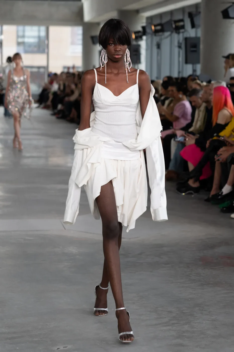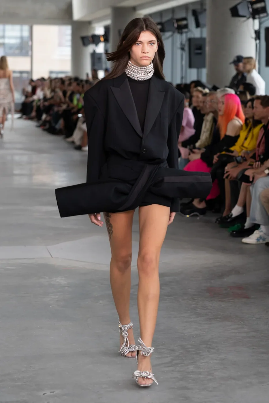 Aburn nie ogranicza się do metafor – kolekcja jest pełna wyrazistych, namacalnych sylwetek. Pierwszy look to czarna satynowa bluza z kapturem zestawiona z cargo capri, mieszanka sportowego luzu i miejskiego dramatyzmu. Dalej pojawiają się mini spódnice – denimowe, asymetryczne, konstruowane z nogawek jeansów zawiązanych w kokardy, a także wersje z taffety łączone z dopasowanymi golfami. Na wybiegu oglądamy także oversize’owe marynarki z szerokimi ramionami, zestawione z jeansami albo spodniami wieczorowymi – tailoring, który nie boi się dekonstrukcji. Wśród mocniejszych punktów są też bodysuity wysadzane kryształami i sukienki typu slip noszone na odwrót. Transparentność gra tu kluczową rolę, odsłaniając ciało i nadając mu blask.