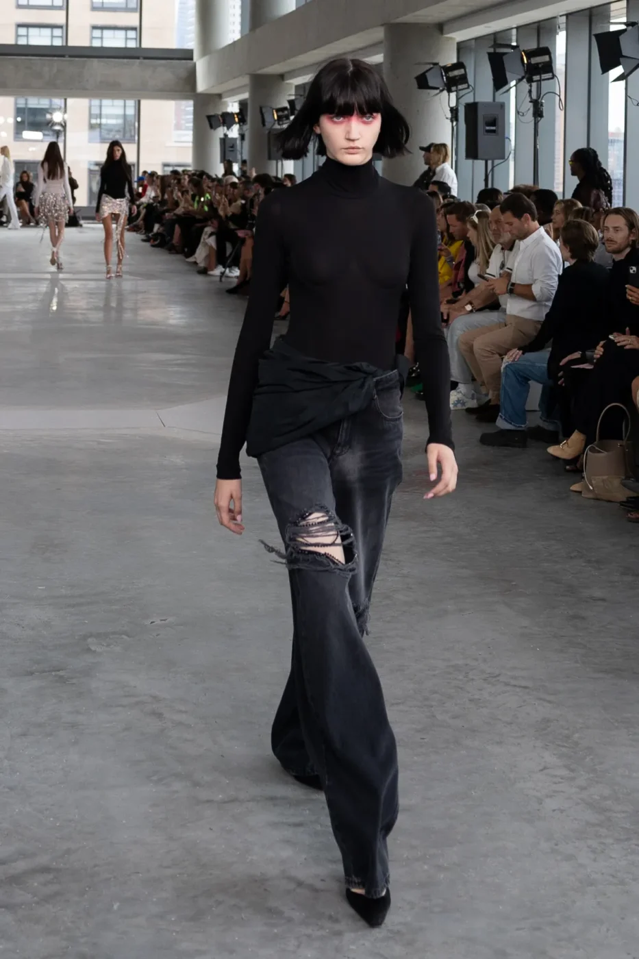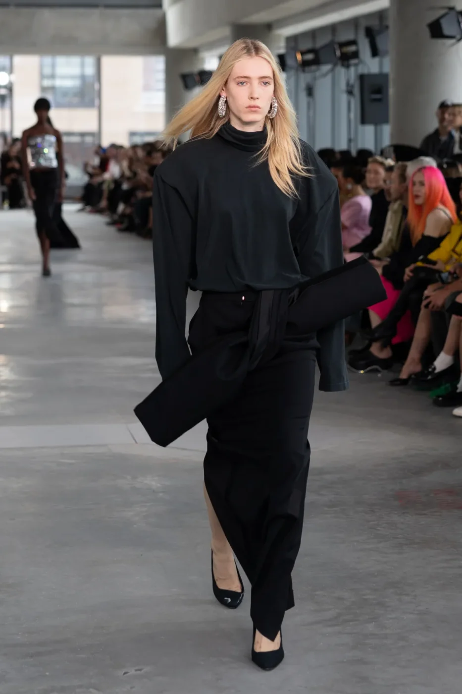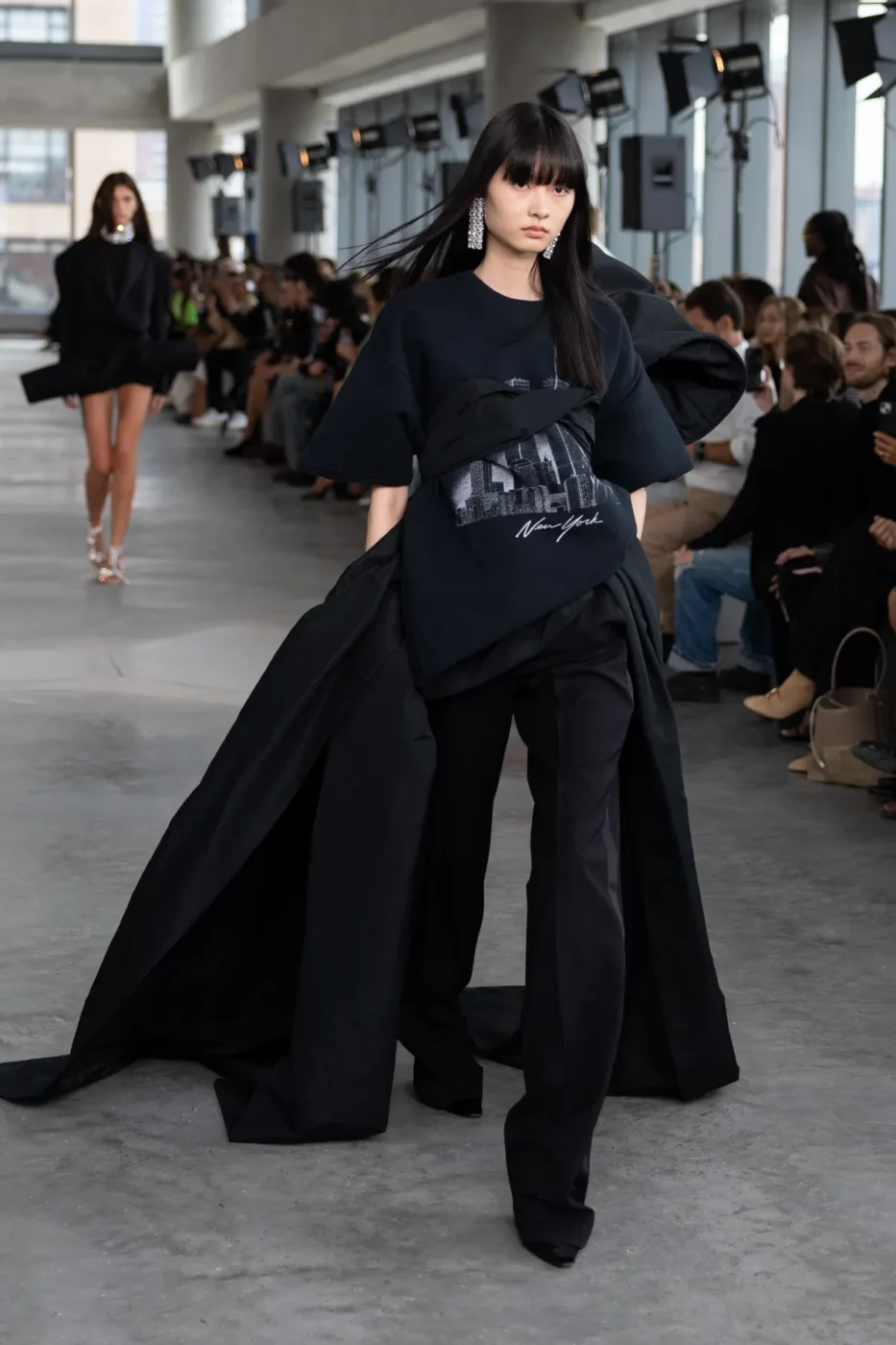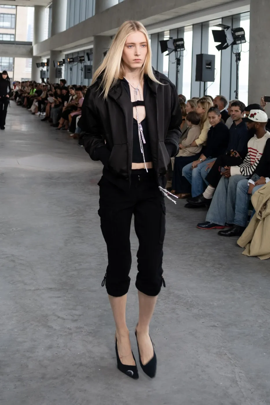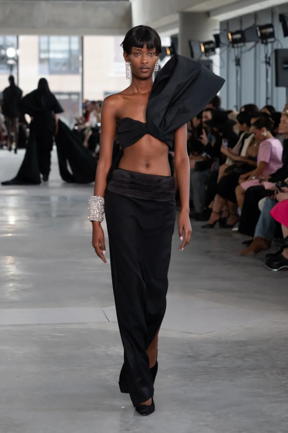 Aburn nie ogranicza się do metafor – kolekcja jest pełna wyrazistych, namacalnych sylwetek. Pierwszy look to czarna satynowa bluza z kapturem zestawiona z cargo capri, mieszanka sportowego luzu i miejskiego dramatyzmu. Dalej pojawiają się mini spódnice – denimowe, asymetryczne, konstruowane z nogawek jeansów zawiązanych w kokardy, a także wersje z taffety łączone z dopasowanymi golfami. Na wybiegu oglądamy także oversize’owe marynarki z szerokimi ramionami, zestawione z jeansami albo spodniami wieczorowymi – tailoring, który nie boi się dekonstrukcji. Wśród mocniejszych punktów są też bodysuity wysadzane kryształami i sukienki typu slip noszone na odwrót. Transparentność gra tu kluczową rolę, odsłaniając ciało i nadając mu blask.