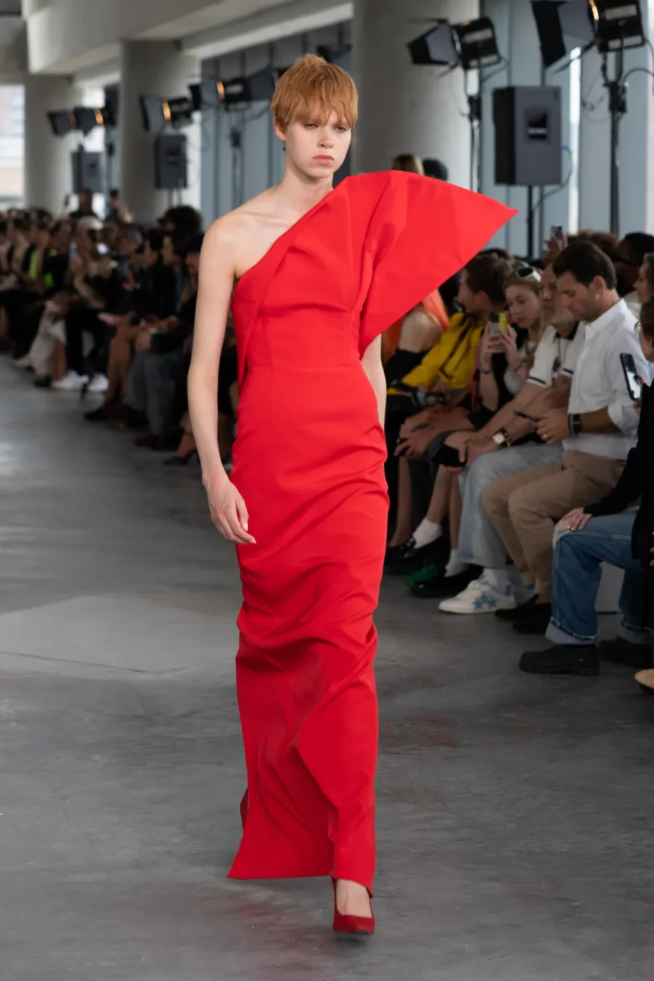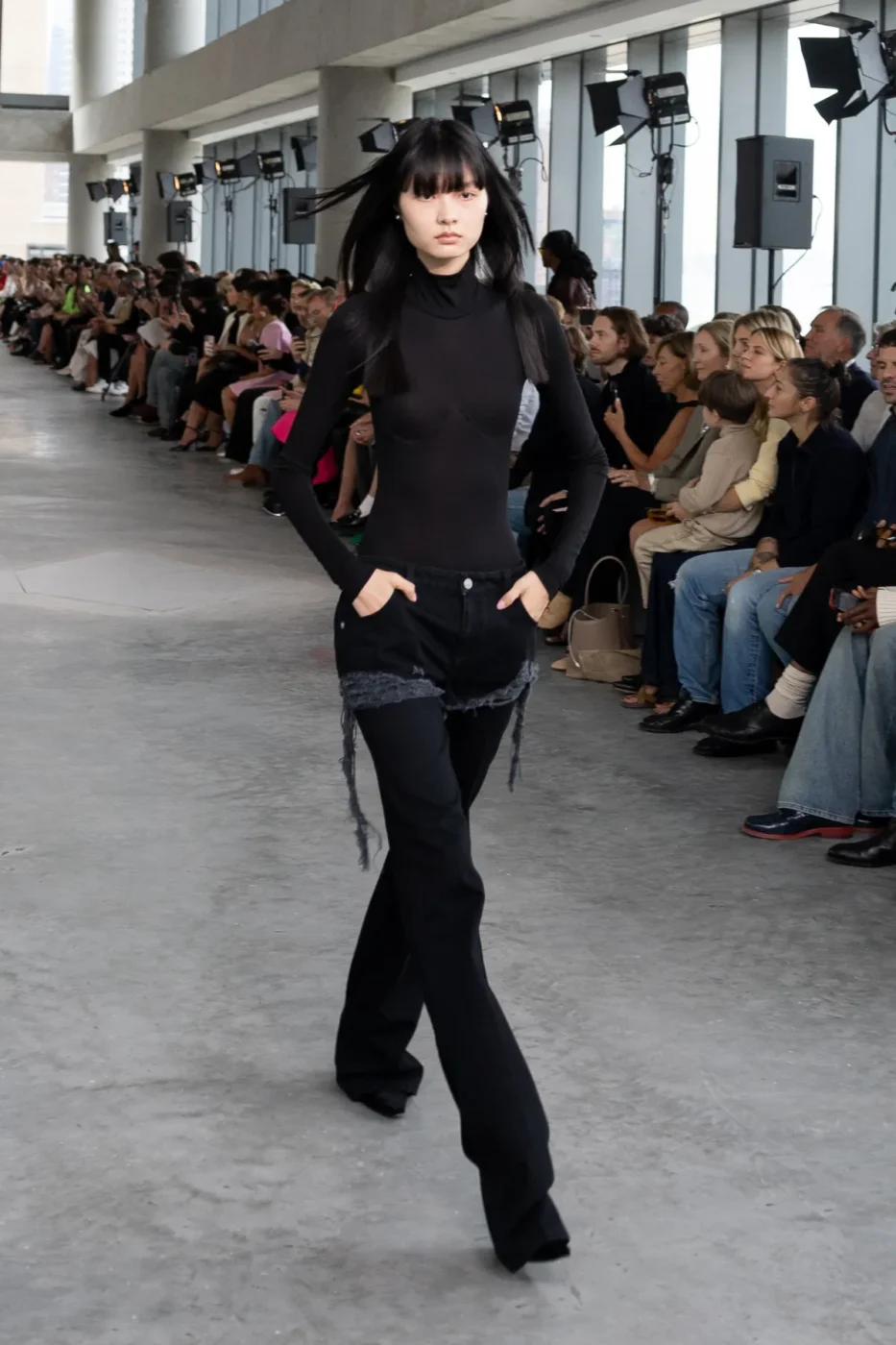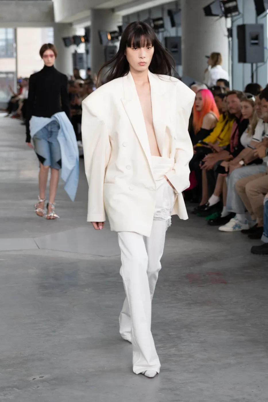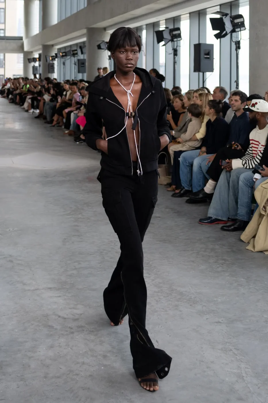 Aburn nie ogranicza się do metafor – kolekcja jest pełna wyrazistych, namacalnych sylwetek. Pierwszy look to czarna satynowa bluza z kapturem zestawiona z cargo capri, mieszanka sportowego luzu i miejskiego dramatyzmu. Dalej pojawiają się mini spódnice – denimowe, asymetryczne, konstruowane z nogawek jeansów zawiązanych w kokardy, a także wersje z taffety łączone z dopasowanymi golfami. Na wybiegu oglądamy także oversize’owe marynarki z szerokimi ramionami, zestawione z jeansami albo spodniami wieczorowymi – tailoring, który nie boi się dekonstrukcji. Wśród mocniejszych punktów są też bodysuity wysadzane kryształami i sukienki typu slip noszone na odwrót. Transparentność gra tu kluczową rolę, odsłaniając ciało i nadając mu blask.