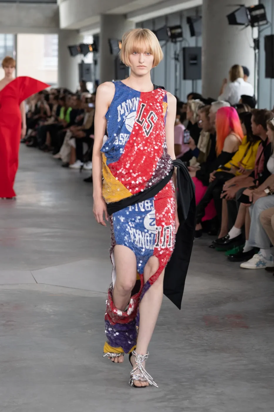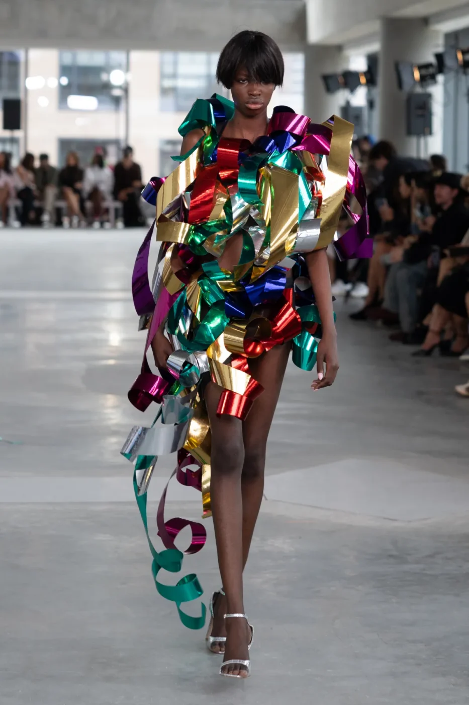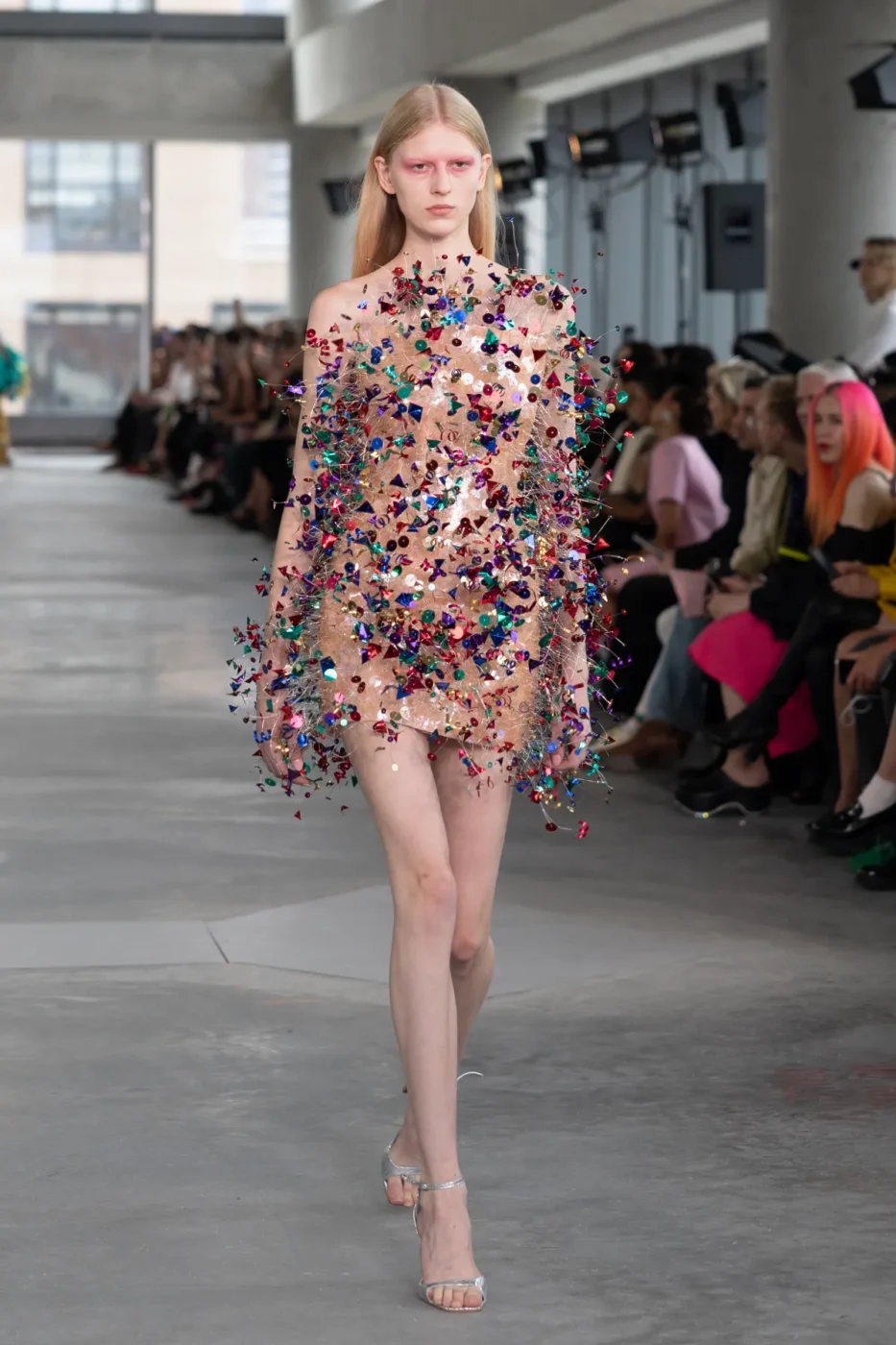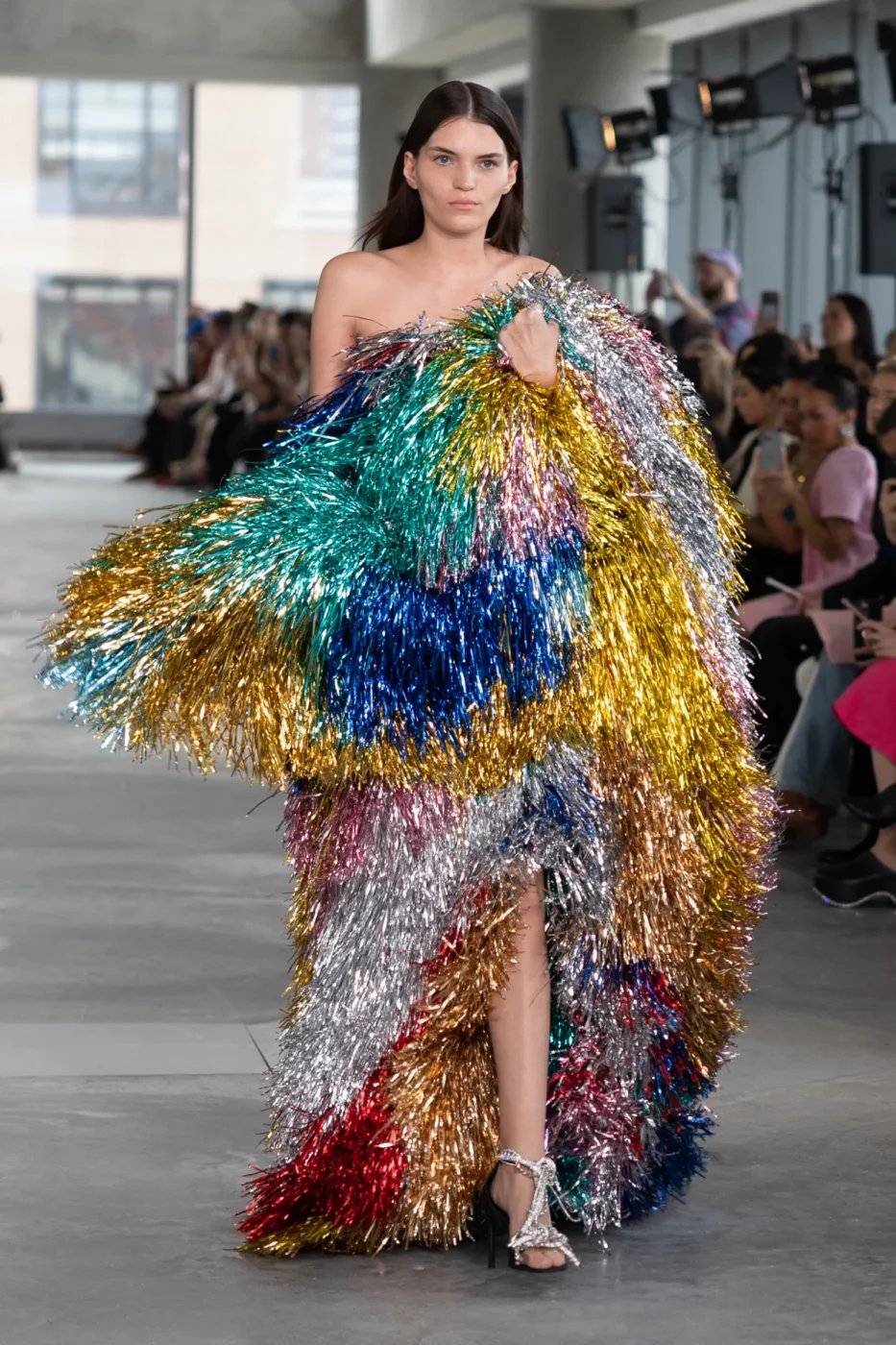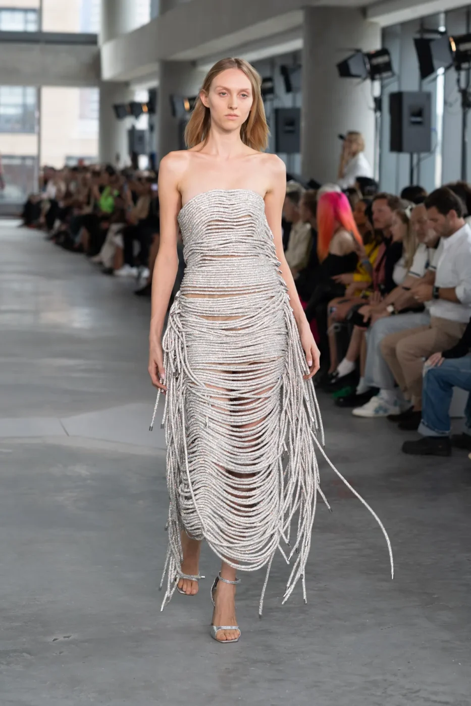 Sportowy luz Aburn zamienia w glam – sportowe obcisłe szorty, crop topy, satynowe bluzy pojawiają się w wersjach zdobionych błyszczącymi detalami. To AREA, które da się nosić na co dzień, ale wciąż ma klubowy charakter. Kulminacją pokazu są kreacje wieczorowe – sukienki w całości pokryte cekinami, konfetti i wstążkami, frędzle i boa poruszające się w rytm kroków. To sylwetki, które zamieniają modelki w chodzące fajerwerki. Na końcu pojawia się zaskakująca sylwetka: spódnica maxi zestawiona z kolorowymi frędzlami i bluzą, miks elegancji i ulicznego stylu, wyrazista odpowiedź na pytanie, czy można jednocześnie być szaloną jak i… elegancką.