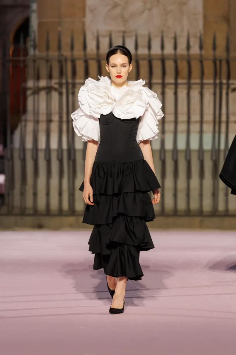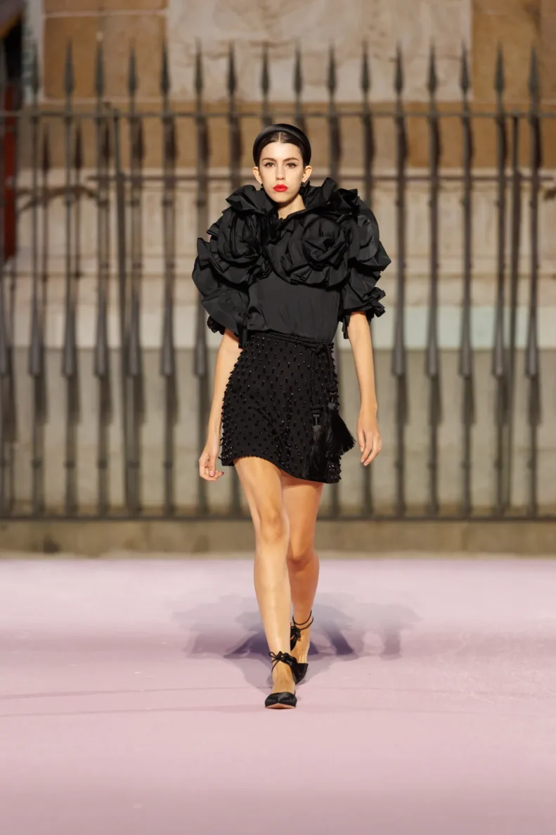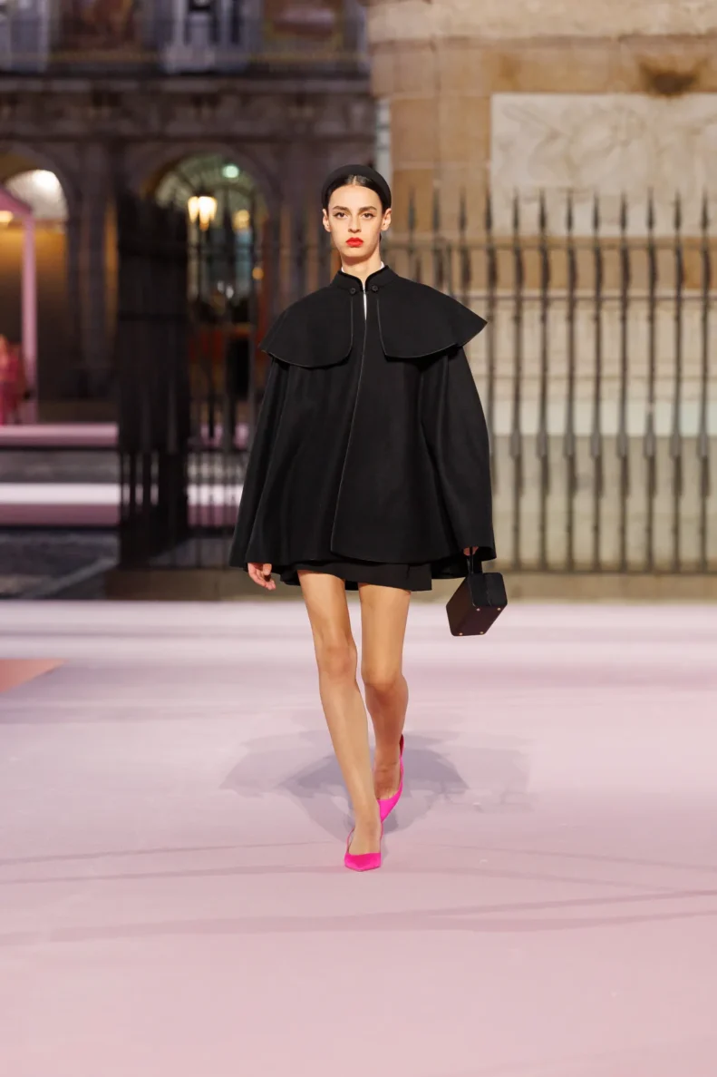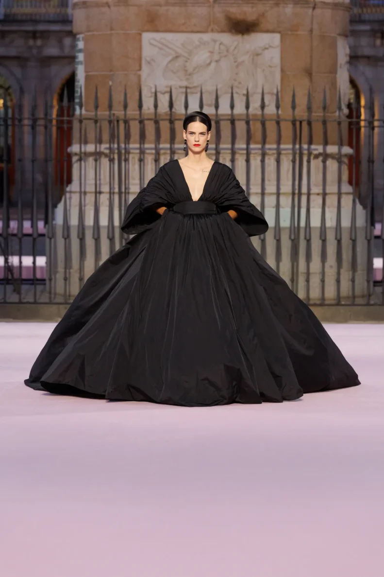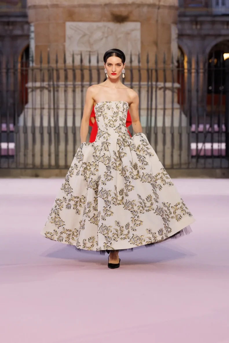 Projektant bawi się odniesieniami do hiszpańskiej tradycji. Trapezowe płaszcze przywodzą na myśl montera – czapkę torreadorów, wąskie spodnie nawiązują do goyesco, a bufiaste rękawy i falbanki przypominają stroje chulapas. Polka dots, czyli słynne kropki Herrery, dostały nowe życie w rzeźbiarskich sukienkach i dziennych sylwetkach. Całość uzupełniają faktury: złocony żakard, koronkowe obszycia i wełna w kratę, która imituje bruk Plaza Mayor.