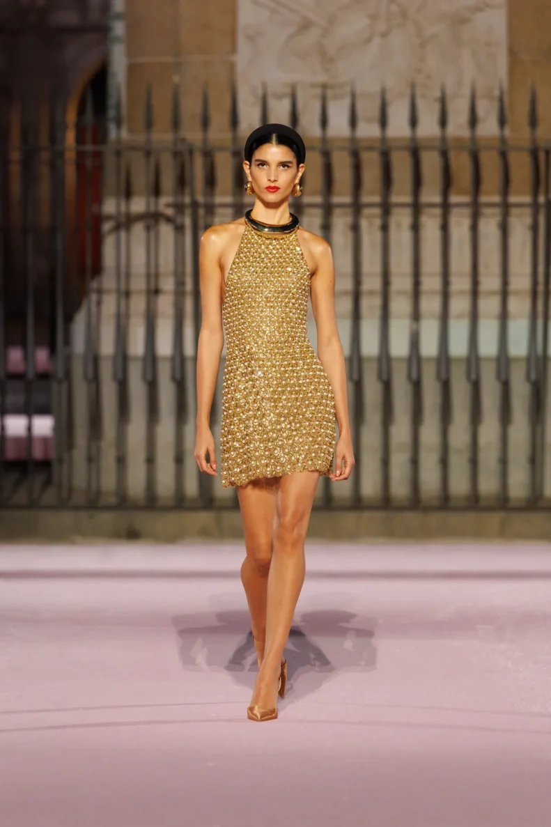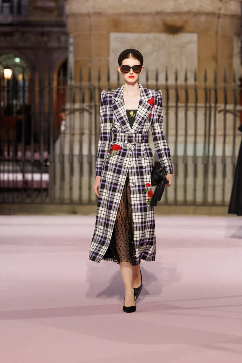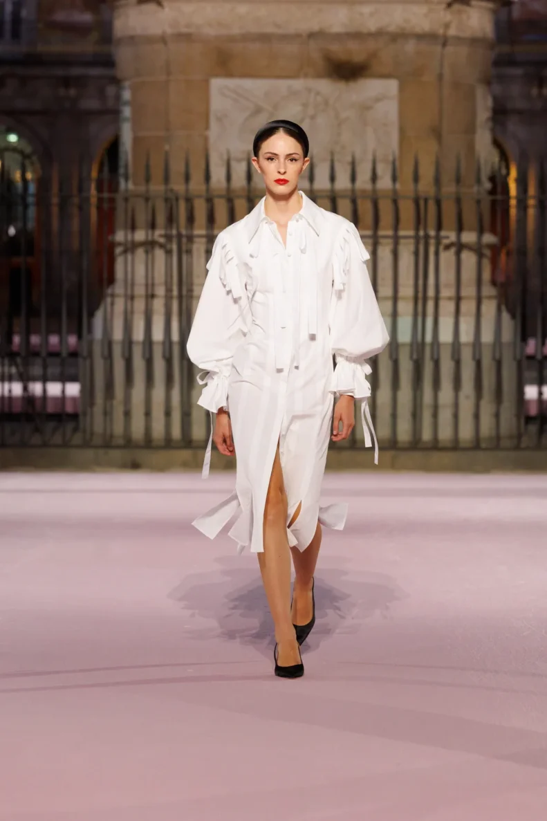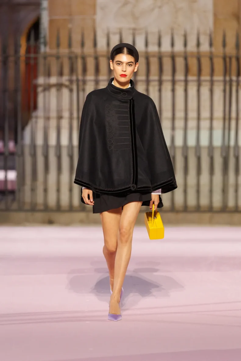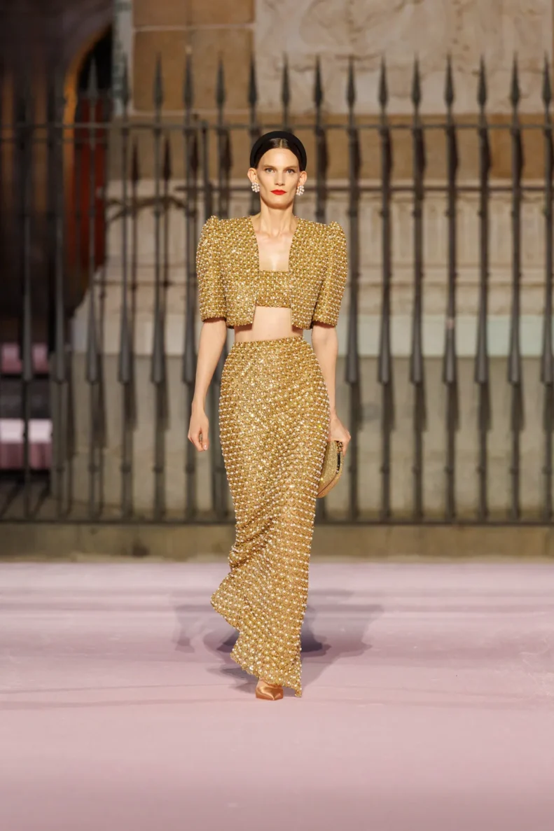 Projektant bawi się odniesieniami do hiszpańskiej tradycji. Trapezowe płaszcze przywodzą na myśl montera – czapkę torreadorów, wąskie spodnie nawiązują do goyesco, a bufiaste rękawy i falbanki przypominają stroje chulapas. Polka dots, czyli słynne kropki Herrery, dostały nowe życie w rzeźbiarskich sukienkach i dziennych sylwetkach. Całość uzupełniają faktury: złocony żakard, koronkowe obszycia i wełna w kratę, która imituje bruk Plaza Mayor.