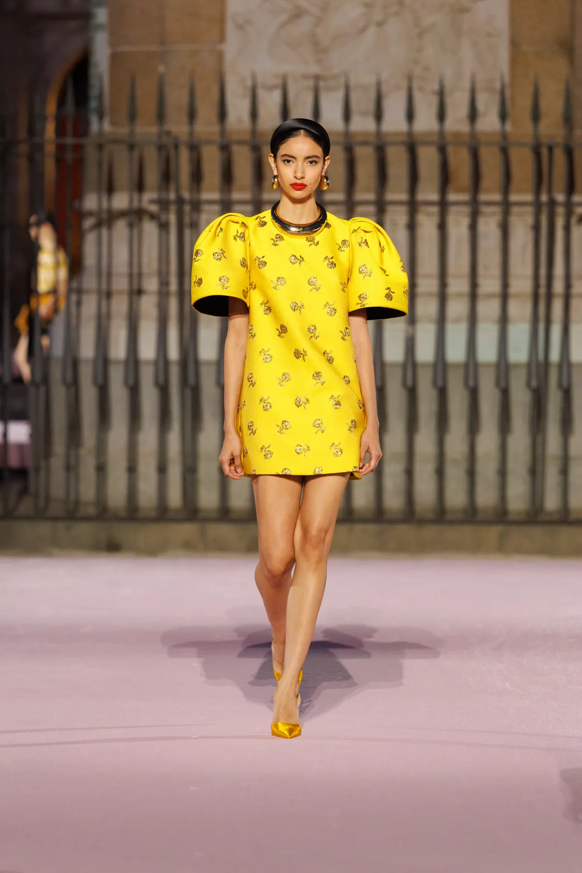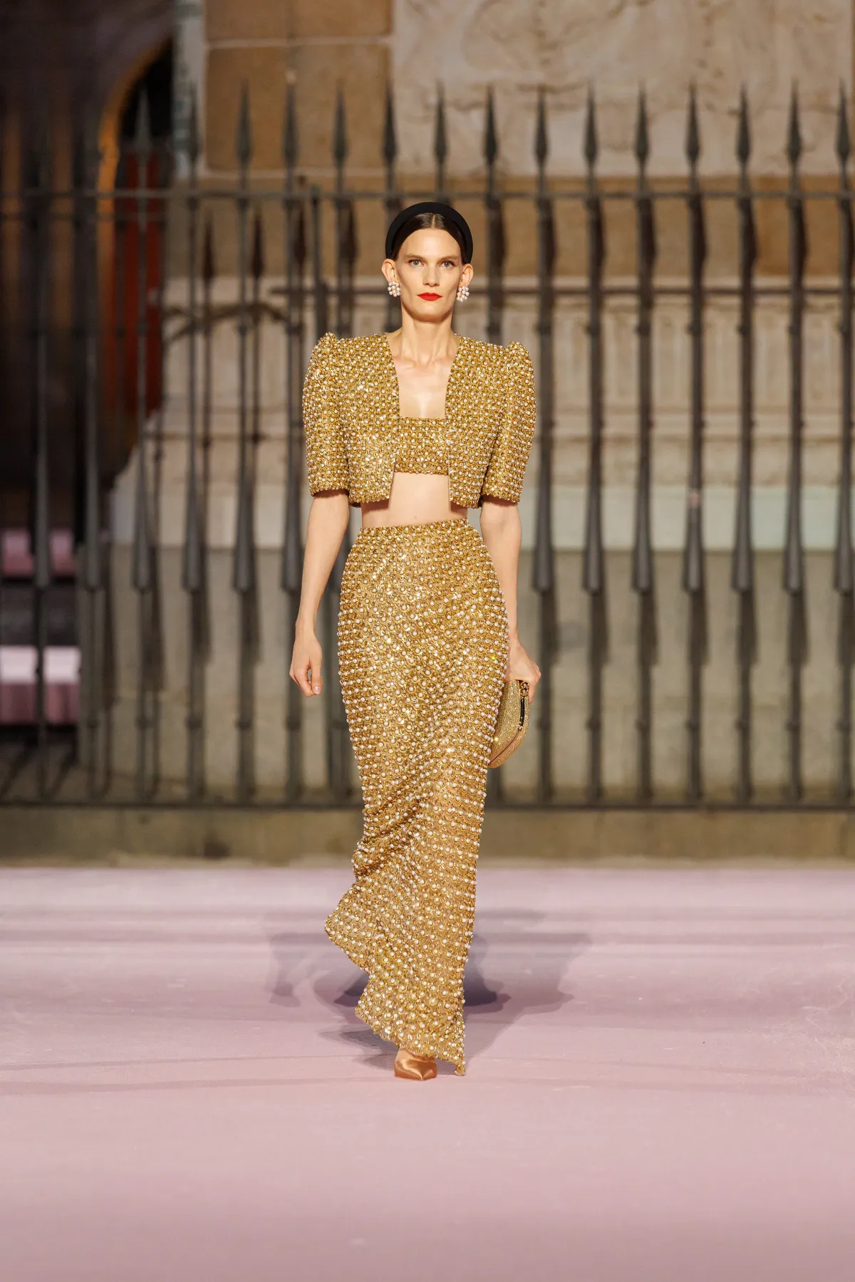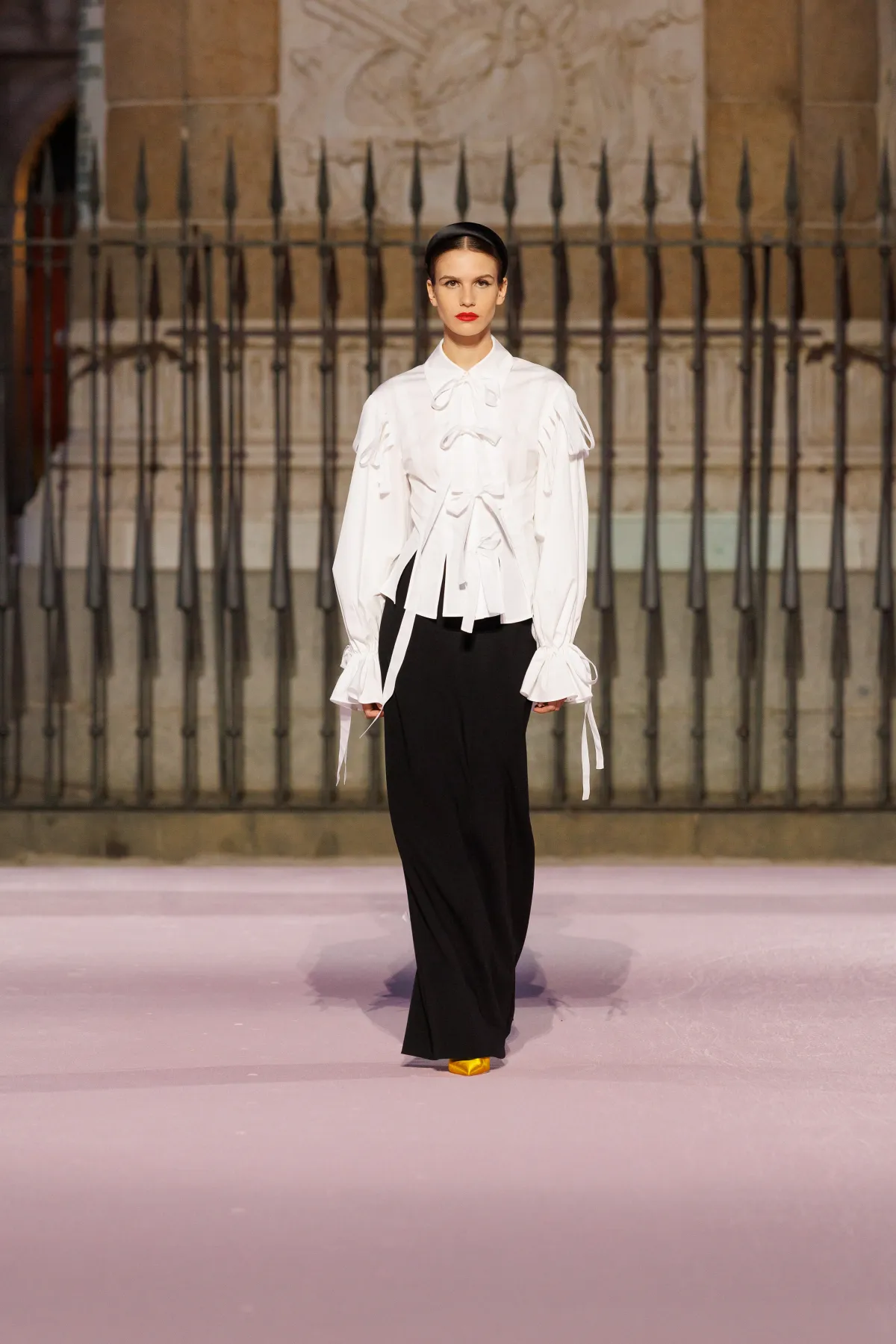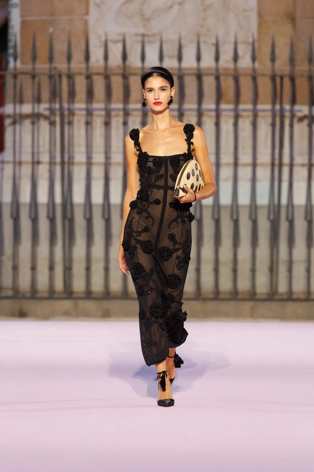 Projektant bawi się odniesieniami do hiszpańskiej tradycji. Trapezowe płaszcze przywodzą na myśl montera – czapkę torreadorów, wąskie spodnie nawiązują do goyesco, a bufiaste rękawy i falbanki przypominają stroje chulapas. Polka dots, czyli słynne kropki Herrery, dostały nowe życie w rzeźbiarskich sukienkach i dziennych sylwetkach. Całość uzupełniają faktury: złocony żakard, koronkowe obszycia i wełna w kratę, która imituje bruk Plaza Mayor.