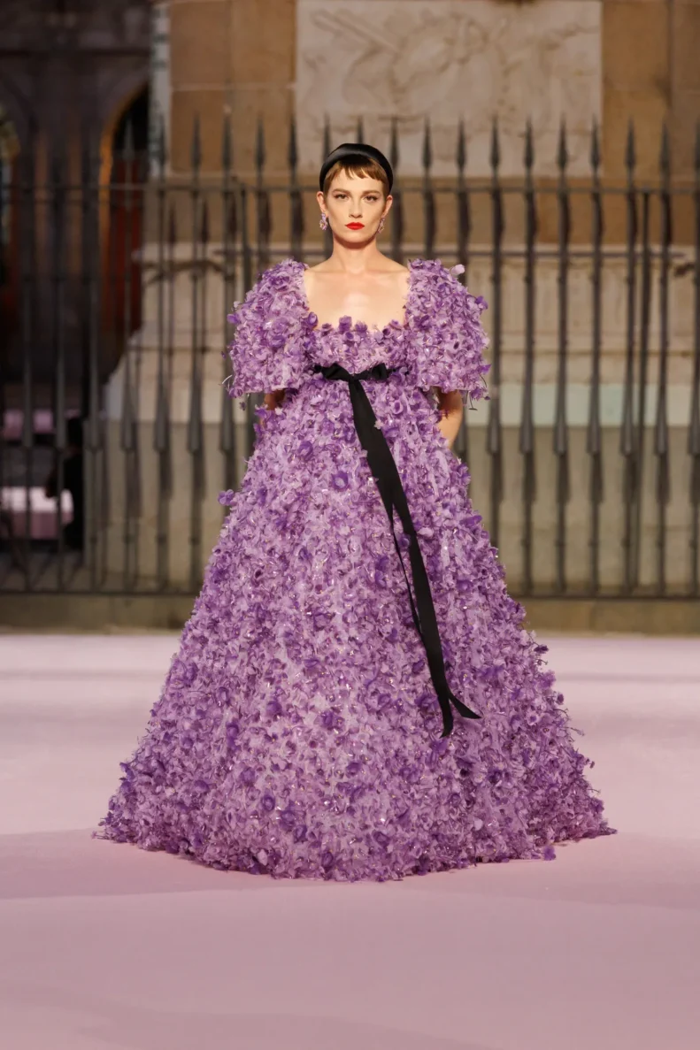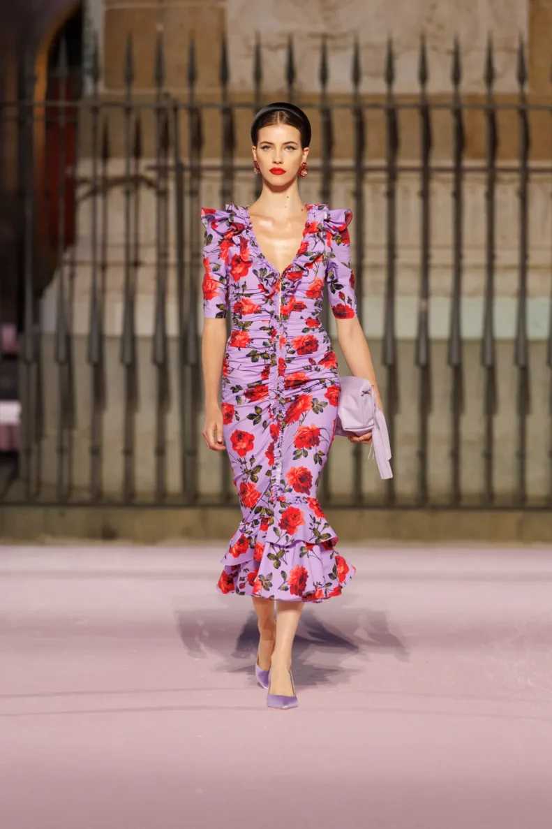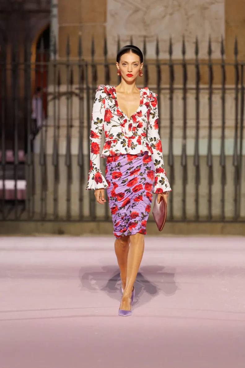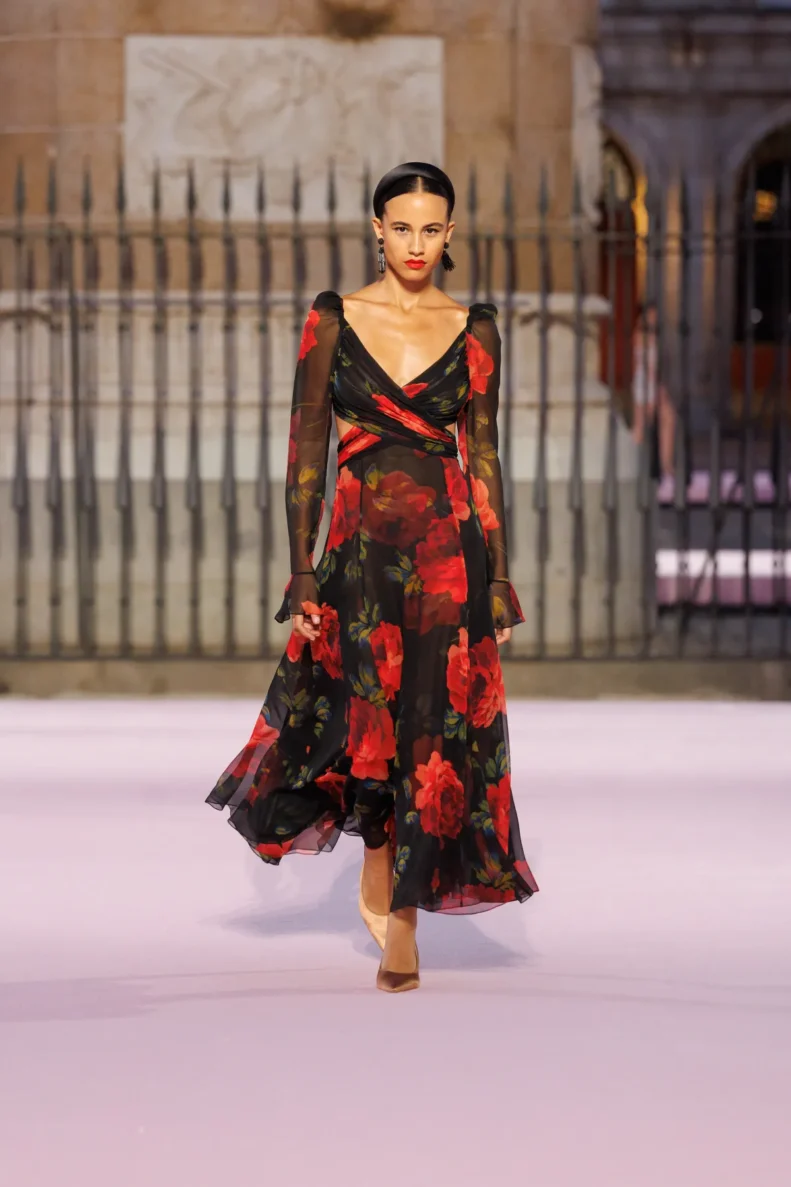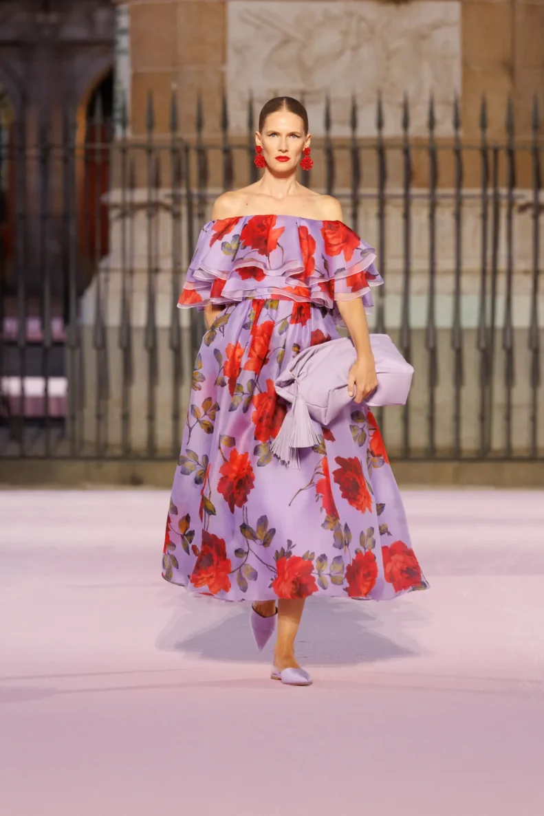 Paleta barw to prawdziwy teatr emocji – od szafranu, Herrera red i głębokiego Rioja, przez soczysty róż i fiolet, po biel i czerń. To zestawienia rodem z filmów Pedro Almodóvara, gdzie nieoczywiste połączenia wywołują niepokój i ekscytację. W centrum kolekcji znalazły się kwiaty – goździk, fiołek i róża z Retiro – każdy wpisany w tkaniny, hafty i trójwymiarowe aplikacje. To nie są przypadkowe wybory, ale symbole Madrytu, które Wes Gordon zamienił w kody elegancji.