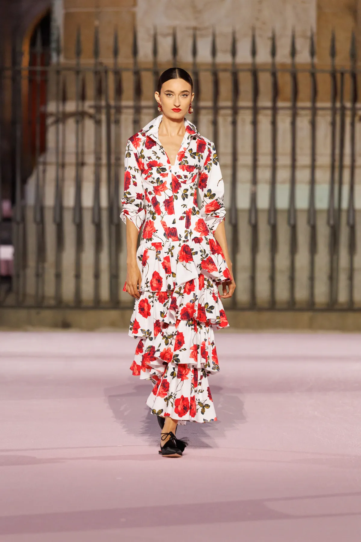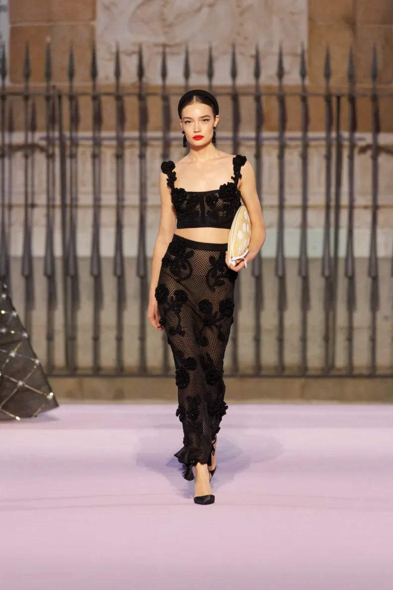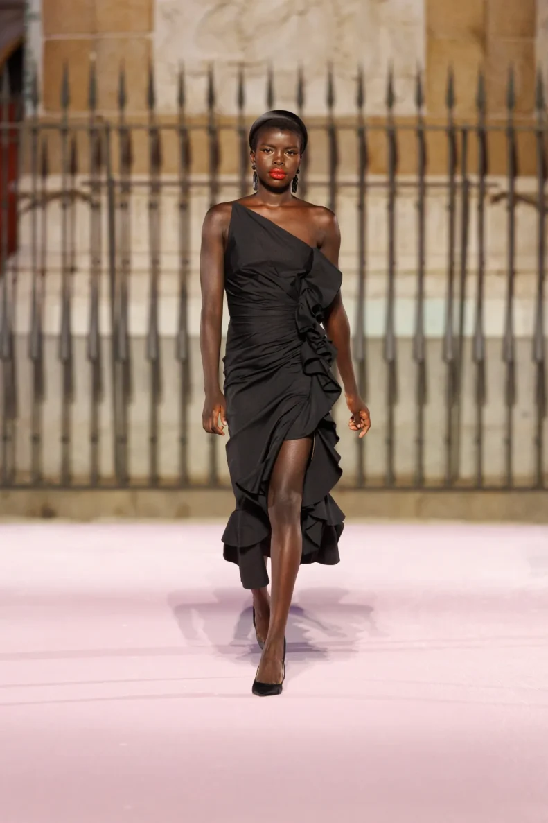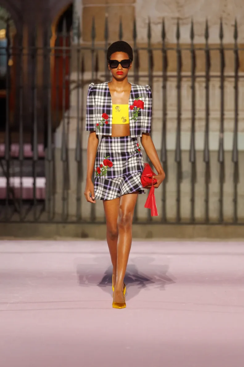 Paleta barw to prawdziwy teatr emocji – od szafranu, Herrera red i głębokiego Rioja, przez soczysty róż i fiolet, po biel i czerń. To zestawienia rodem z filmów Pedro Almodóvara, gdzie nieoczywiste połączenia wywołują niepokój i ekscytację. W centrum kolekcji znalazły się kwiaty – goździk, fiołek i róża z Retiro – każdy wpisany w tkaniny, hafty i trójwymiarowe aplikacje. To nie są przypadkowe wybory, ale symbole Madrytu, które Wes Gordon zamienił w kody elegancji.