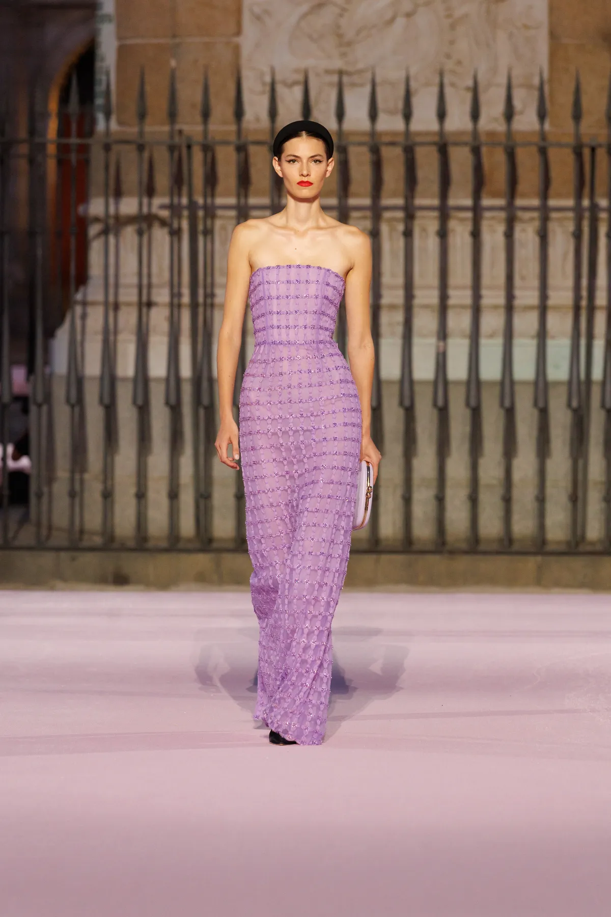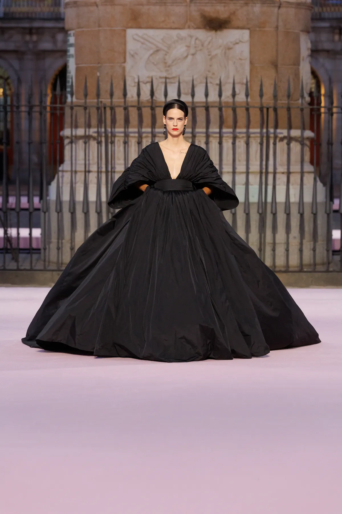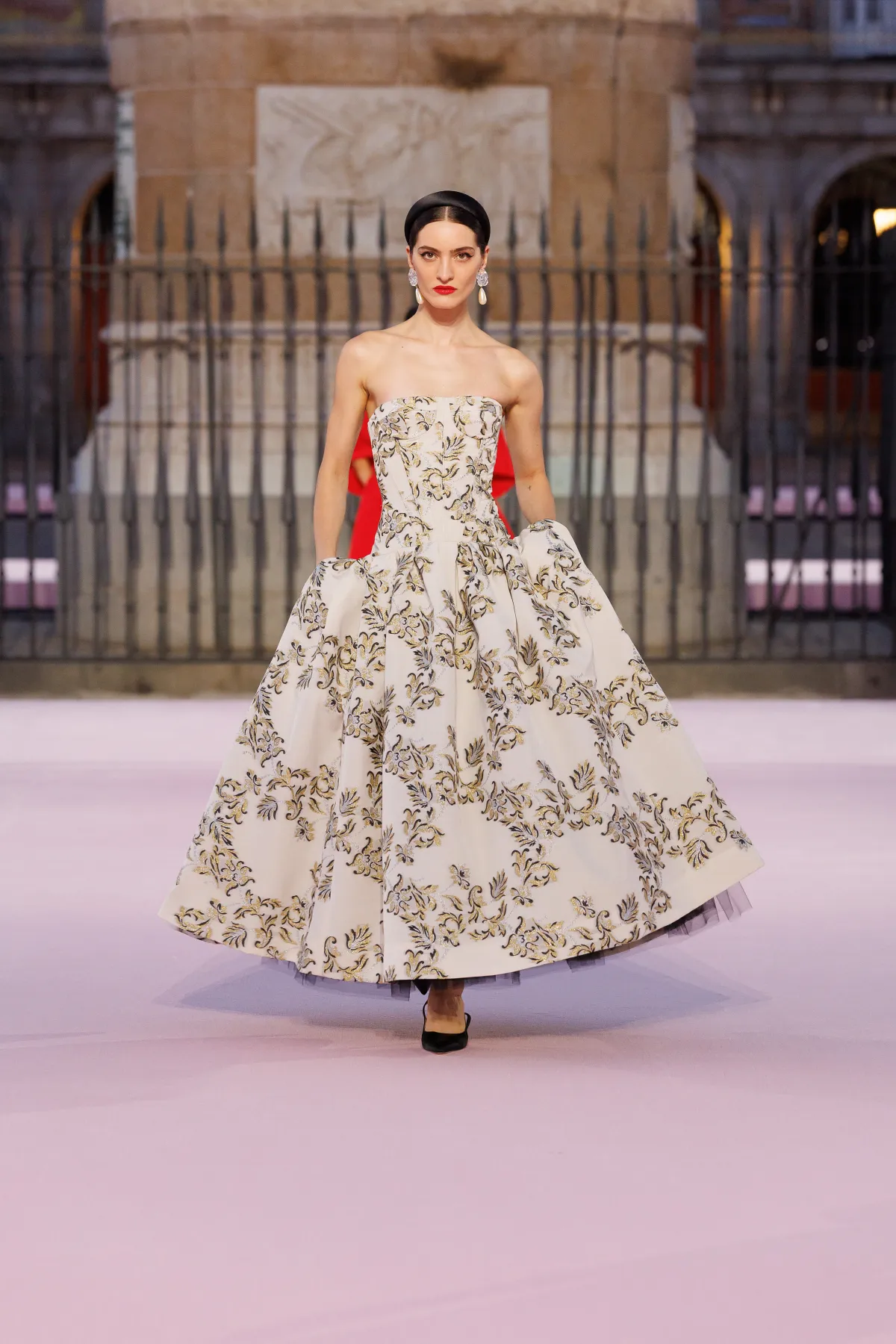Carolina Herrera po raz pierwszy w historii zdecydowała się na pokaz głównej kolekcji poza Nowym Jorkiem – i to w jakim miejscu! Plaza Mayor w Madrycie stała się sceną dla wiosenno-letnich propozycji na 2026 rok. Wes Gordon, dyrektor kreatywny domu mody, postawił na opowieść o mieście, w którym łączy się barokowa przeszłość i wywrotowy duch lat 80., czyli czasów, kiedy powstała marka. To właśnie zderzenie historii i współczesności stworzyło pełen życia pokaz, który można czytać jak list miłosny do Madrytu.