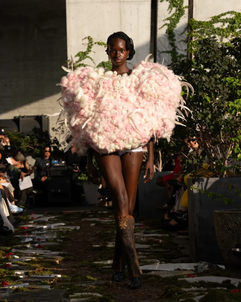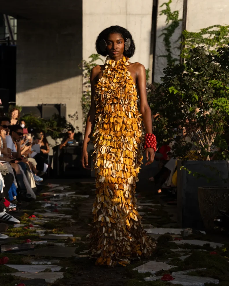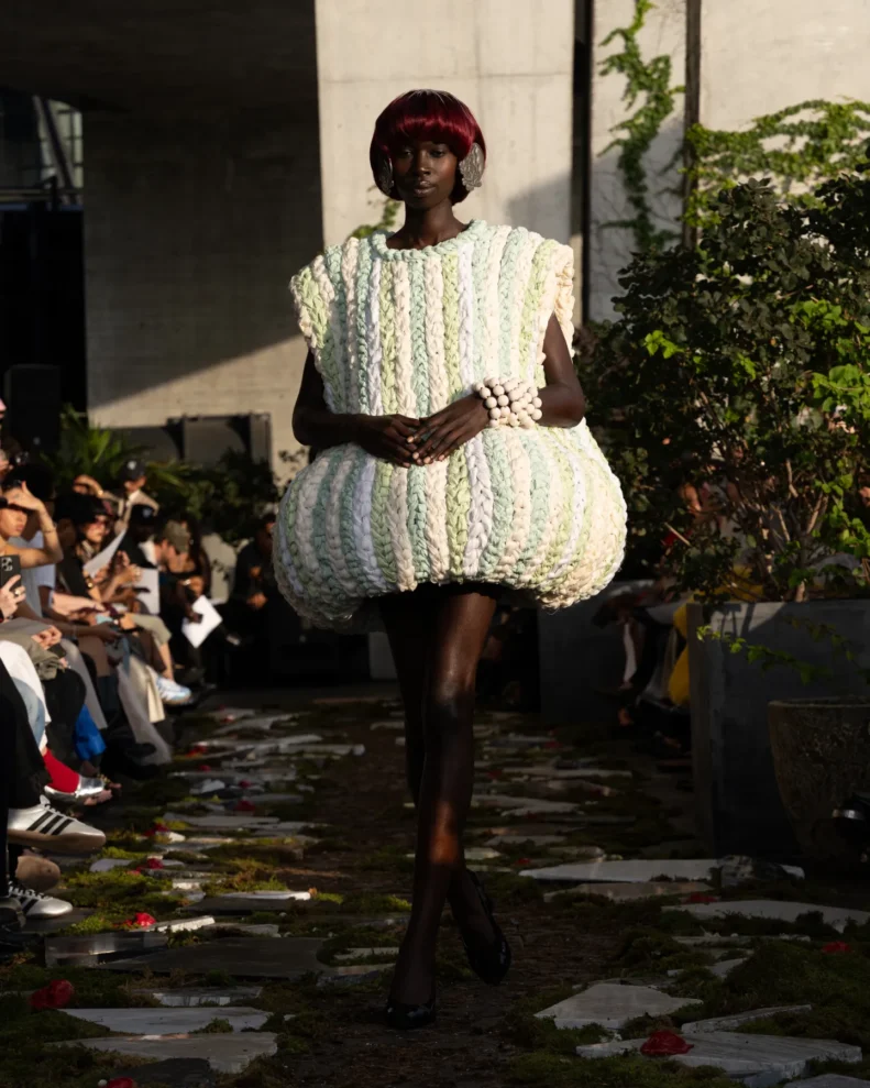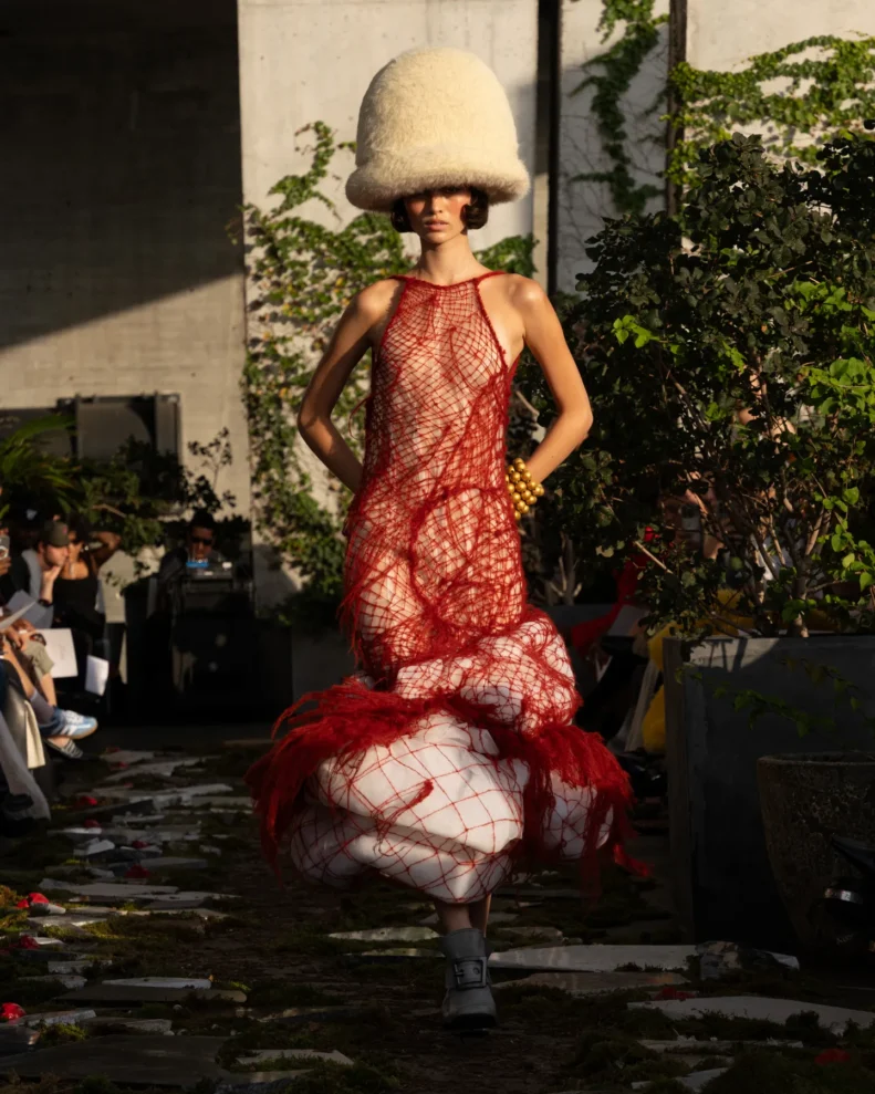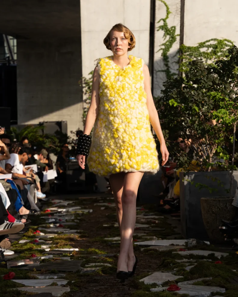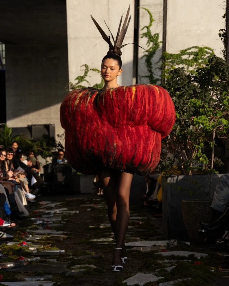 W świecie, który często nagradza cynizm, Pipenco stawia na coś zupełnie innego – szczerość i dziecięcą wiarę w piękno. Jej kolekcja Wiosna-Lato 2026, zatytułowana „Lalele. A Naive Hero’s Journey”, to właśnie taka alternatywna odpowiedź na presję branży. Projekty balansują między miękkością a pancerzem. Z jednej strony mamy ręcznie filcowane pasy i powiększone struktury makramy, które nadają sylwetkom baśniowy ciężar, z drugiej – zwiewność i subtelność. Najbardziej zaskakujący element to suknia z… dziewięciuset cytrynowych skórek. Moda Pipenco to nie tylko forma, ale też opowieść i zabawa materią.