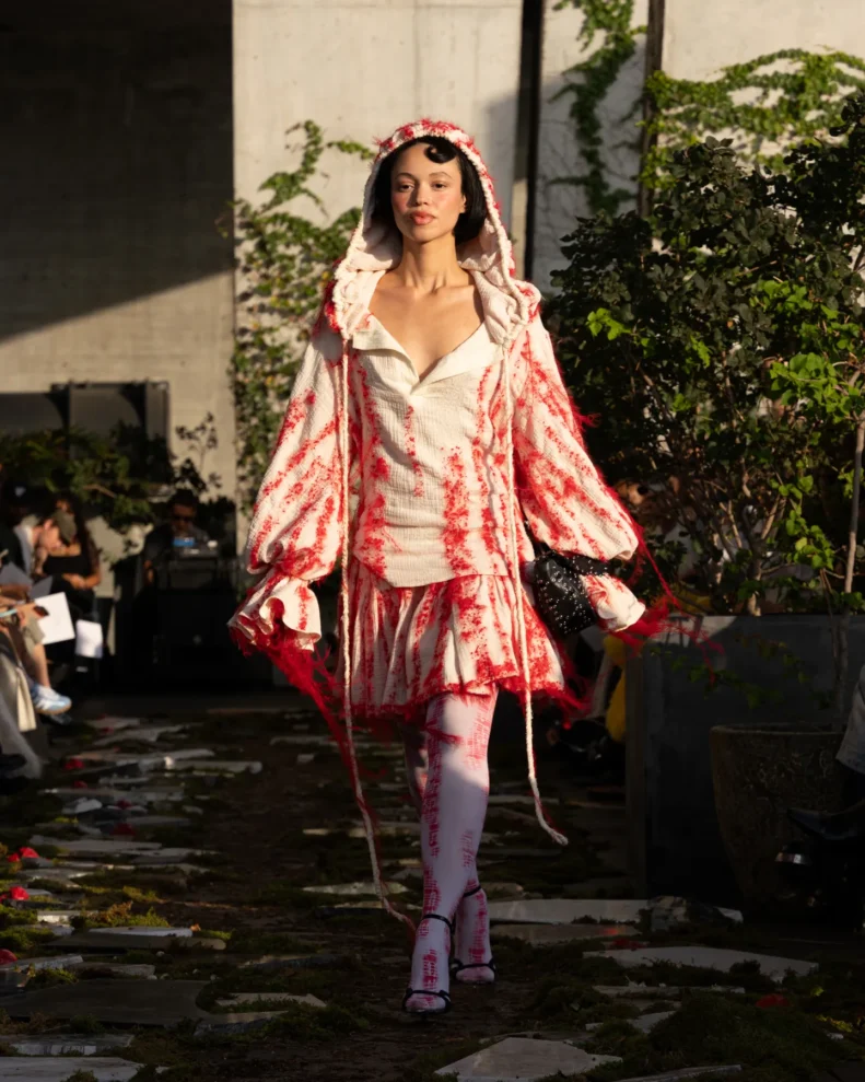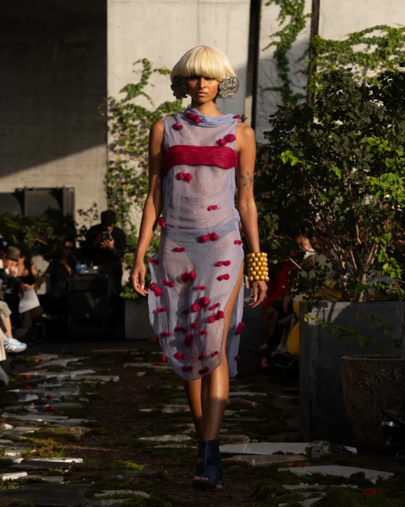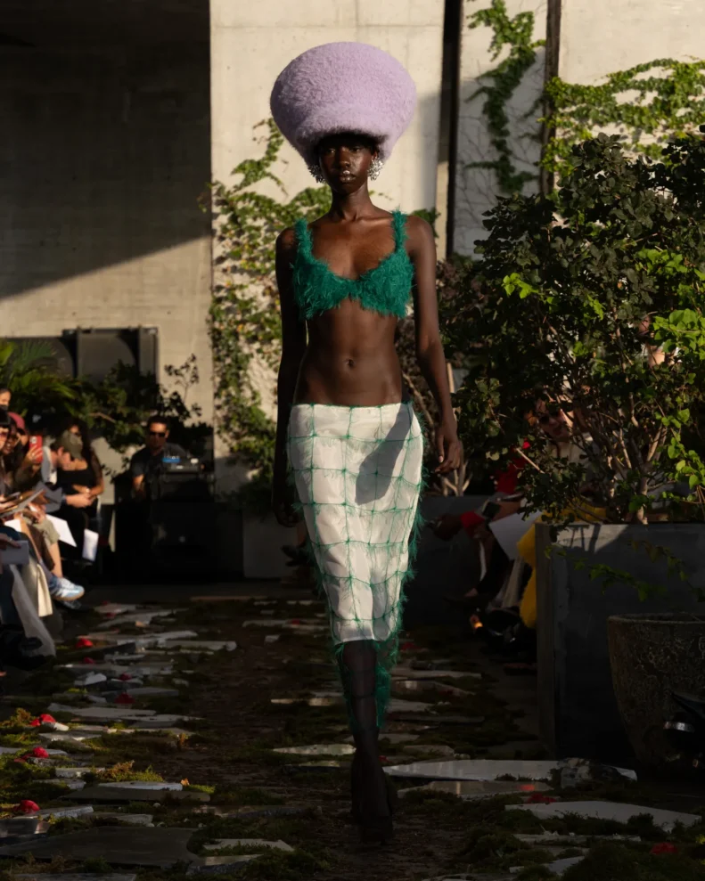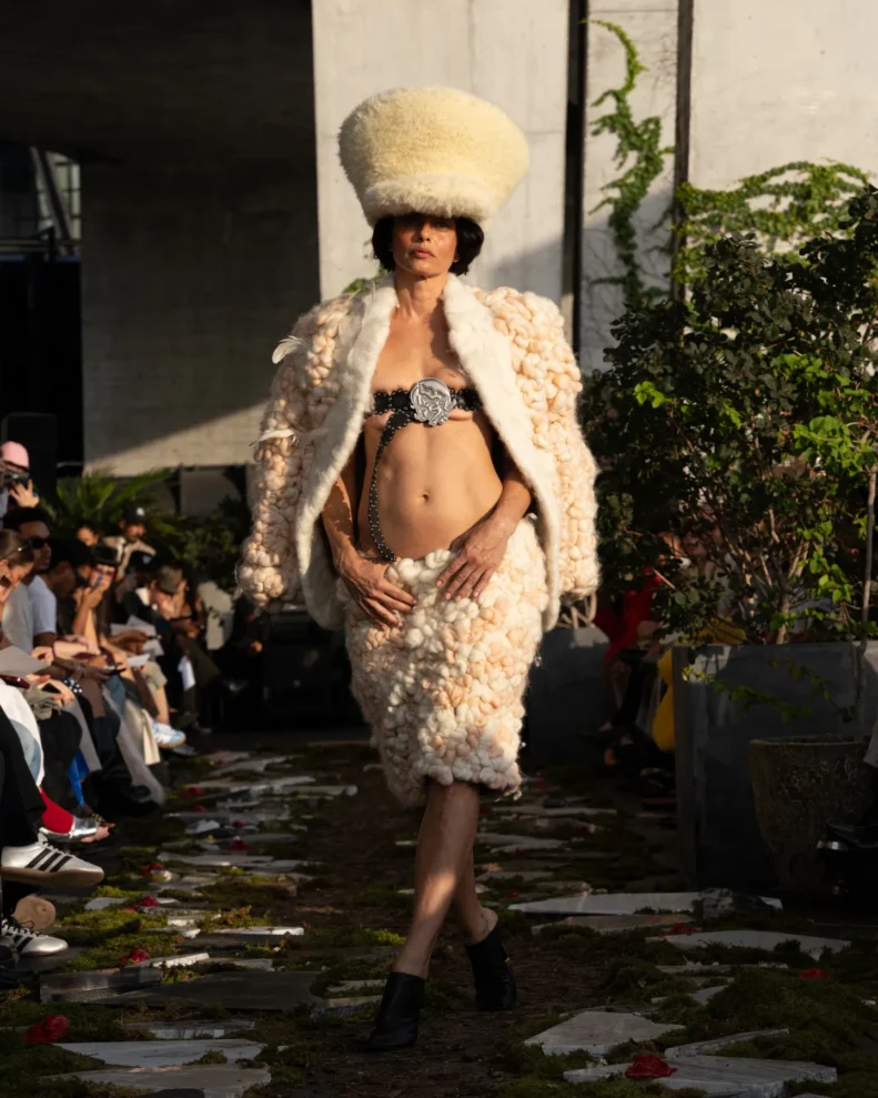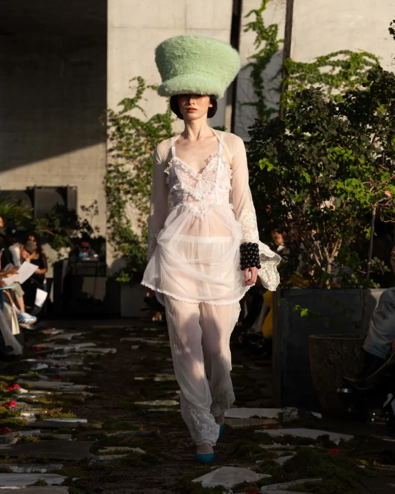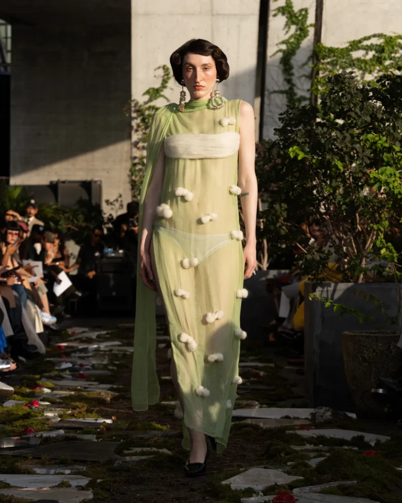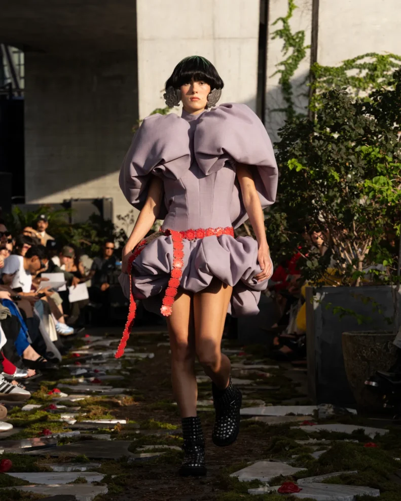 W świecie, który często nagradza cynizm, Pipenco stawia na coś zupełnie innego – szczerość i dziecięcą wiarę w piękno. Jej kolekcja Wiosna-Lato 2026, zatytułowana „Lalele. A Naive Hero’s Journey”, to właśnie taka alternatywna odpowiedź na presję branży. Projekty balansują między miękkością a pancerzem. Z jednej strony mamy ręcznie filcowane pasy i powiększone struktury makramy, które nadają sylwetkom baśniowy ciężar, z drugiej – zwiewność i subtelność. Najbardziej zaskakujący element to suknia z… dziewięciuset cytrynowych skórek. Moda Pipenco to nie tylko forma, ale też opowieść i zabawa materią.