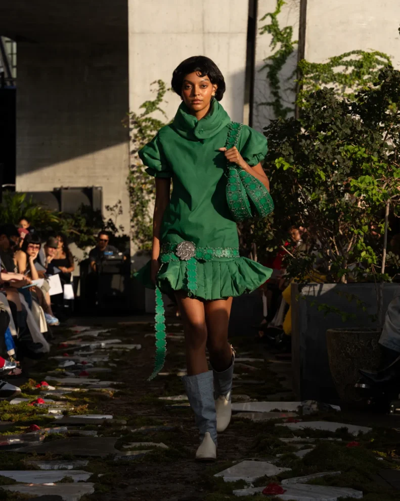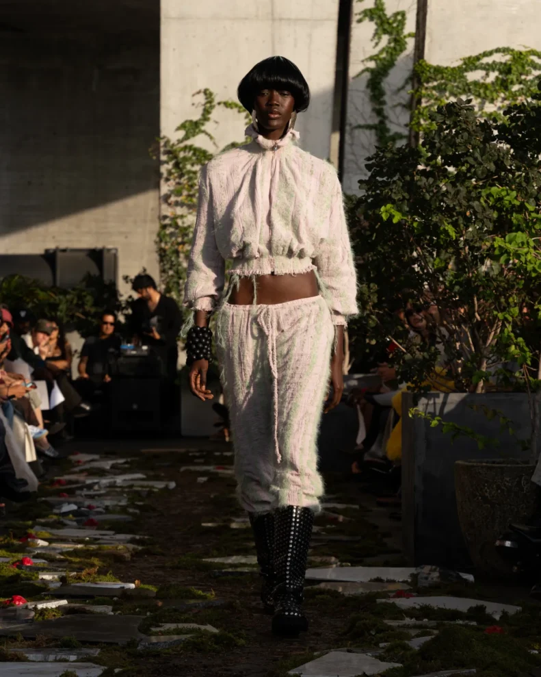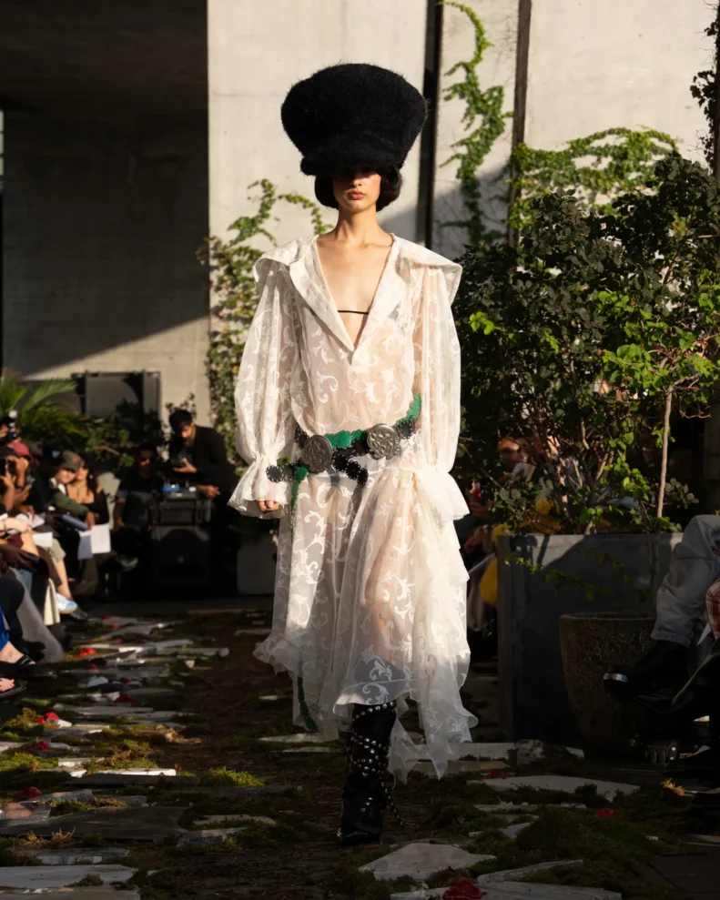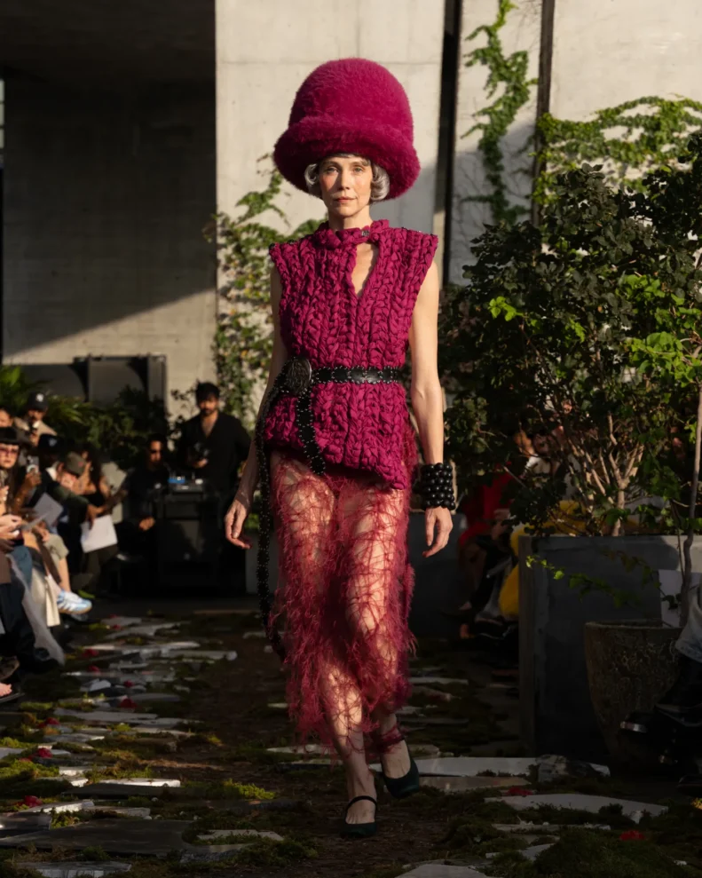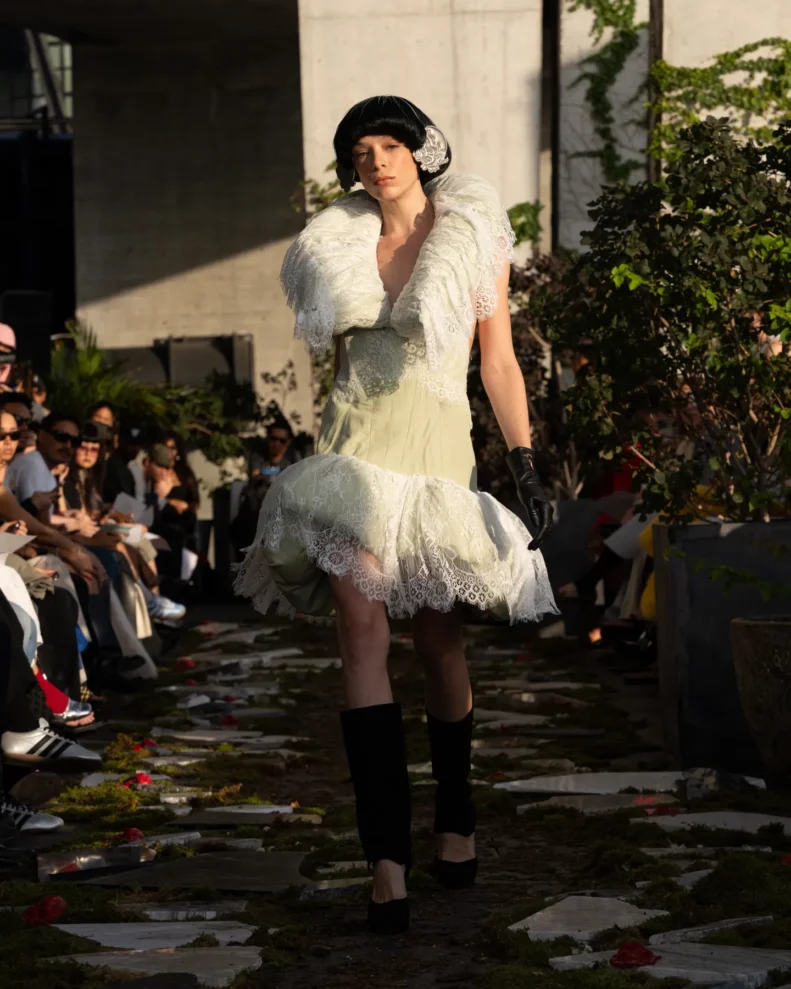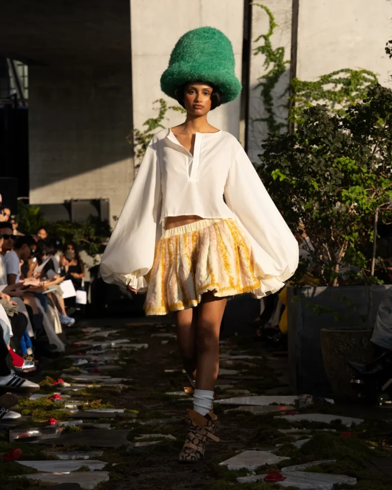 W świecie, który często nagradza cynizm, Pipenco stawia na coś zupełnie innego – szczerość i dziecięcą wiarę w piękno. Jej kolekcja Wiosna-Lato 2026, zatytułowana „Lalele. A Naive Hero’s Journey”, to właśnie taka alternatywna odpowiedź na presję branży. Projekty balansują między miękkością a pancerzem. Z jednej strony mamy ręcznie filcowane pasy i powiększone struktury makramy, które nadają sylwetkom baśniowy ciężar, z drugiej – zwiewność i subtelność. Najbardziej zaskakujący element to suknia z… dziewięciuset cytrynowych skórek. Moda Pipenco to nie tylko forma, ale też opowieść i zabawa materią.