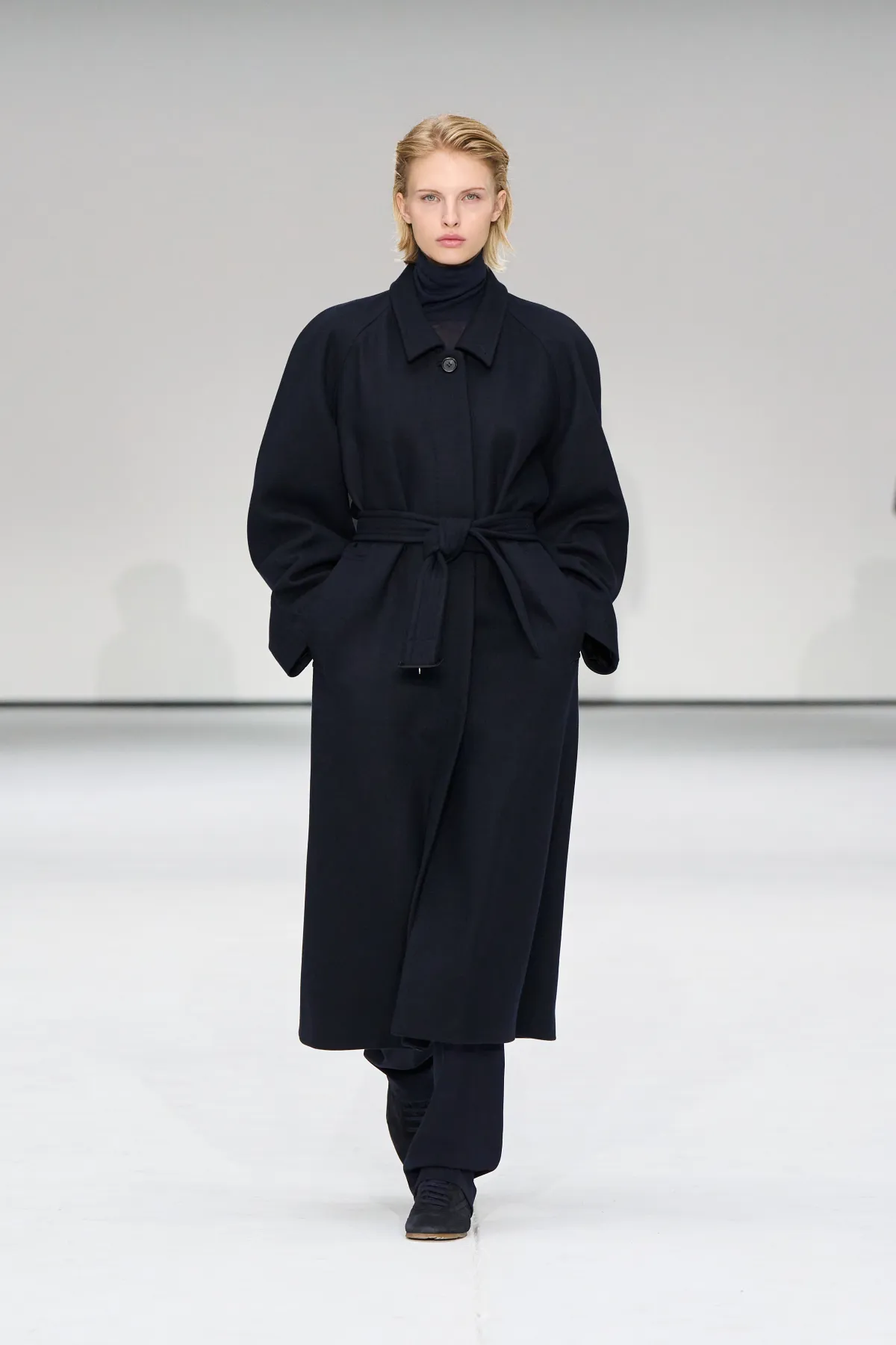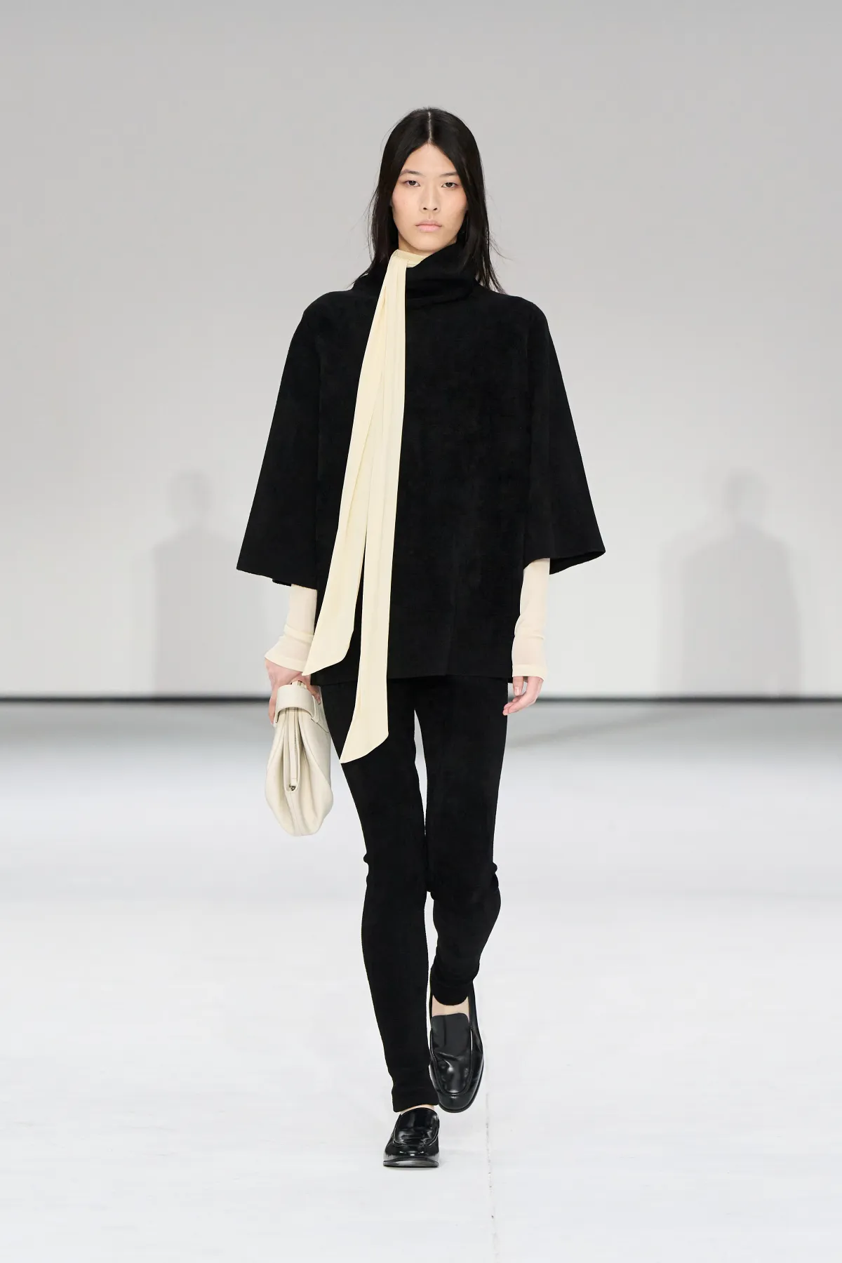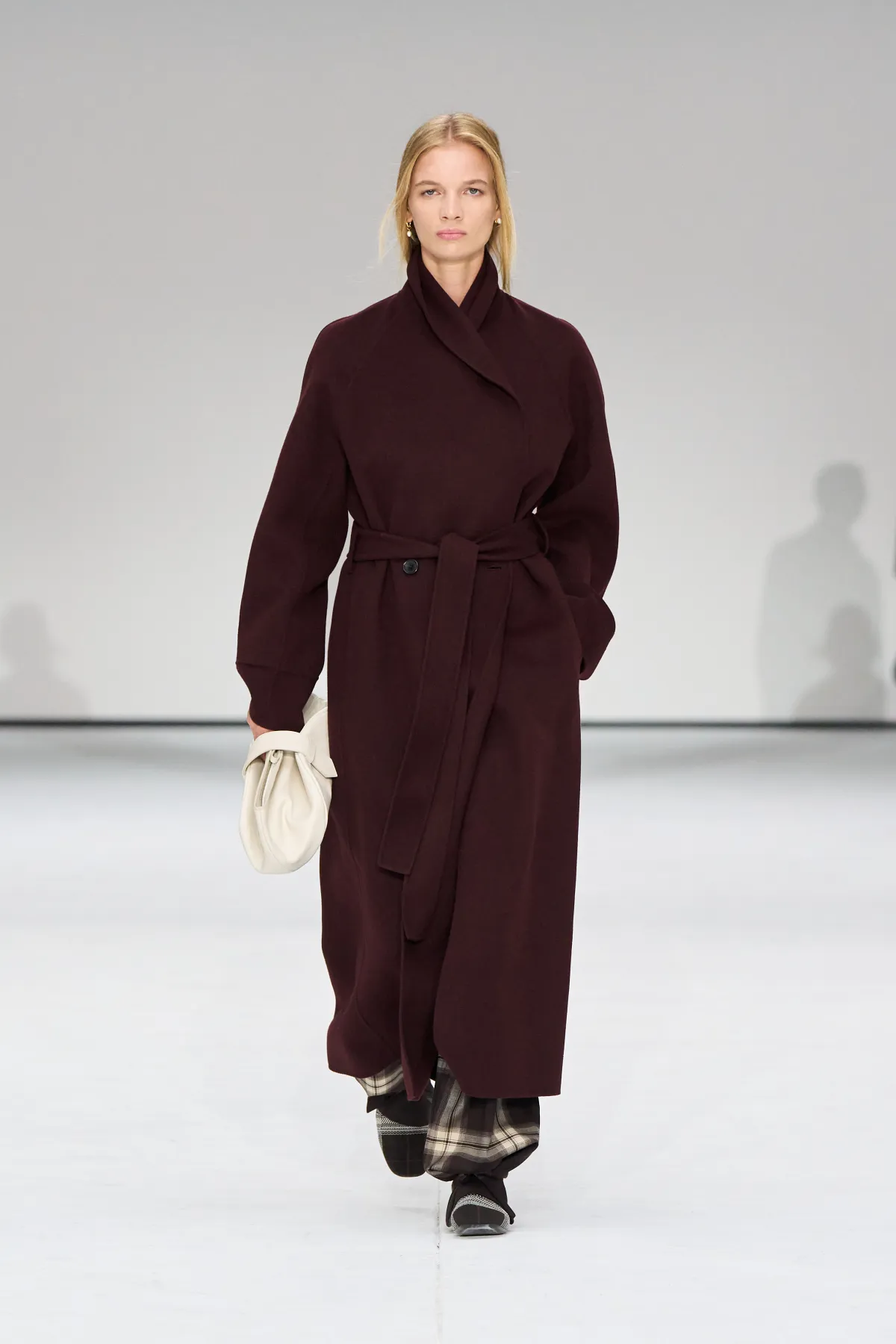 Damskie sylwetki COS to zabawa proporcjami. Cocooningowe płaszcze, szerokie szale i rzeźbiarskie draperie kontrastowały z podkreśloną talią i dekoltami inspirowanymi stylem lat 50. Najmocniejszym akcentem była jedwabna sukienka, dająca wiele możliwości stylizacji – idealny przykład połączenia prostoty i nowoczesnej elegancji. Looki uzupełniały skórzane torby, loafersy i dopasowane botki.