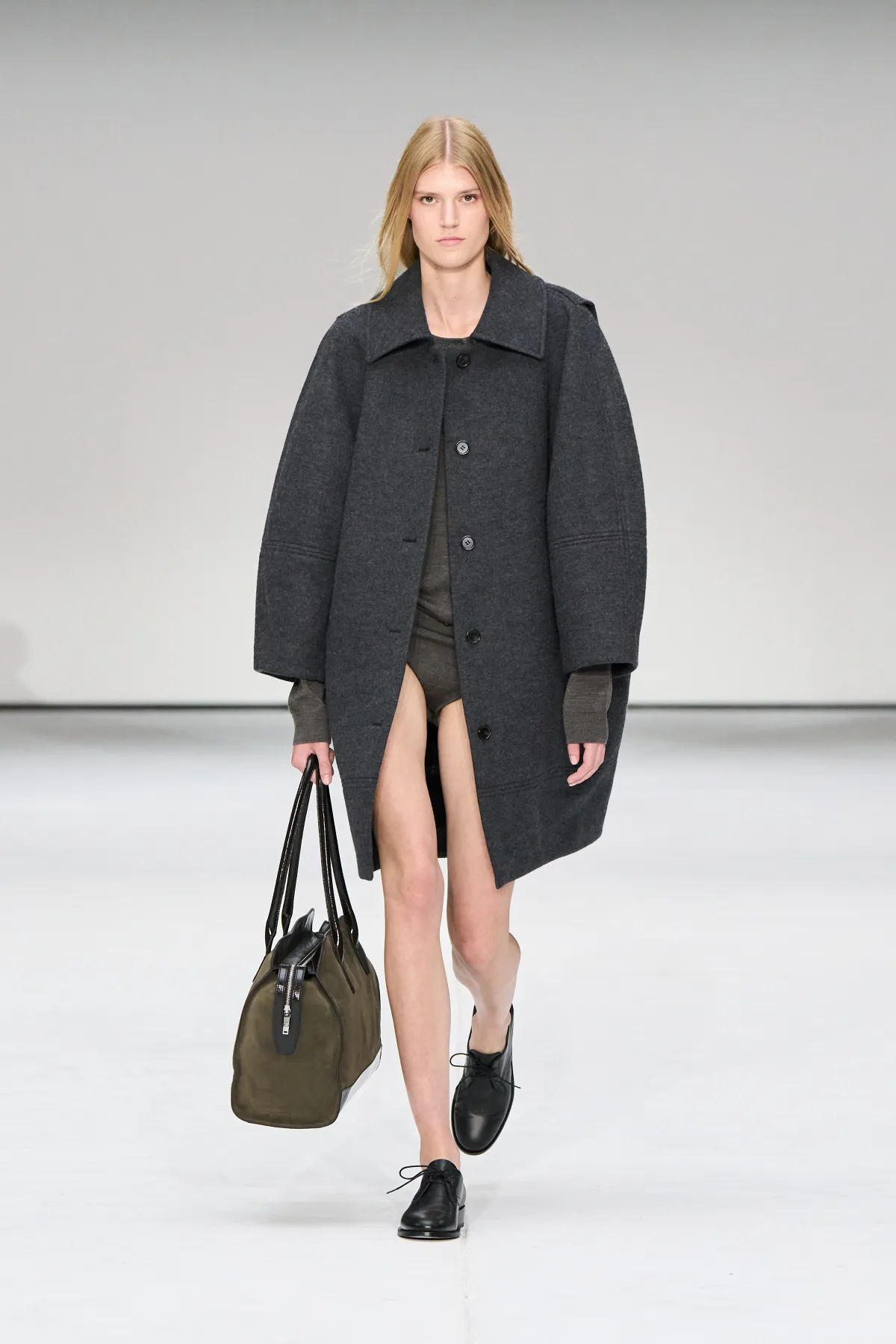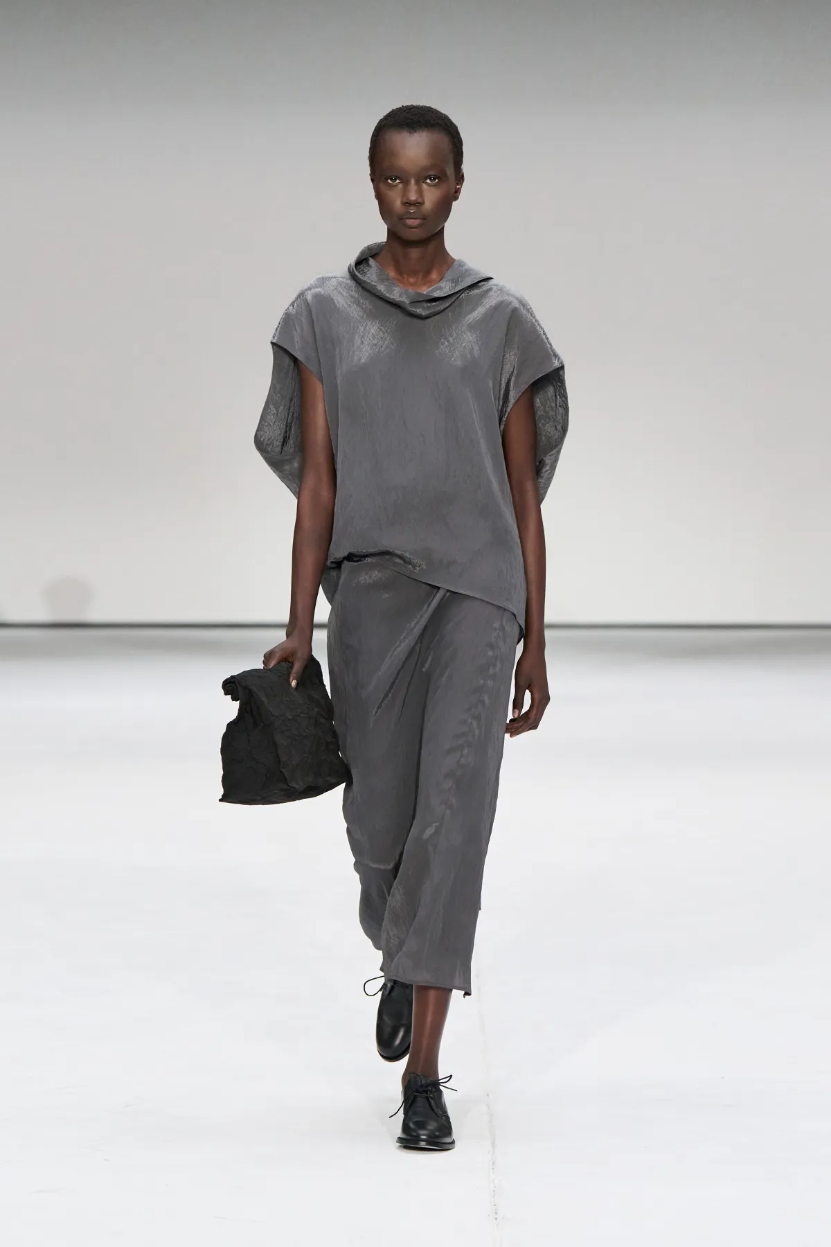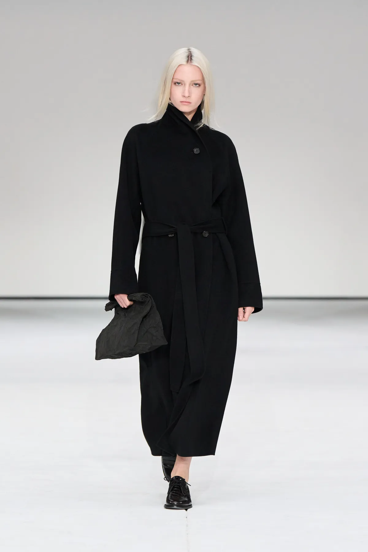 Damskie sylwetki COS to zabawa proporcjami. Cocooningowe płaszcze, szerokie szale i rzeźbiarskie draperie kontrastowały z podkreśloną talią i dekoltami inspirowanymi stylem lat 50. Najmocniejszym akcentem była jedwabna sukienka, dająca wiele możliwości stylizacji – idealny przykład połączenia prostoty i nowoczesnej elegancji. Looki uzupełniały skórzane torby, loafersy i dopasowane botki.