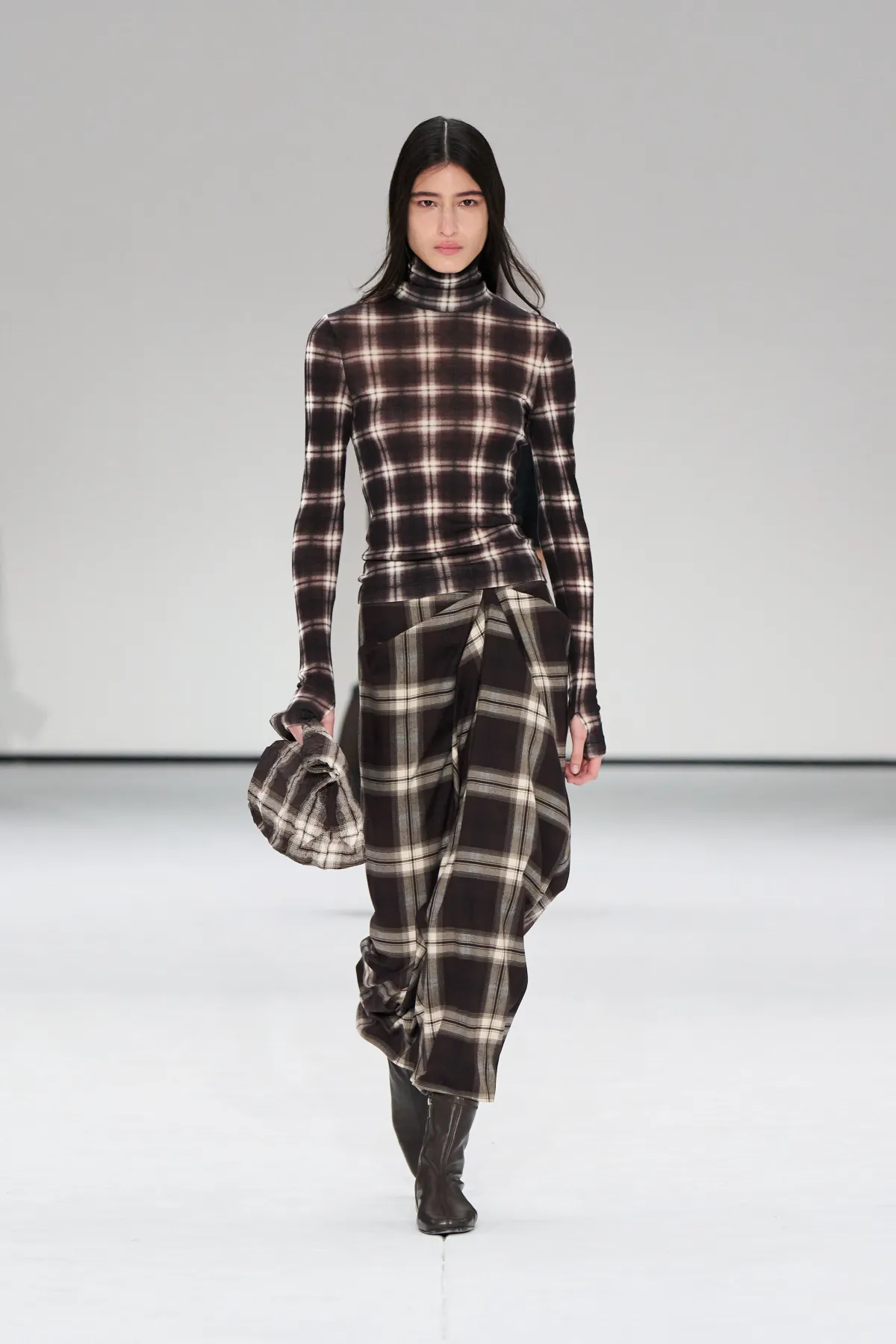 Kolekcja COS Jesień-Zima 2025/2026 oparta jest na głębokich, nasyconych barwach – czerń, stalowa szarość i granat zderzają się z neutralnymi tonami. Projektanci postawili na kontrast faktur: od matowych wykończeń po połysk, od mięsistych tkanin z efektem pony hair po delikatną transparentność. Szczególne wrażenie robiły transparentne warstwy ukazujące sylwetkę w ruchu oraz heritage’owe kraty, które dominowały zarówno w odzieży, jak i akcesoriach.