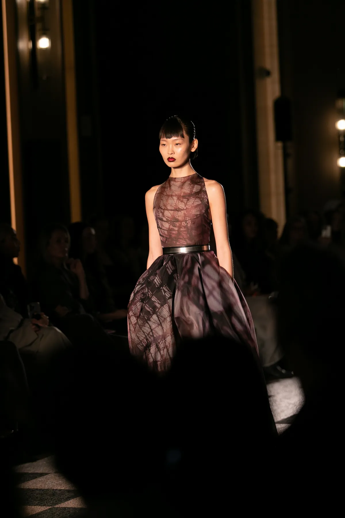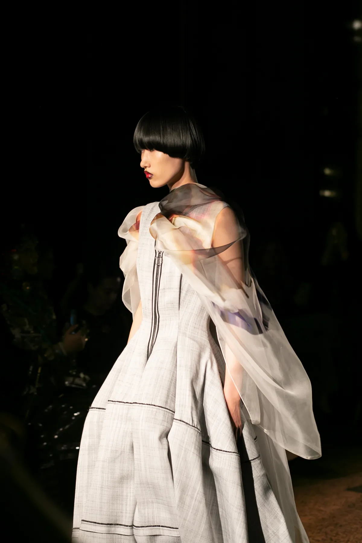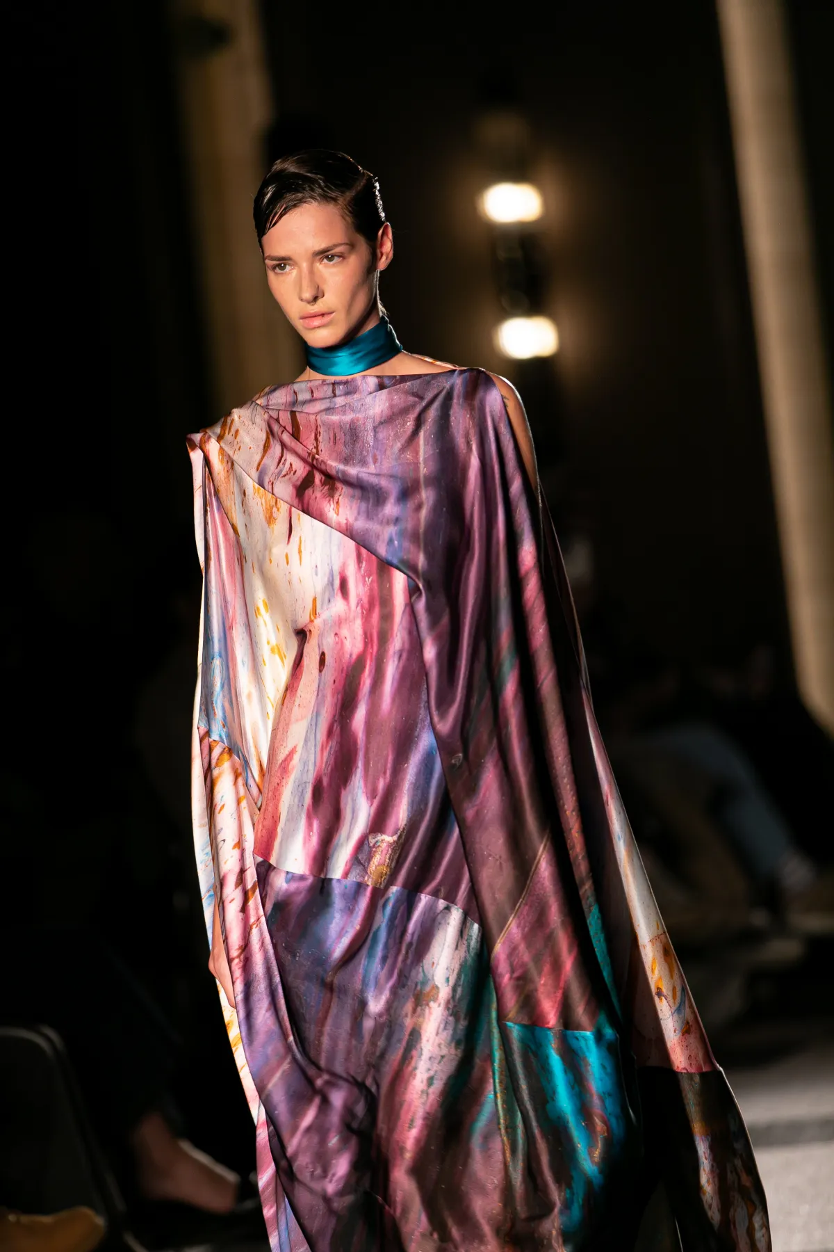 Drukowane organzy układają się w monumentalne sukienki o strukturze przypominającej crinoline, podczas gdy ręcznie malowane motywy pędzlem na jedwabiu wprowadzają w kolekcję element malarskiej ekspresji. To dialog nie tylko z Hepworth, ale i z samym pojęciem natury – jej cykliczności i zmienności.