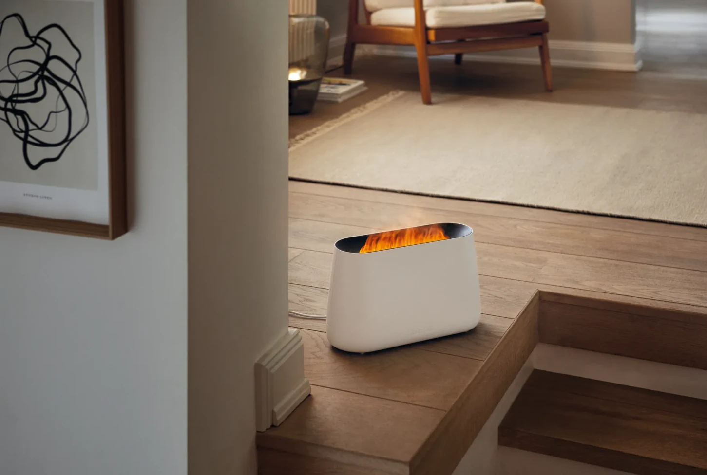 Na pierwszy rzut oka Stadler Form Ben nie przypomina klasycznego nawilżacza. To raczej subtelna rzeźba, która emituje delikatną mgiełkę przypominającą ogień z kominka. Dzięki wbudowanemu podświetleniu LED urządzenie tworzy efekt „płonącej” pary, nadając wnętrzu ciepła i atmosfery przytulności. To taki gadżet, który wprowadza klimat hygge – nawet w środku miejskiej dżungli.