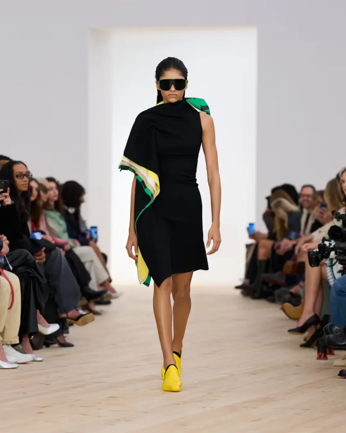 W kolekcji dominują drukarskie odcienie: żółcie, czerwienie, błękity – jakby wyjęte z palety CMYK. Obok nich: leathers tak delikatne, że niemal zacierają granicę między materiałem a skórą. W ruchu te ubrania nabierają życia – przypominają sportowe uniformy, ale o wysokim stopniu wyrafinowania.