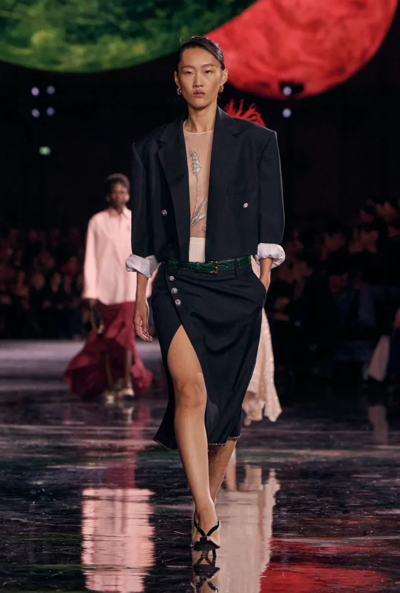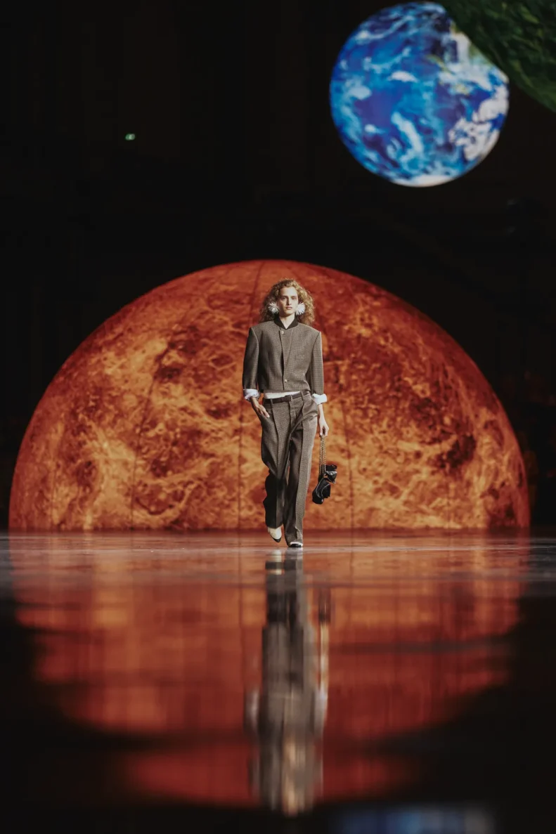 W ostatniej części, „L’Universel”, projektant przenosi nas w przyszłość – tweed staje się przezroczysty, a biżuteria zyskuje wymiar międzygalaktyczny. Na wybiegu pojawiły się perły, szkło, emaliowane łańcuchy, planety z masy perłowej, które dosłownie odbijały światło planet zawieszonych nad wybiegiem. Wszystko było spójne, jakby moda, światło i dźwięk mówiły tym samym językiem.