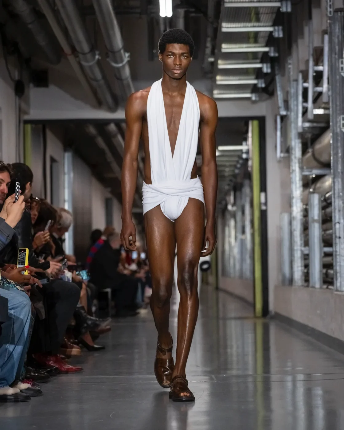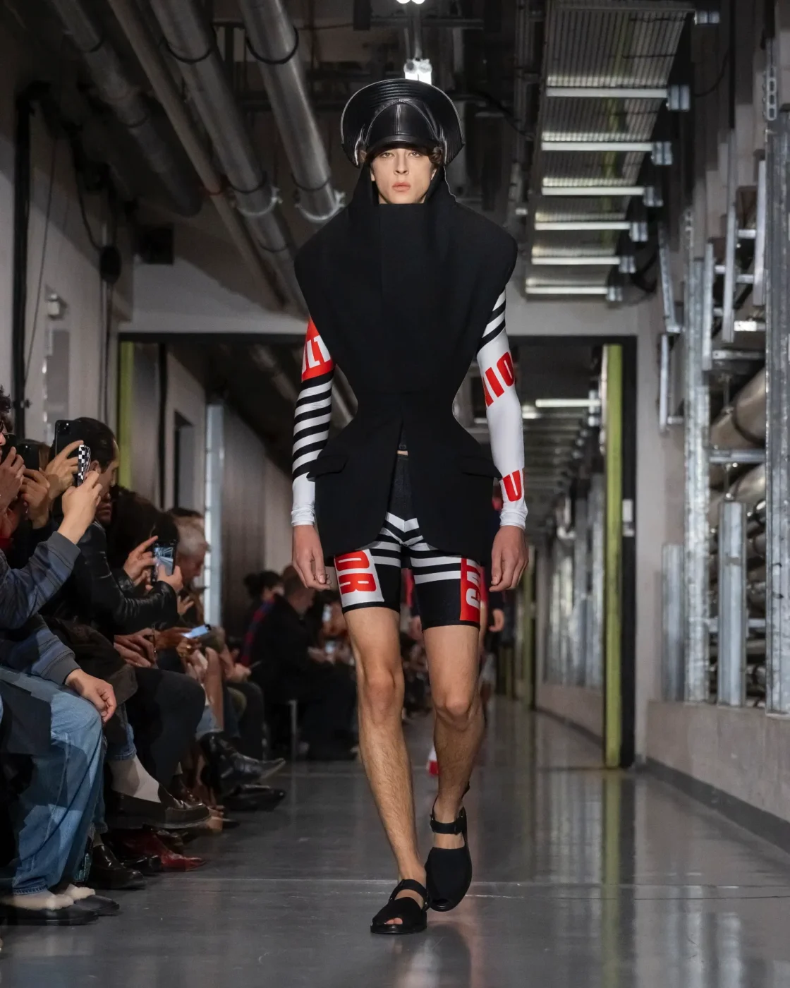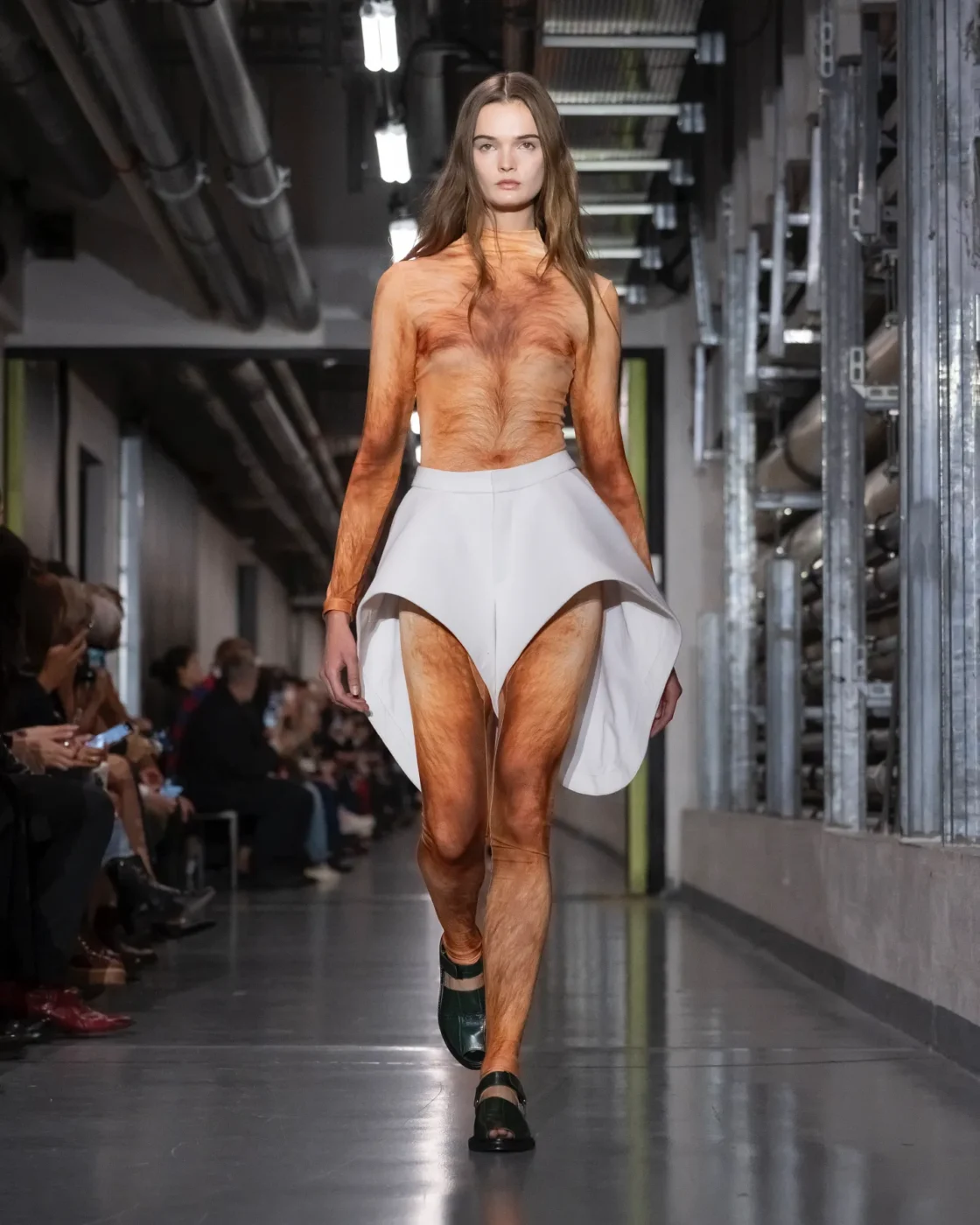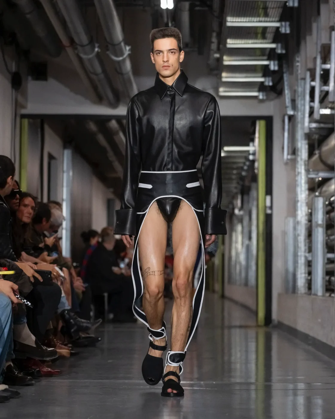 Pokaz w podziemiach Musée du Quai Branly w Paryżu był równie szalony jak sama kolekcja. Dysmorfia, przeskalowane ramiona, spódnice lecące w powietrze, tatuaże 3D, optyczne paski marynarskie i trompe l’oeil z nagim ciałem – to wszystko miało być memoriałem nowej energii Gaultiera. Skończyło się jednak na efekcie „za bardzo chcę być cool”. Lantink twierdzi, że nie robi moodboardów, tylko „czuje modę”. Czuć faktycznie – ale bardziej chaos niż wizję. To jakby spotkać Gaultiera z rave’u w Amsterdamie i kazać mu projektować po 48 godzinach bez snu. Czasem genialne, czasem żenujące, a czasem prowokacyjnie.