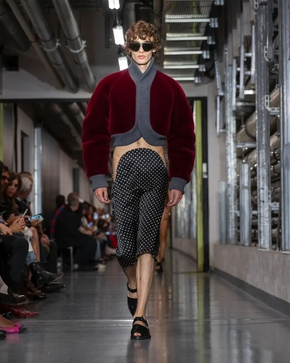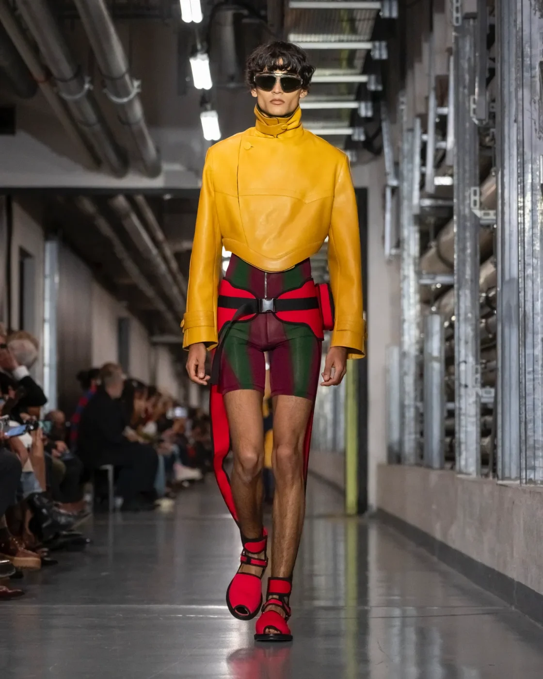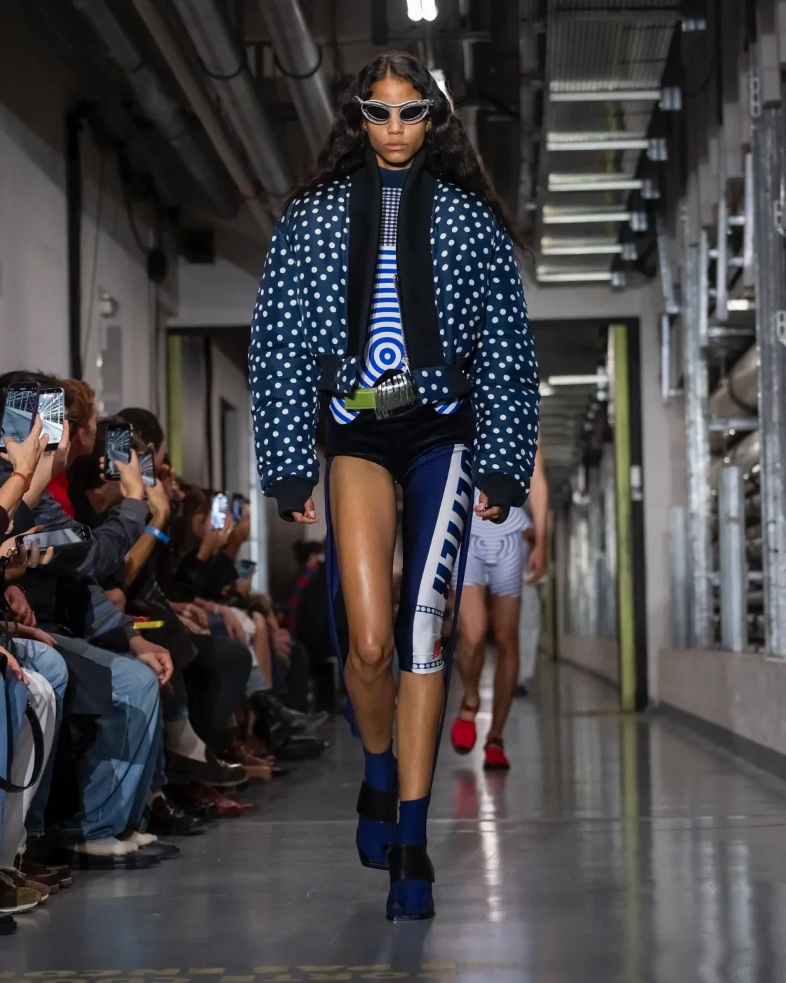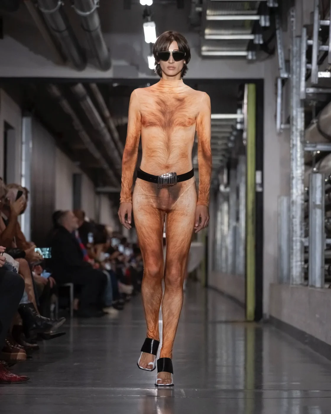 Pokaz w podziemiach Musée du Quai Branly w Paryżu był równie szalony jak sama kolekcja. Dysmorfia, przeskalowane ramiona, spódnice lecące w powietrze, tatuaże 3D, optyczne paski marynarskie i trompe l’oeil z nagim ciałem – to wszystko miało być memoriałem nowej energii Gaultiera. Skończyło się jednak na efekcie „za bardzo chcę być cool”. Lantink twierdzi, że nie robi moodboardów, tylko „czuje modę”. Czuć faktycznie – ale bardziej chaos niż wizję. To jakby spotkać Gaultiera z rave’u w Amsterdamie i kazać mu projektować po 48 godzinach bez snu. Czasem genialne, czasem żenujące, a czasem prowokacyjnie.