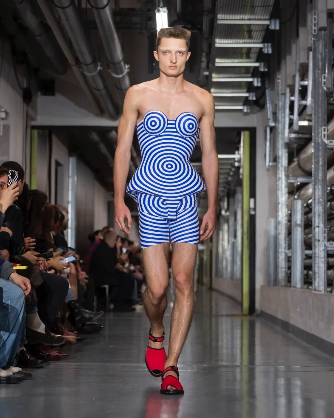 W tle unosił się duch oryginalnego Gaultiera – marinière, tatuaże, błyszczące kolory, odrobina kiczu. Ale Lantink potraktował te ikony bardziej jak gadżety niż DNA marki. Efekt? Kolekcja, która wygląda jak eksperymentalna instalacja artystyczna lub szalony pomysł wykładowcy szkoły projektowania ubioru, a nie gotowa do noszenia linia prêt-à-porter.