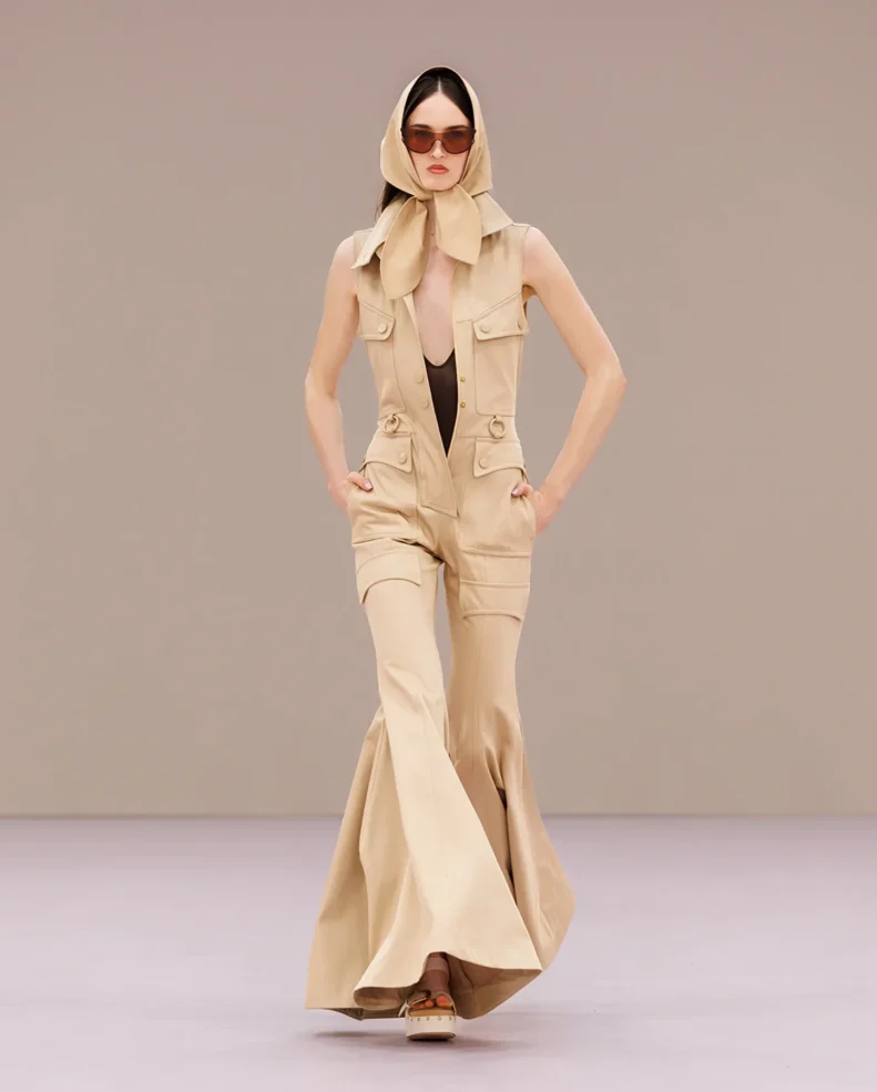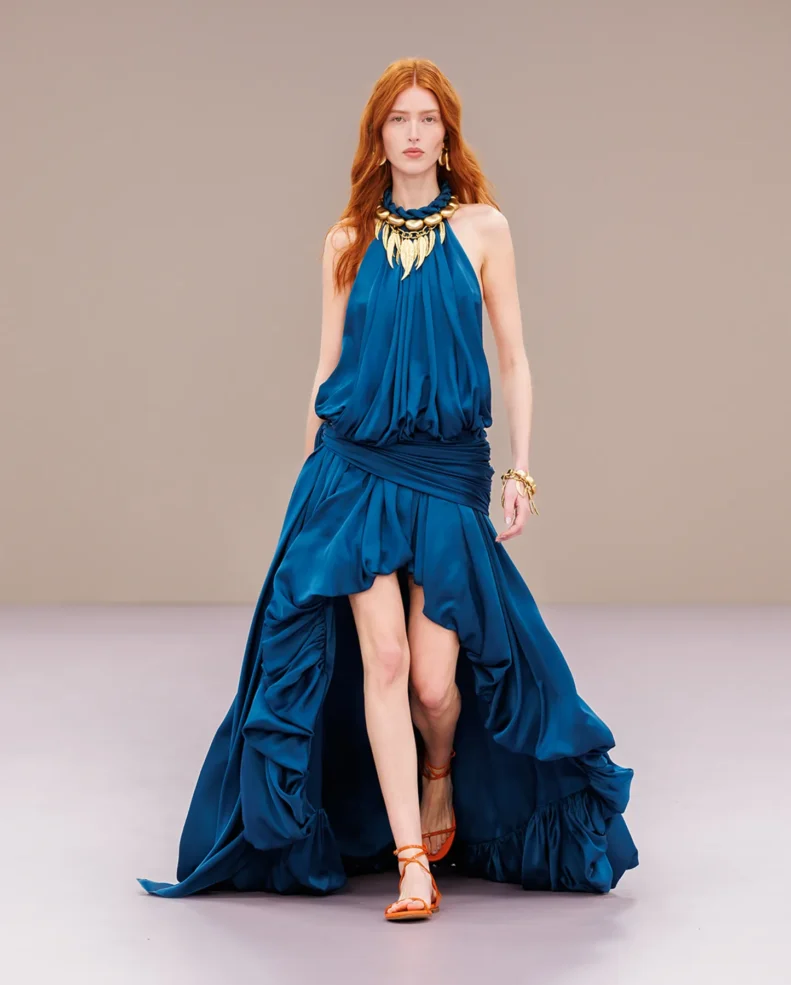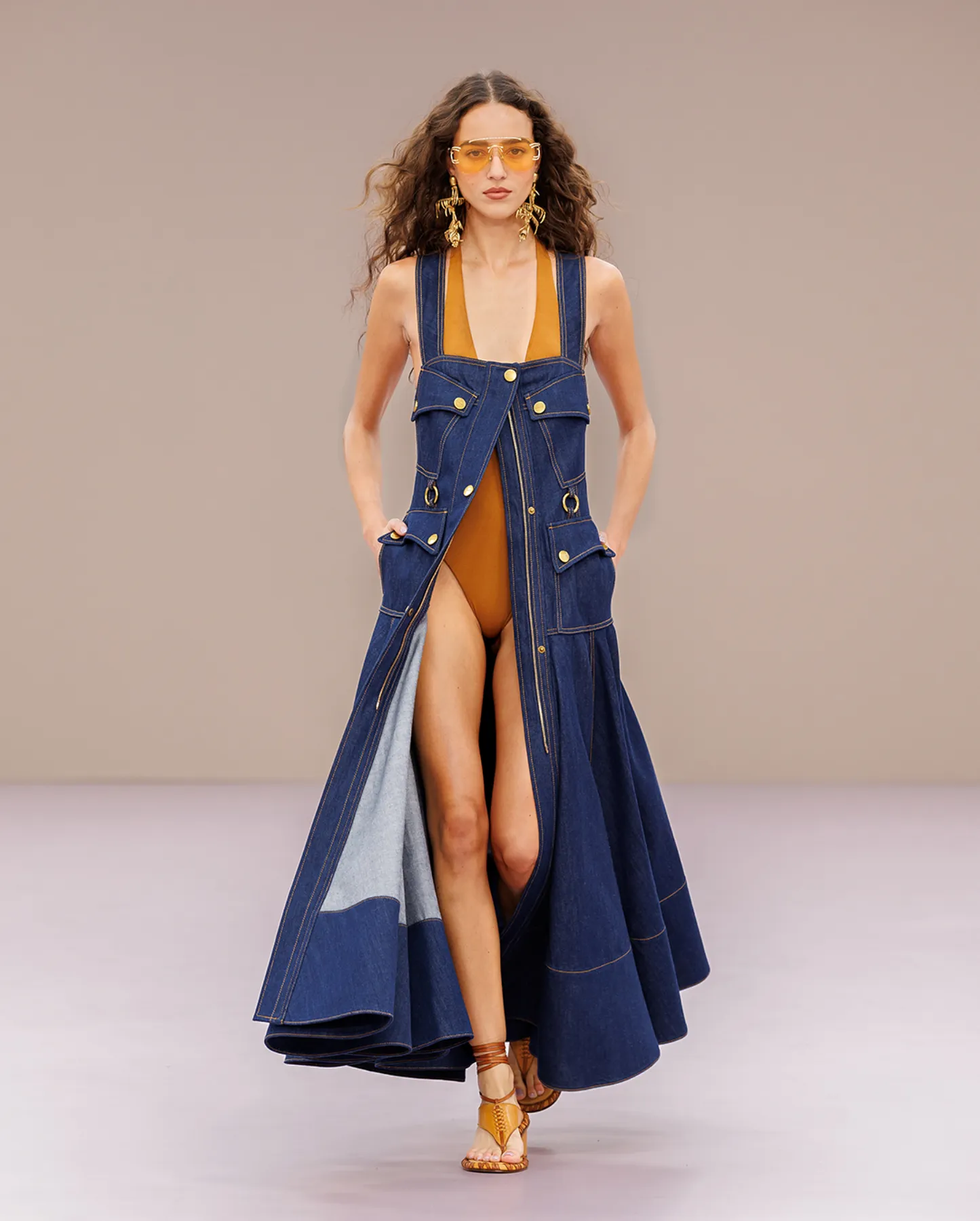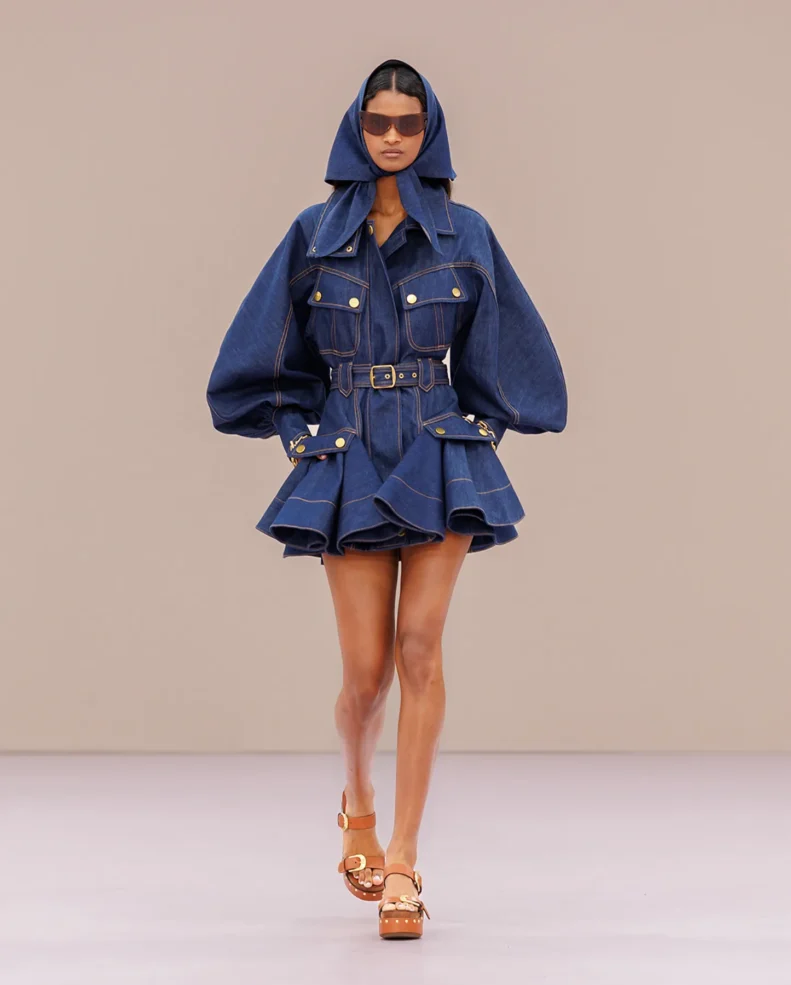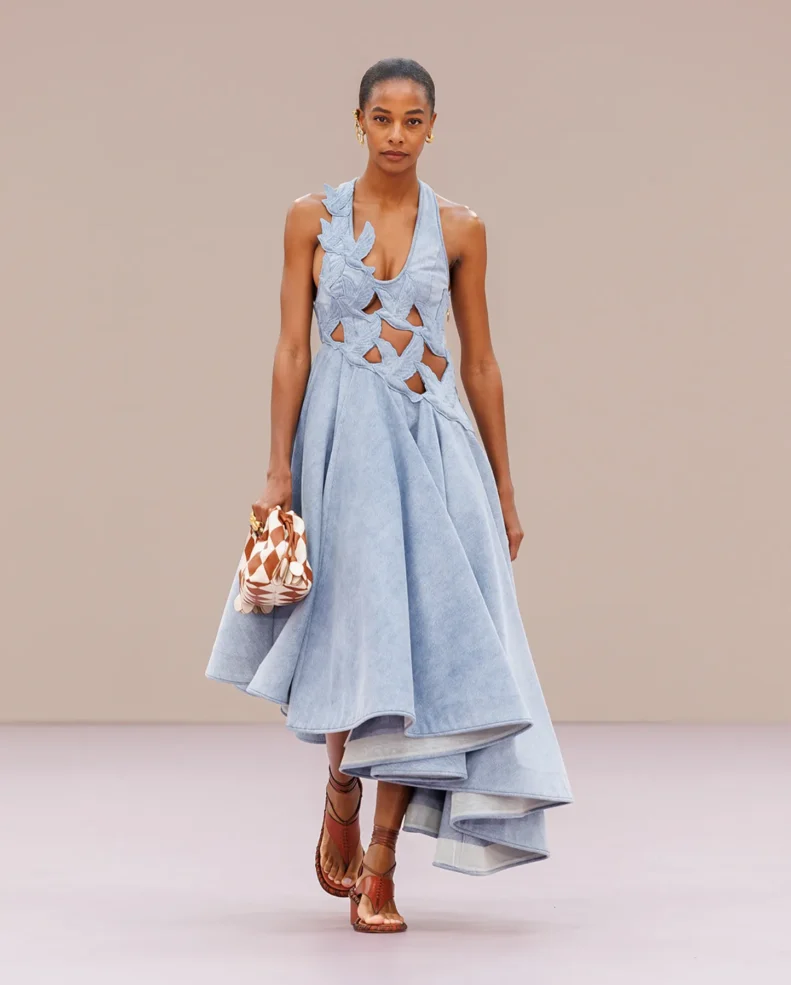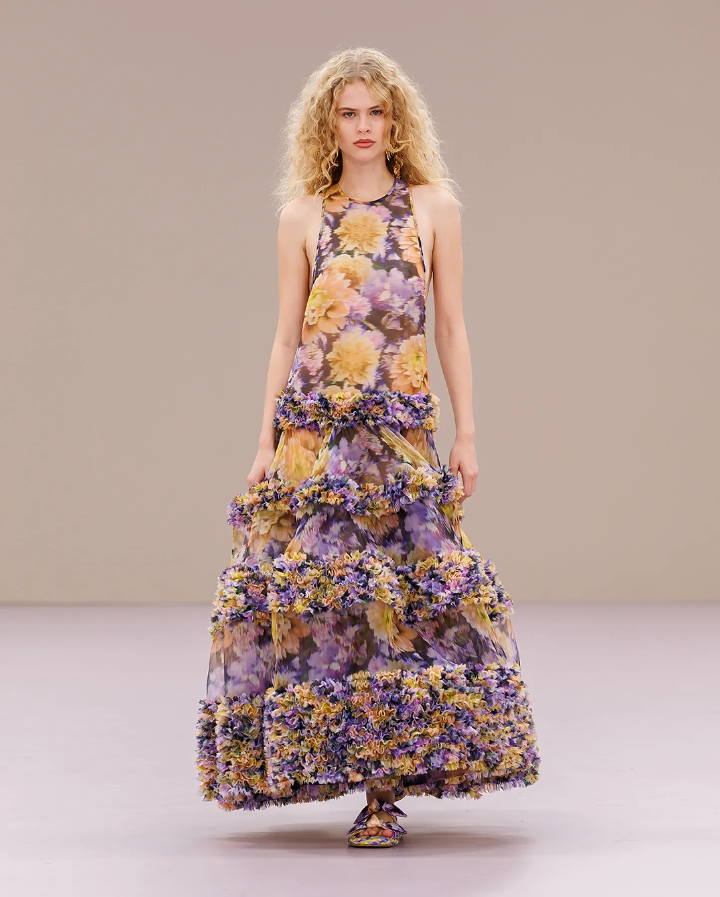 Nowością są też „super-fluffy” sukienki z setek warstw organzy ciętej po skosie i marszczonej tak, że przypominają eksplozję kwiatowych płatków. Obok nich pojawiają się dżinsowe sylwetki z ręcznie wyszywanymi motywami ptaków, a nawet kombinezony inspirowane roboczym stylem artystów – z charakterystycznym luzem i lekko ironicznym tonem.