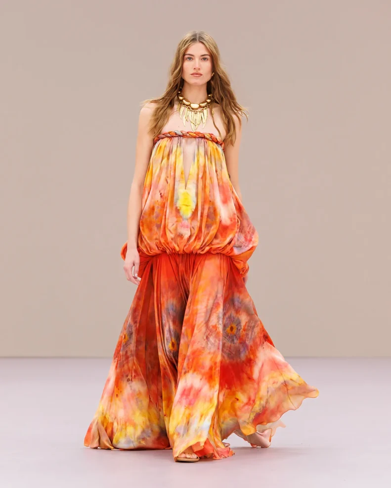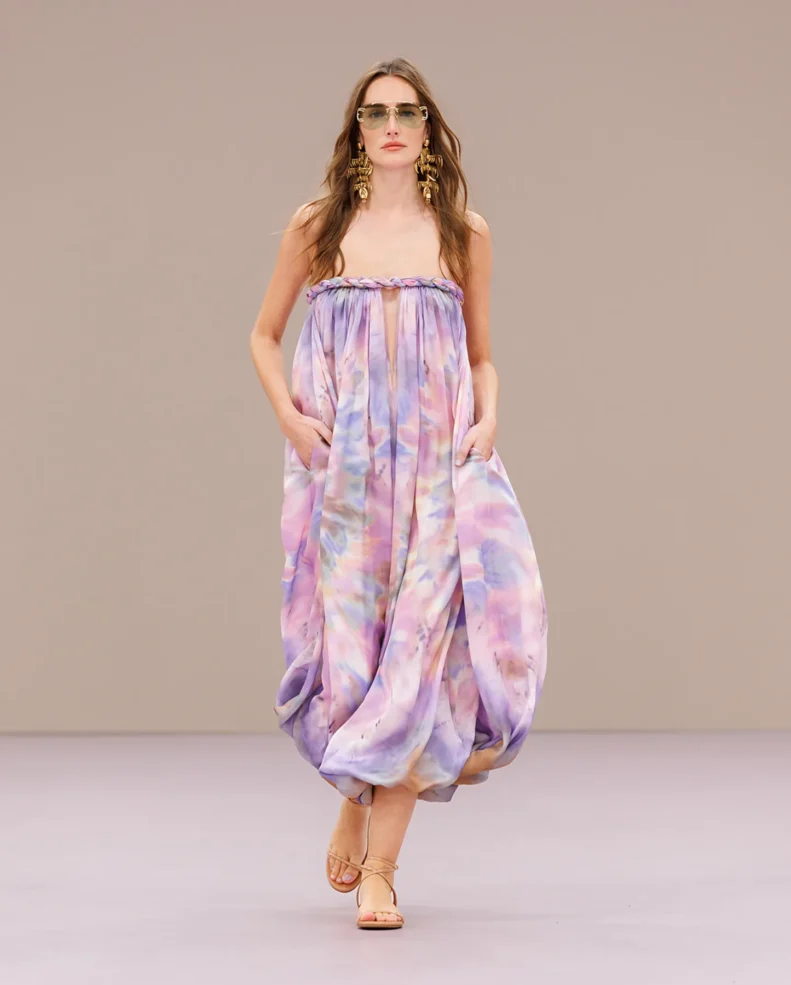Wiosenna linia to czysta radość tworzenia. Widzimy eksplozję barw i printów, które balansują między florystycznym transem a tie-dye w pastelowym wydaniu. Zimmermann bawi się fakturą i proporcjami – od ultra kobiecych sukienek z organzy po szerokie spodnie z wysokim stanem i rozkloszowane kurtki z bawełnianego twillu. To moda, która żyje w ruchu i pulsuje energią.