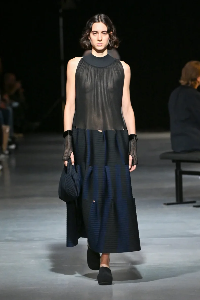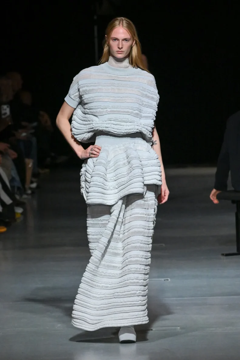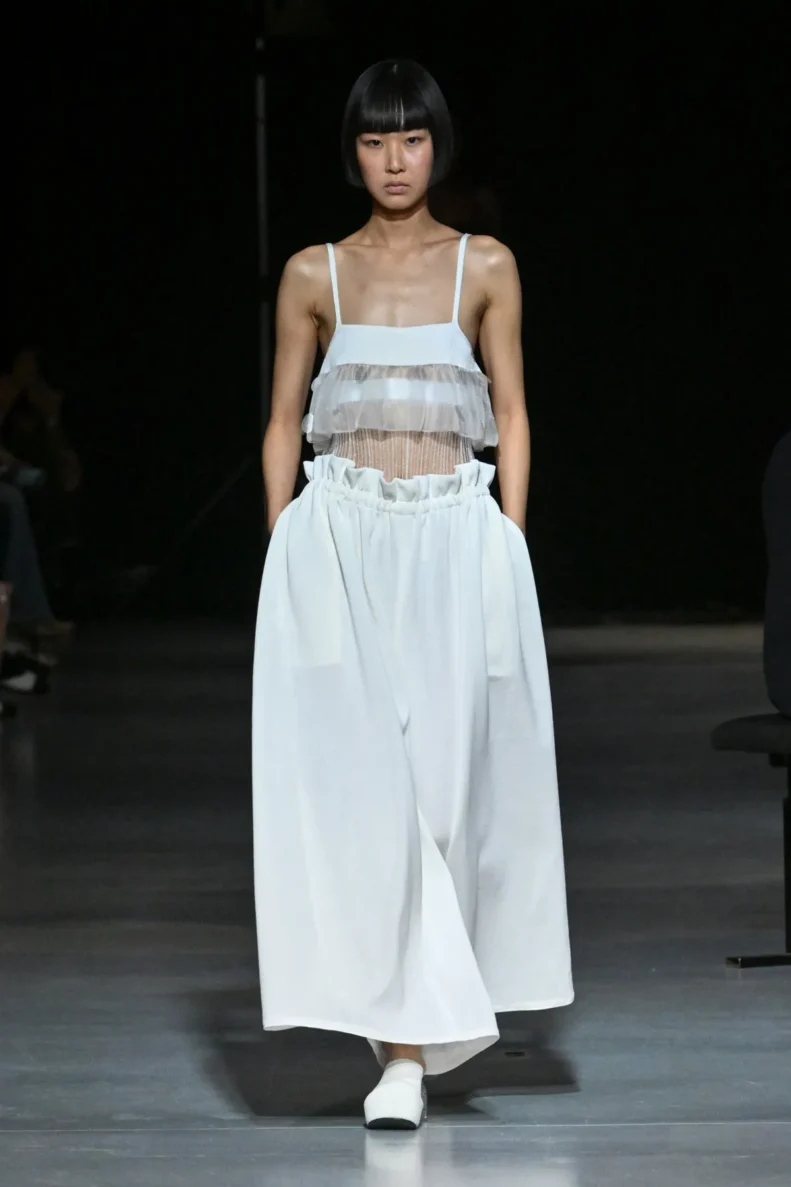 Najbardziej charakterystyczna dla CFCL seria POTTERY została w tej odsłonie przetworzona na transparentne sukienki inspirowane szkłem Émile’a Gallé i rzeźbami Mariko Mori. Delikatne, pastelowe tony mięty i szarości przenikały się z połyskiem przędzy, tworząc efekt delikatnego światła.