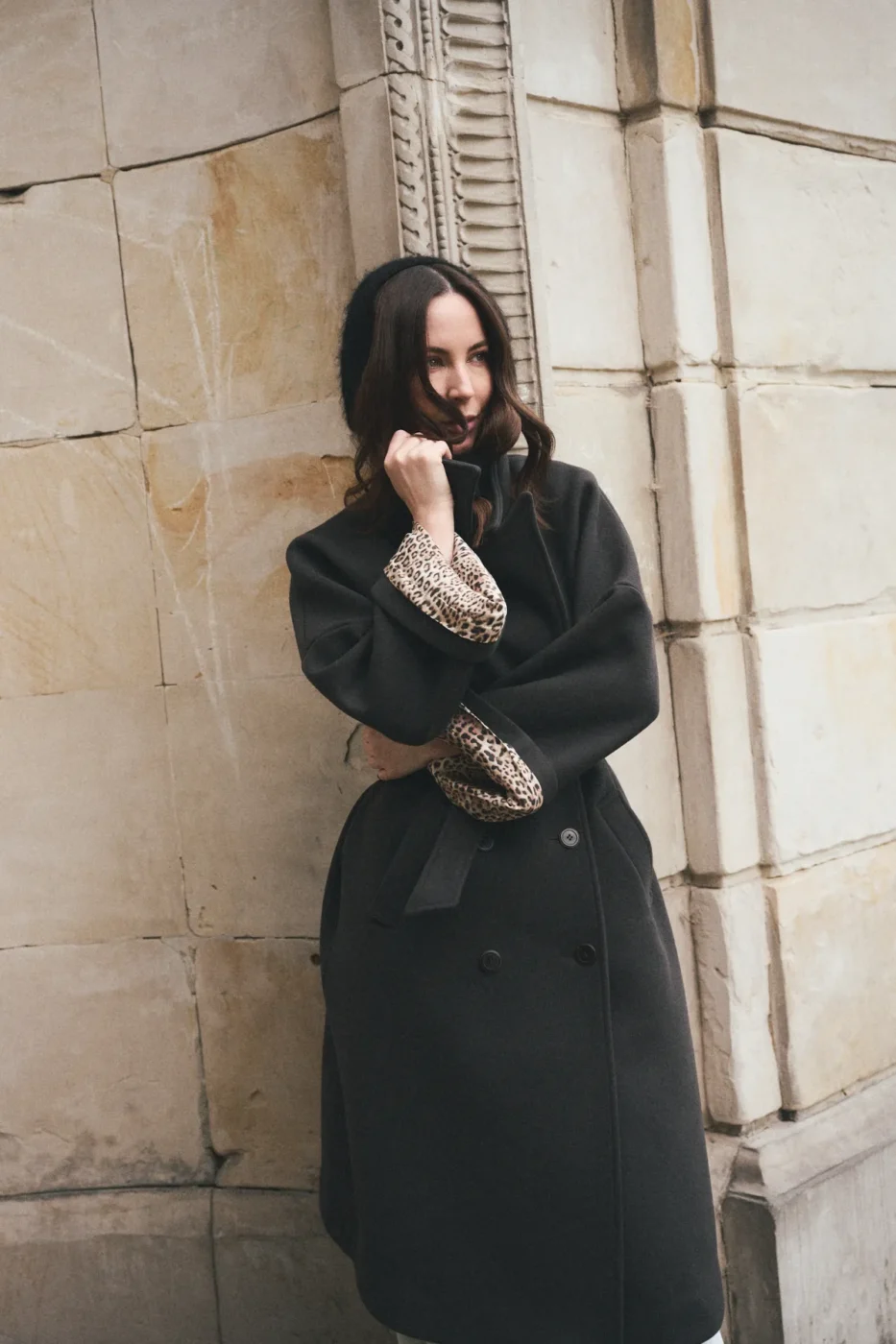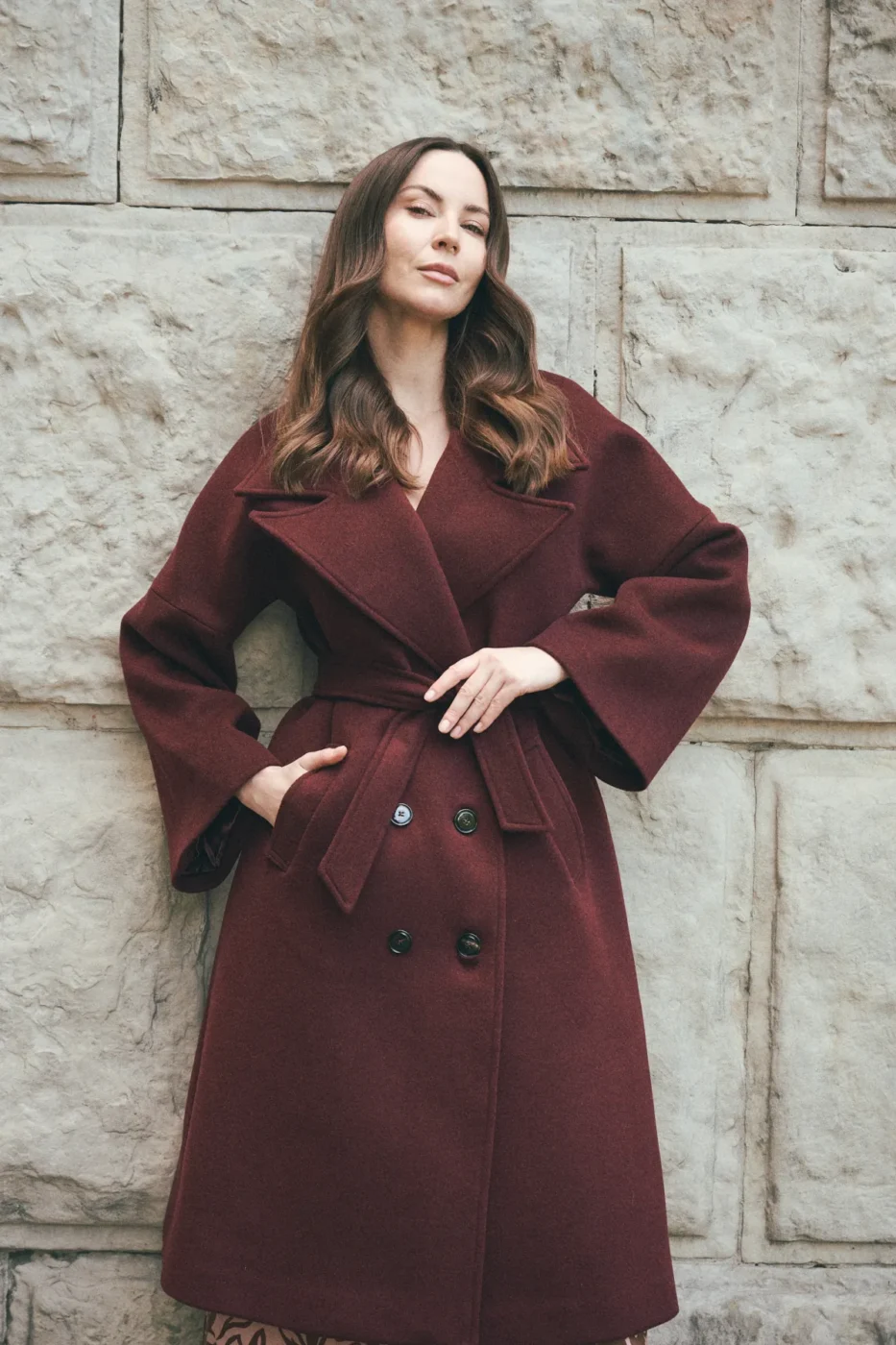 Drugi drop, „Matière”, to zupełnie inny nastrój. Gęsta faktura, ciężar tkaniny, ciepło, które daje spokój. Tutaj NUES koncentruje się na strukturze – kaszmirze, wełnie, materiale, który nie tylko grzeje, ale otula jak gest. Płaszcze z mieszanki 50% kaszmiru i 50% wełny mają w sobie elegancję i moc rzemiosła. Bordo i grafit nadają głębi, a czarne kimono „Oyster”, szyte ręcznie w warszawskiej pracowni, zaskakuje geometrią wewnętrznej podszewki z naturalnej wiskozy.