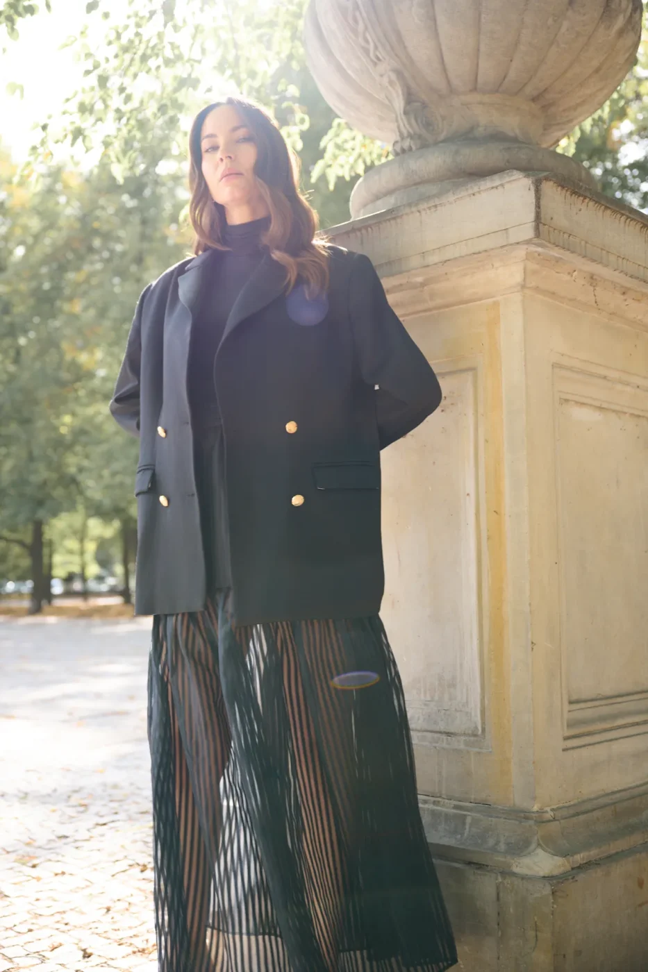To kolekcja dla kobiet, które lubią prostotę, ale nie rezygnują z wyrazu. Złote guziki odbijają światło w ruchu, transparentny jedwab miękko otula sylwetkę, a retro-krata w stylu londyńskiej jesieni nadaje charakteru. Wieczorem pojawia się lekkość i zmysłowość – półprzezroczysta spódnica „Ether” z mieszanki jedwabiu i wełny czy czarne cekinowe spodnie, które pozwalają błyszczeć w najbardziej subtelny sposób.