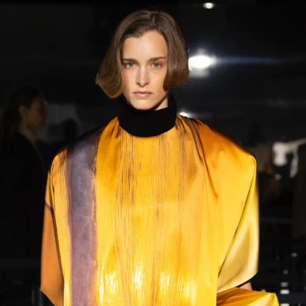 Sylwetki są wyraźnie wydłużone – pionowe, pewne siebie, zbudowane na kontrastach między konstrukcją a delikatnością. Garnitury o ostrych liniach spotykają się z miękkimi, przeźroczystymi tkaninami. Skóra prześwituje spod koronki, a metaliczne dodatki błyskają w ruchu. Ackermann potrafi sprawić, że jedno rozcięcie potrafi być bardziej erotyczne niż cała nagość.