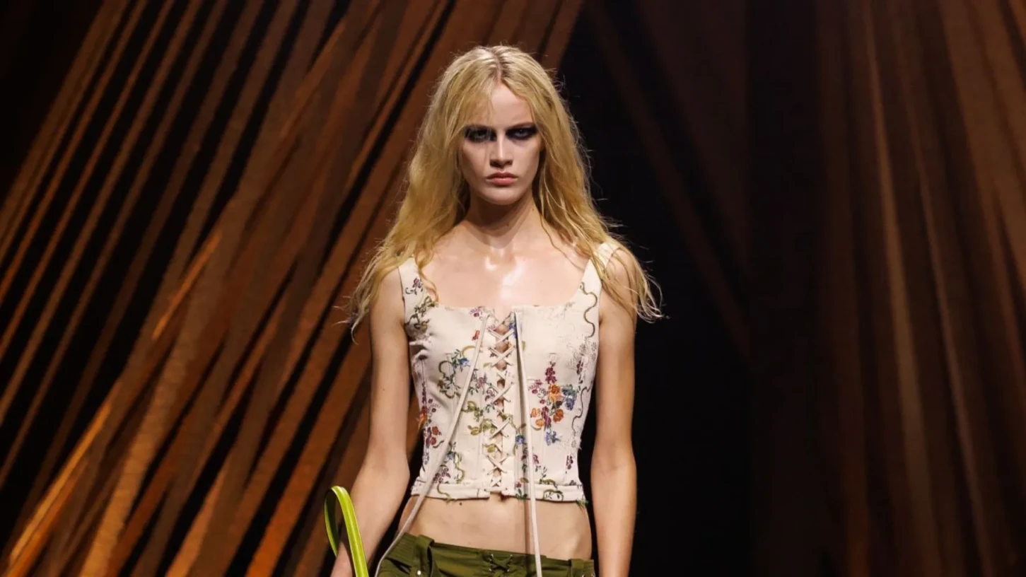 Luksus i brutalność przenikają się w materiałach. Obok łańcuchowej siatki i złotych haftów pojawia się sprany bawełniany twill i jedwab habotai o fakturze słońca. Torebki łączą perłowy połysk z drewnem i amuletami w formie talizmanów. Kultowa De Manta wraca w wersji z frędzlami i koronkowym gorsetem. Buty? Powrót rogowego obcasa z kolekcji z 2003 roku – wtedy szok, dziś ukłon w stronę dziedzictwa marki.