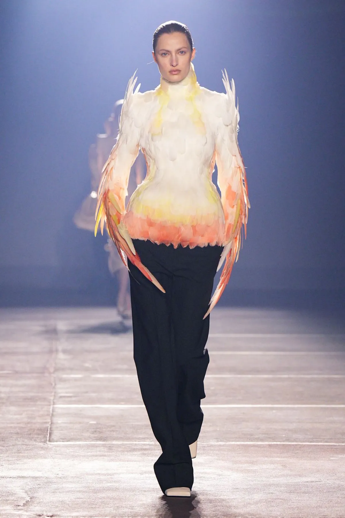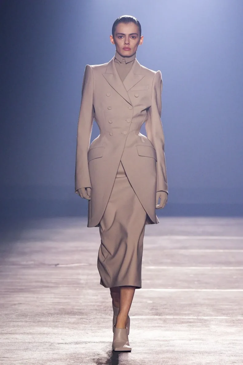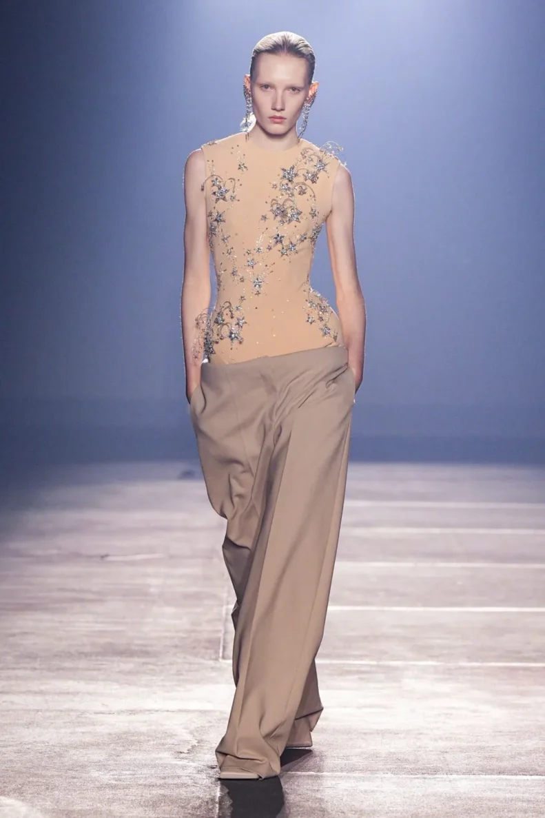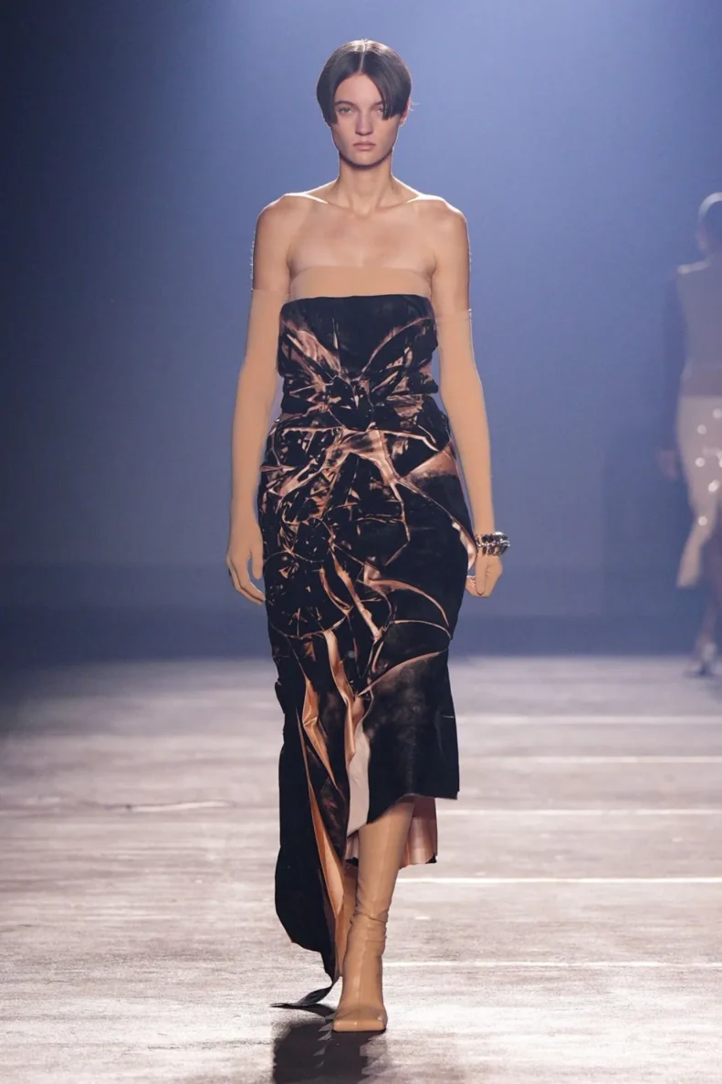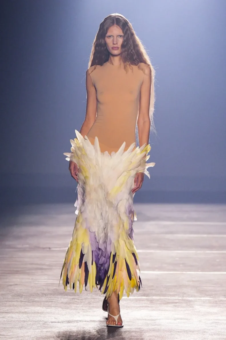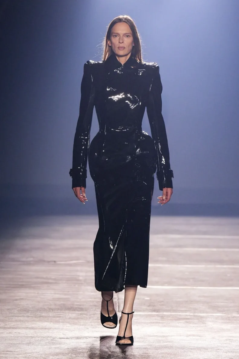 Pokaz odbył się w przestrzeni przypominającej brutalistyczny teatr snów, gdzie światło i cień grały z materiałami jak aktorzy na scenie. Feather couture spotkało się tu z lateksem, satyna z jerseyem, a przezroczystość – z konstrukcją godną architekta. Charakterystyczne dla Muglera gorsetowe sylwetki pojawiły się w nowych konfiguracjach: czasem rozmontowane, czasem przeciągnięte przez ciało niczym druga skóra, ozdobione matowymi, cielistymi kamieniami.