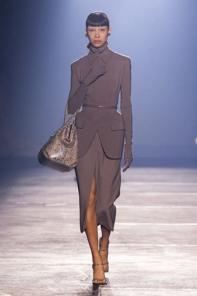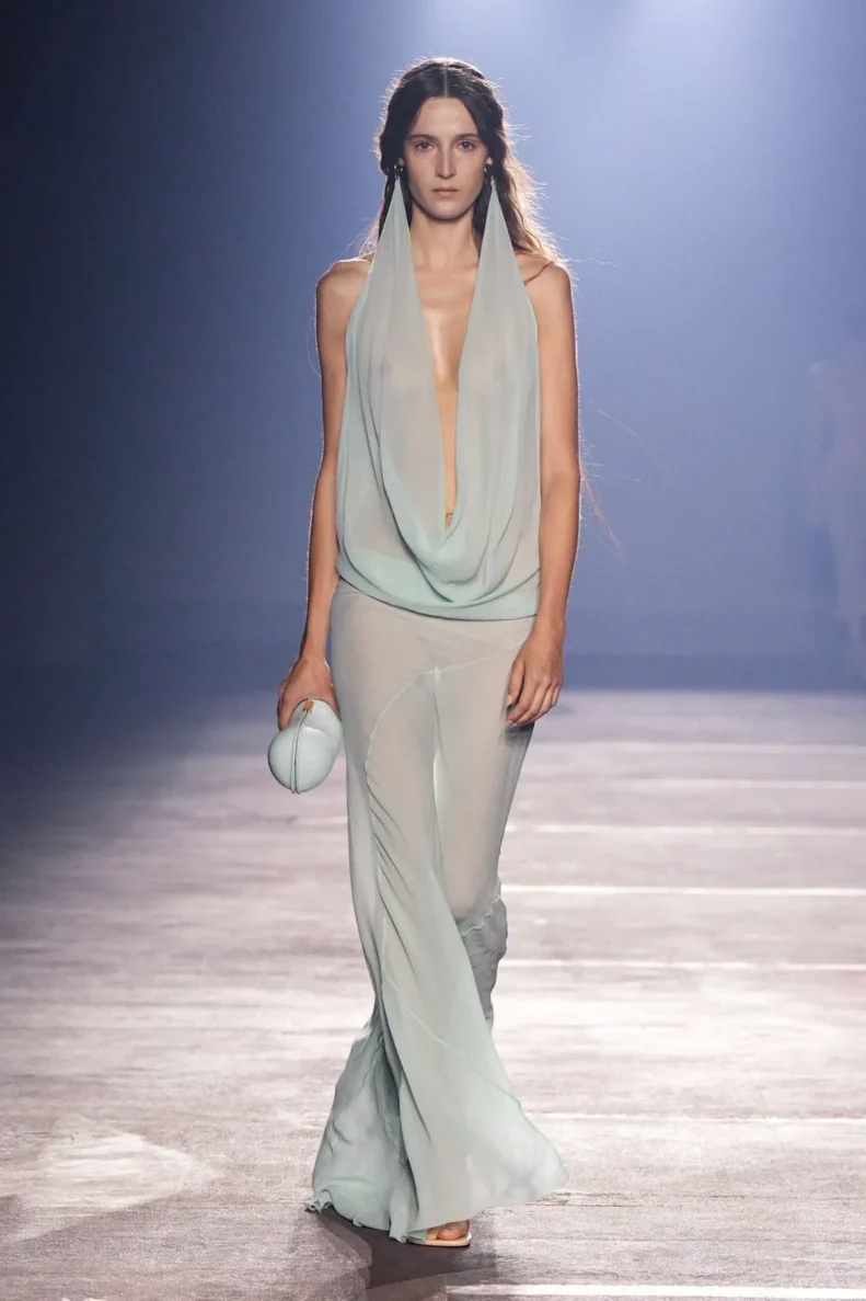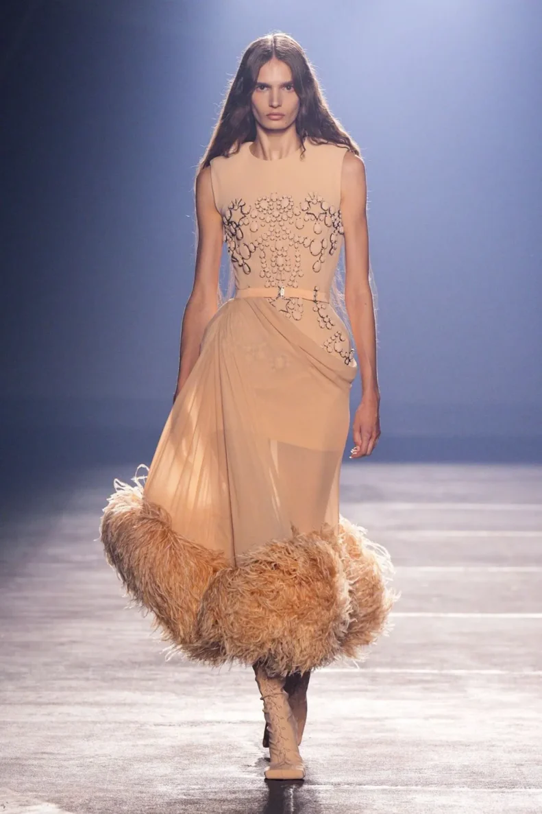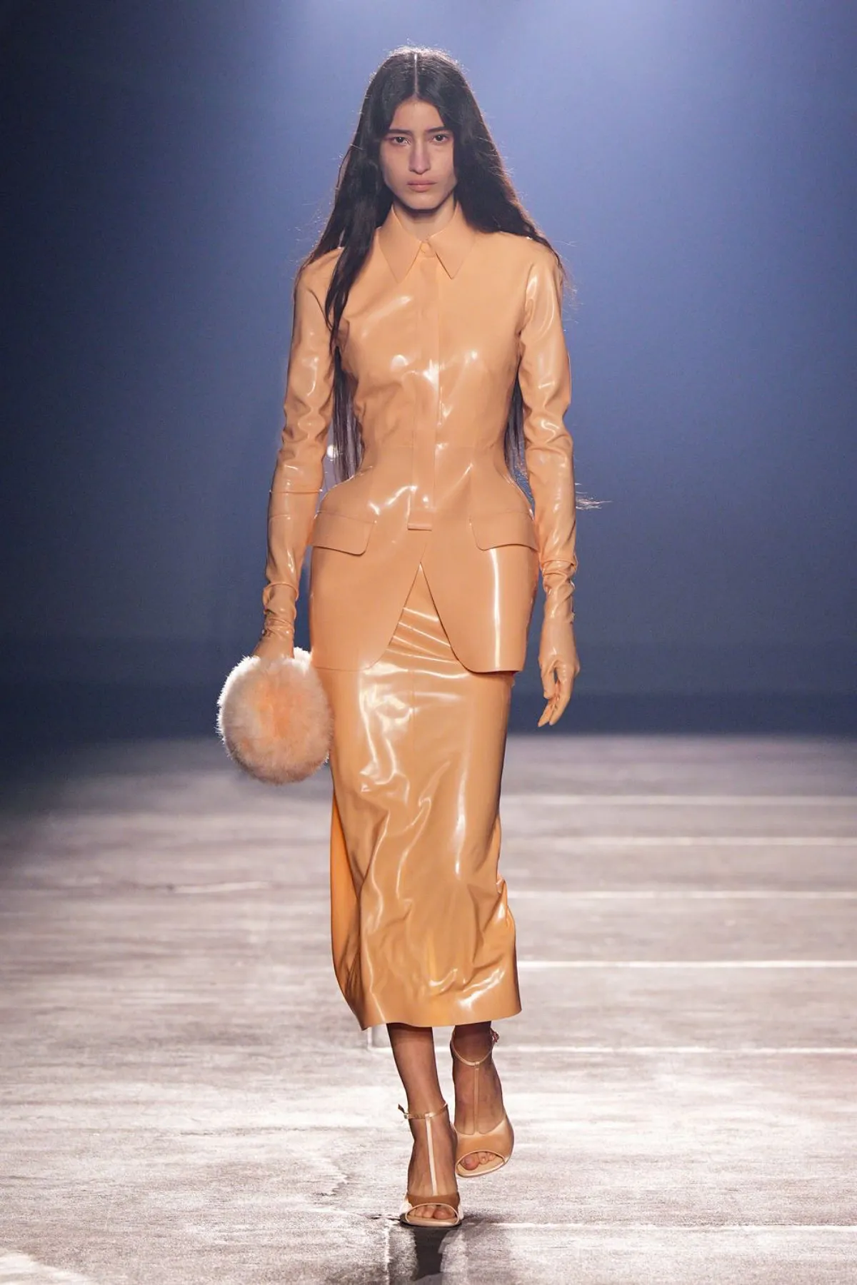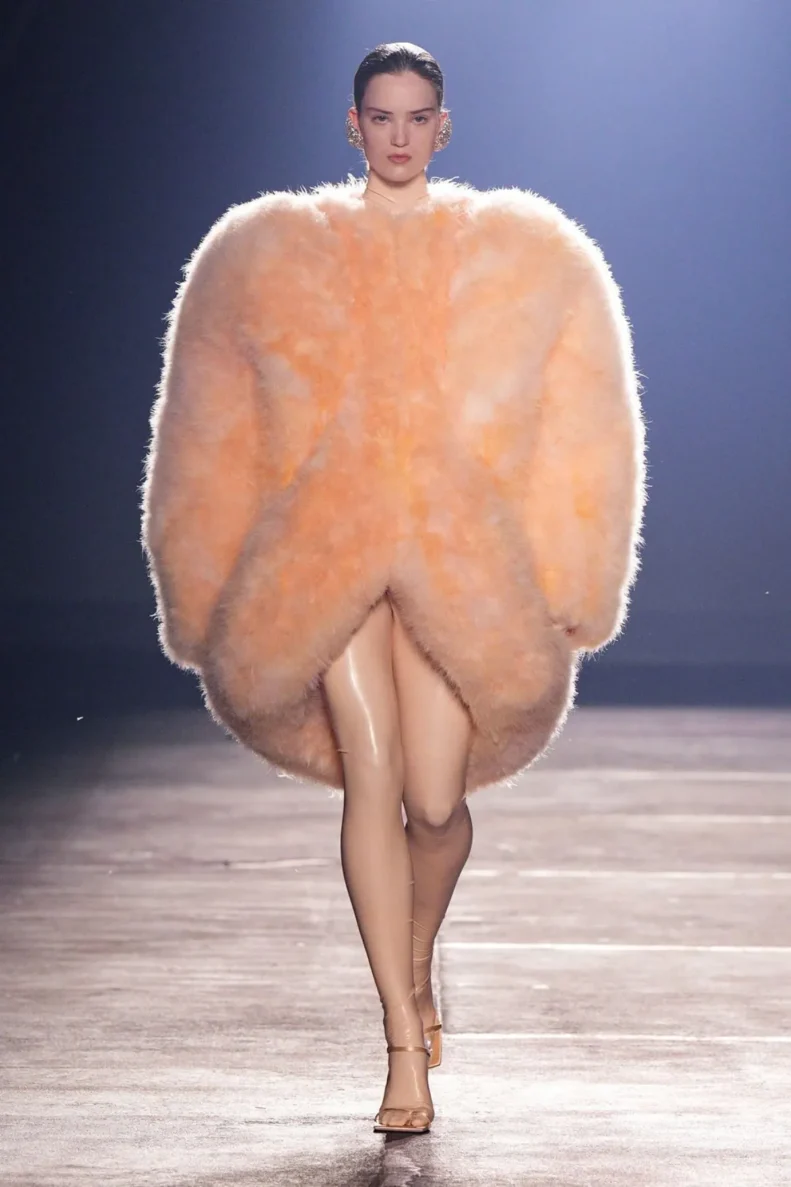 Pokaz odbył się w przestrzeni przypominającej brutalistyczny teatr snów, gdzie światło i cień grały z materiałami jak aktorzy na scenie. Feather couture spotkało się tu z lateksem, satyna z jerseyem, a przezroczystość – z konstrukcją godną architekta. Charakterystyczne dla Muglera gorsetowe sylwetki pojawiły się w nowych konfiguracjach: czasem rozmontowane, czasem przeciągnięte przez ciało niczym druga skóra, ozdobione matowymi, cielistymi kamieniami.