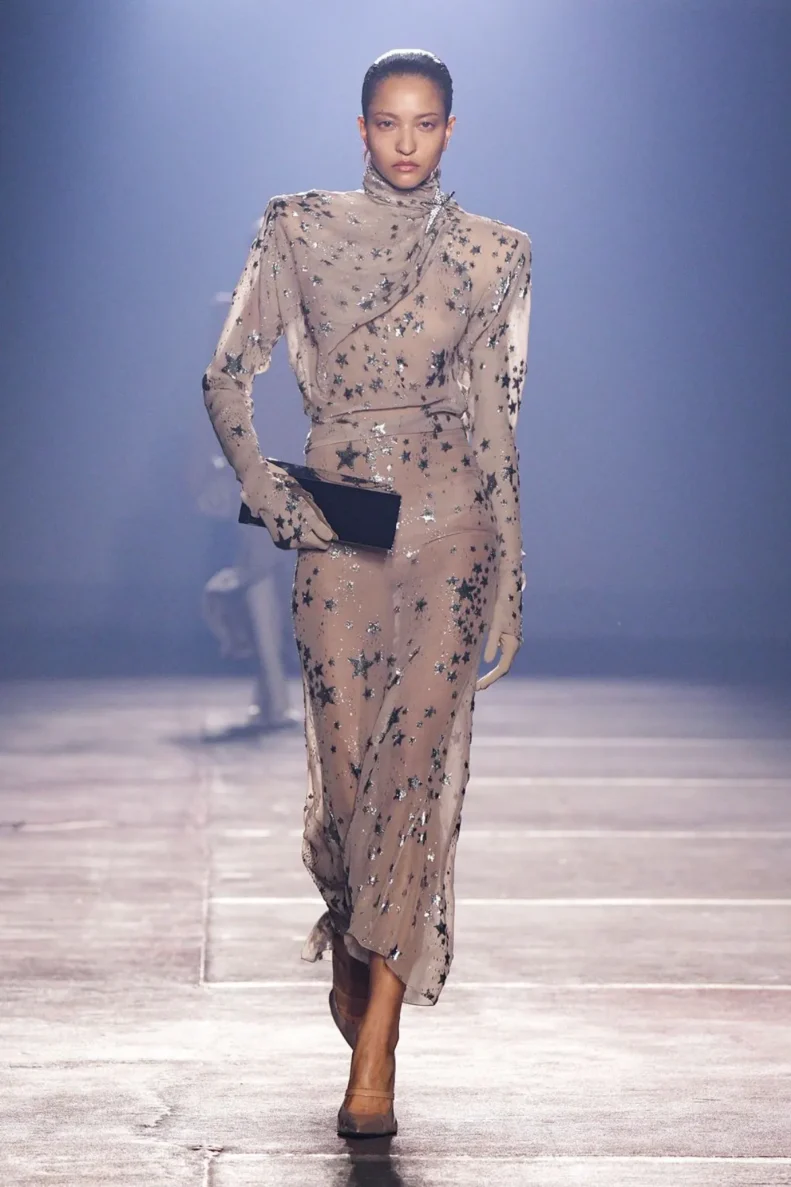 Kolekcja zatytułowana „Stardust Aphrodite” otwiera trylogię „The Obscure Object of Desire”. To hołd dla kobiet i archetypów, które przez wieki definiowały pożądanie – od mitycznej Afrodyty po biblijną Salome, od Marleny Dietrich po filmowe bohaterki Fassbindera. Freitas nie cytuje ich dosłownie, lecz przetwarza. Jego Mugler to showgirl w wersji 2026: jednocześnie silna i krucha, błyszcząca i surowa, boska i niepokojąco ludzka.