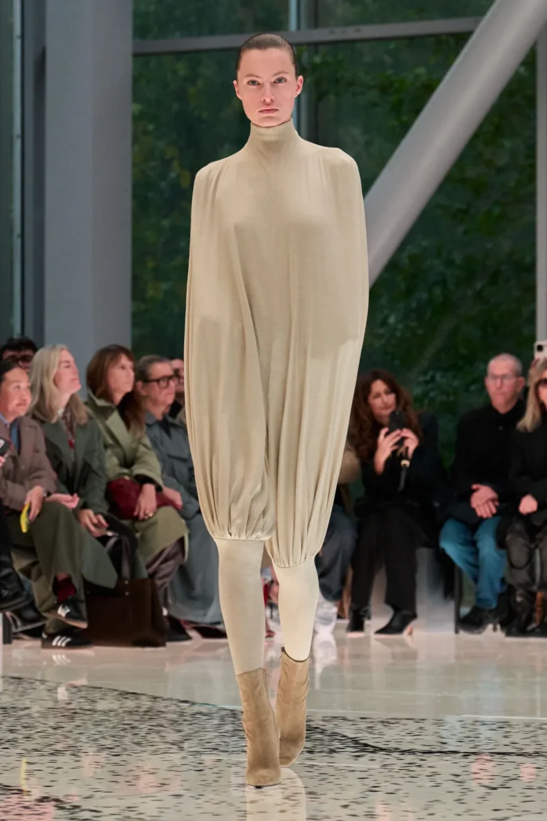 W tym sezonie Alaïa to czysta rzeźba. Formy są aerodynamiczne, wręcz ergonomiczne, jakby ubrania powstały z ruchu samego ciała. Część sylwetek otula, inne – przeciwnie – otwierają się, pękają, odsłaniają fragmenty skóry. Pojawia się torsja, skręcenie, napięcie materiału. Jakby tkanina walczyła z ciałem, a jednocześnie była mu całkowicie oddana.