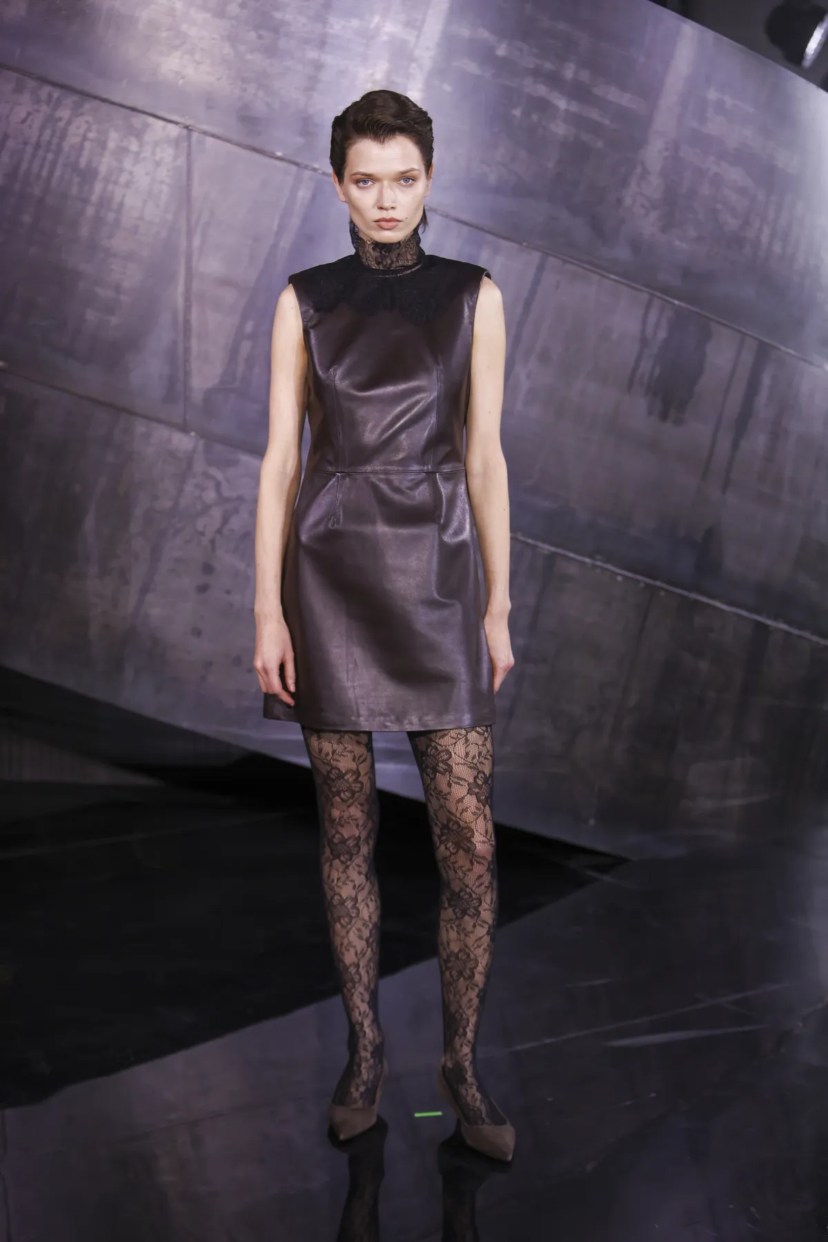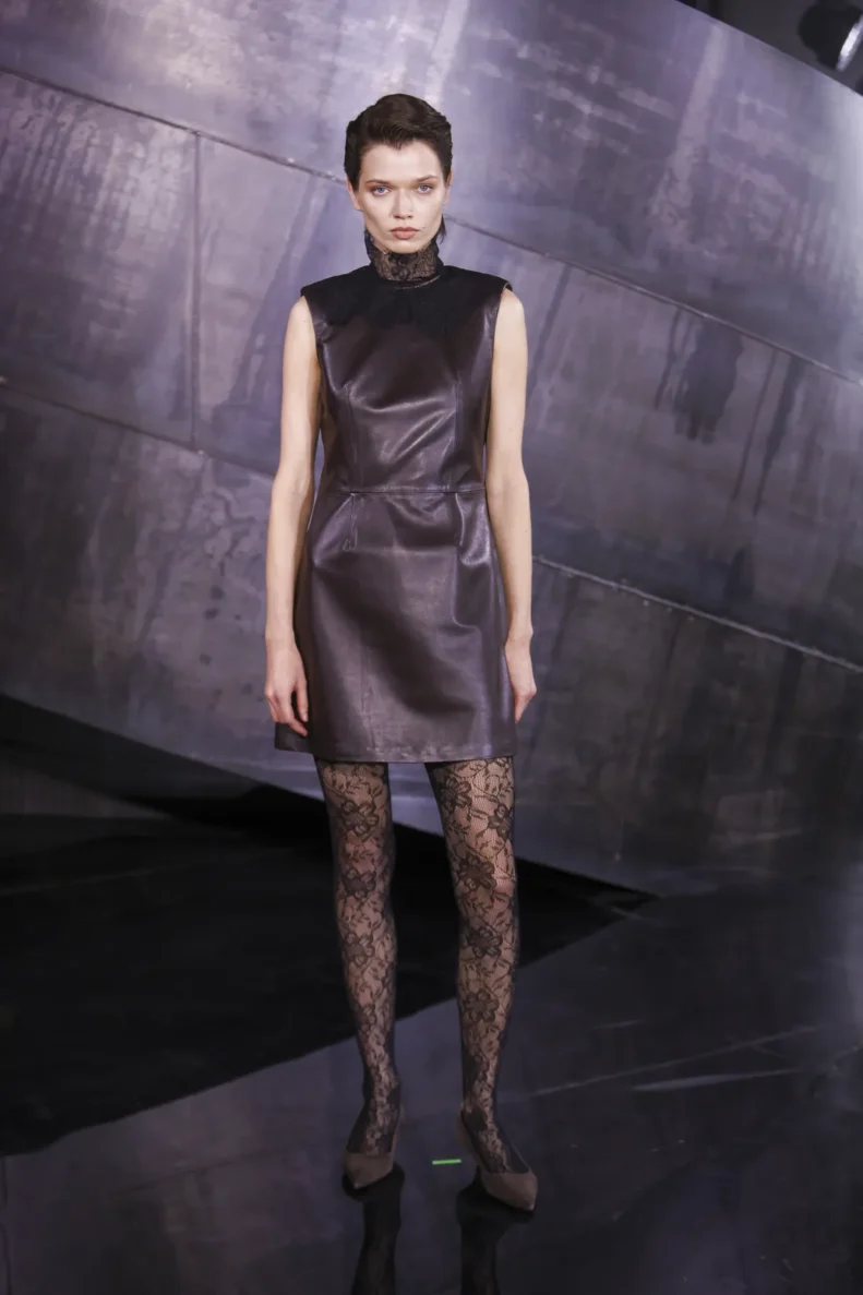 Skóra – naturalna i ekologiczna – od wielu lat jest kluczowym tworzywem w kolekcjach projektanta. Tym razem wystąpiła zarówno w formie masywnych, długich płaszczy, jak i krótszych kurtek inspirowanych klasycznymi fasonami z lat 70. i 90. Obecny był również jeans, traktowany jako materiał sztywny, z konstrukcją zbliżającą się do fasonów garniturowych. Sztuczne futra i pióra pojawiały się w bardziej spektakularnych lookach, ale pozostawały w granicach estetyki urban chic.