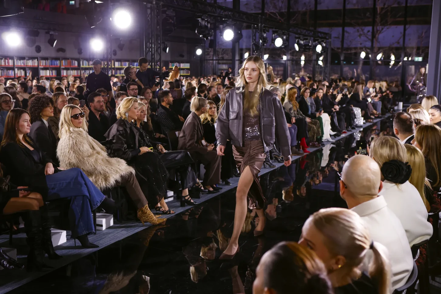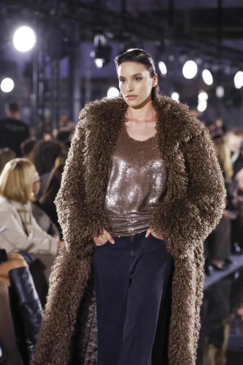 Na wybiegu zobaczyliśmy 97 sylwetek. To dużo, nawet jak na pokazy okolicznościowe. Taka skala pozwala pokazać obraz marki z wielu stron, ale jednocześnie wymaga konsekwencji estetycznej i świadomego zarządzania konstrukcją pokazu. Tutaj struktura była czytelna: podział na segmenty tematyczne oparty o materiał, funkcję i moment noszenia.