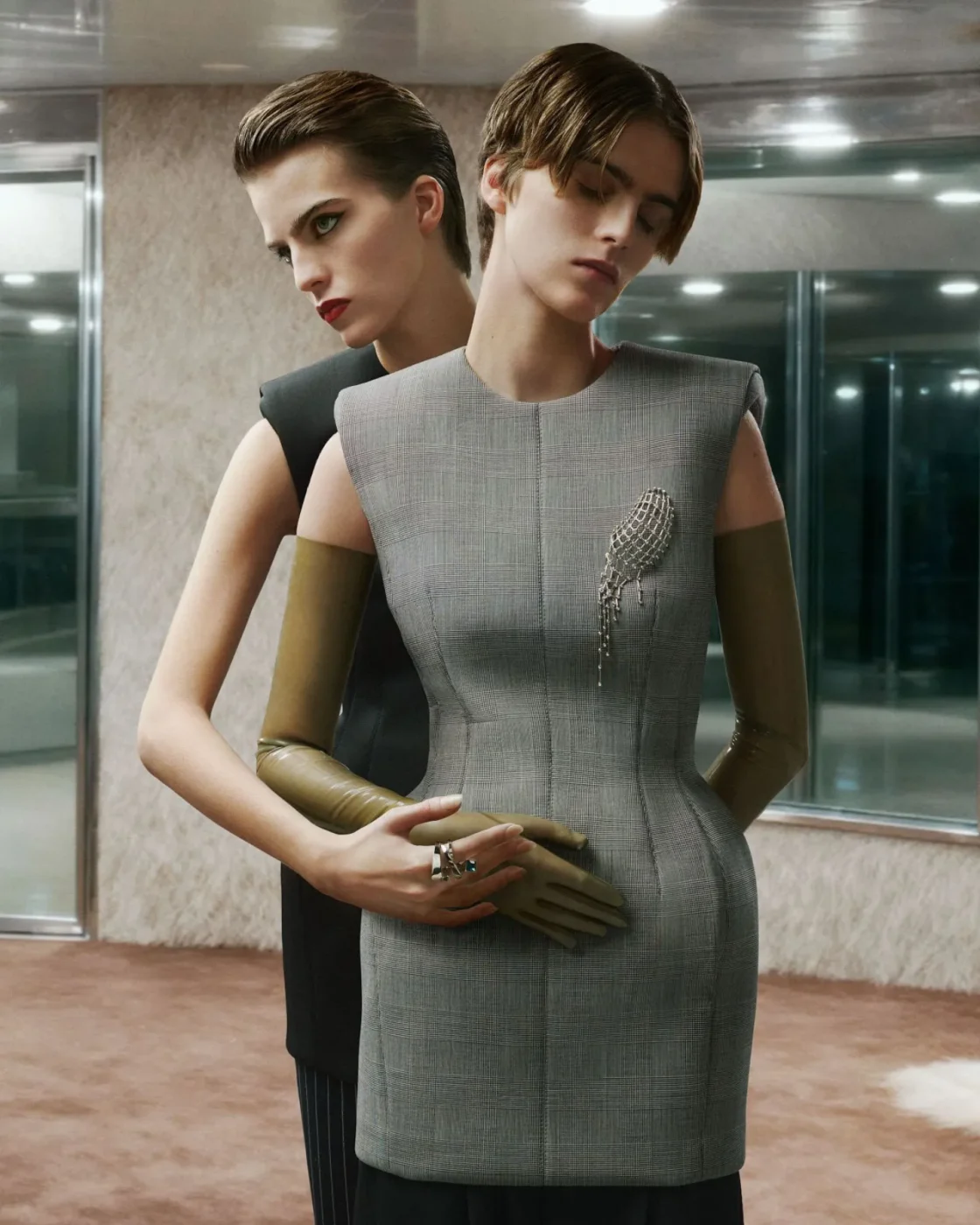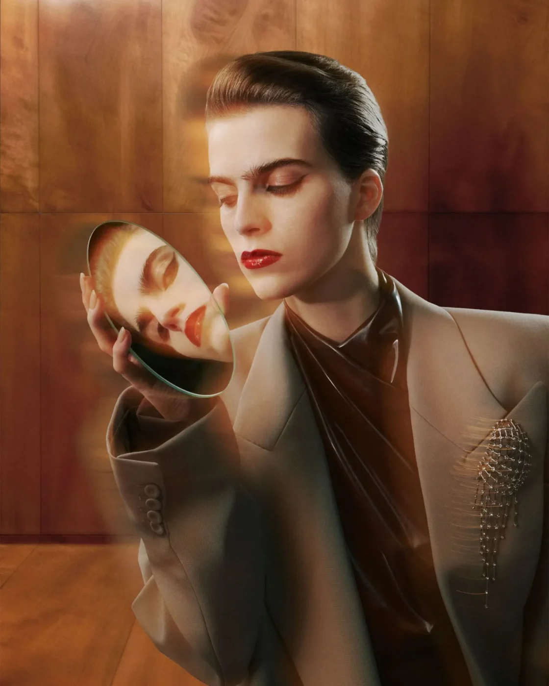 Kampania sfotografowana przez Reto Schmida i wystylizowana przez Robbiego Spencera pokazuje Libby Bennett jako kobietę w wielu odsłonach. Zmienia się z kadru na kadr, czasem stanowcza, czasem lekko ironiczna. Bez jednej etykiety. I tu tkwi sedno tej kolekcji. Tożsamość nie jest czymś zamrożonym. Ewoluuje. Mugler mówi: masz prawo przełączać persony w sekundę. Raz bohaterka kina noir, raz gwiazda nocnego życia. I obie wersje są prawdziwe.