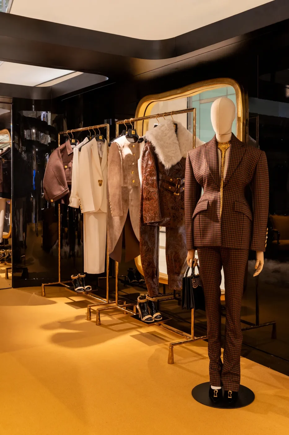 Na wieszakach i podświetlonych półkach: selekcja ready-to-wear, biżuteria i torebki z kolekcji Fall-Winter 2025. Jest pełen wachlarz hitów marki: rzeźbione garnitury, kultowe trompe-l’œil, szalone wieczorowe kreacje. Nie brakuje najważniejszych fetyszów Schiaparelli — Face Bag z ustami i nosem, Secret Bag, anatomicznych elementów, które tak pięknie balansują między elegancją a absurdem.