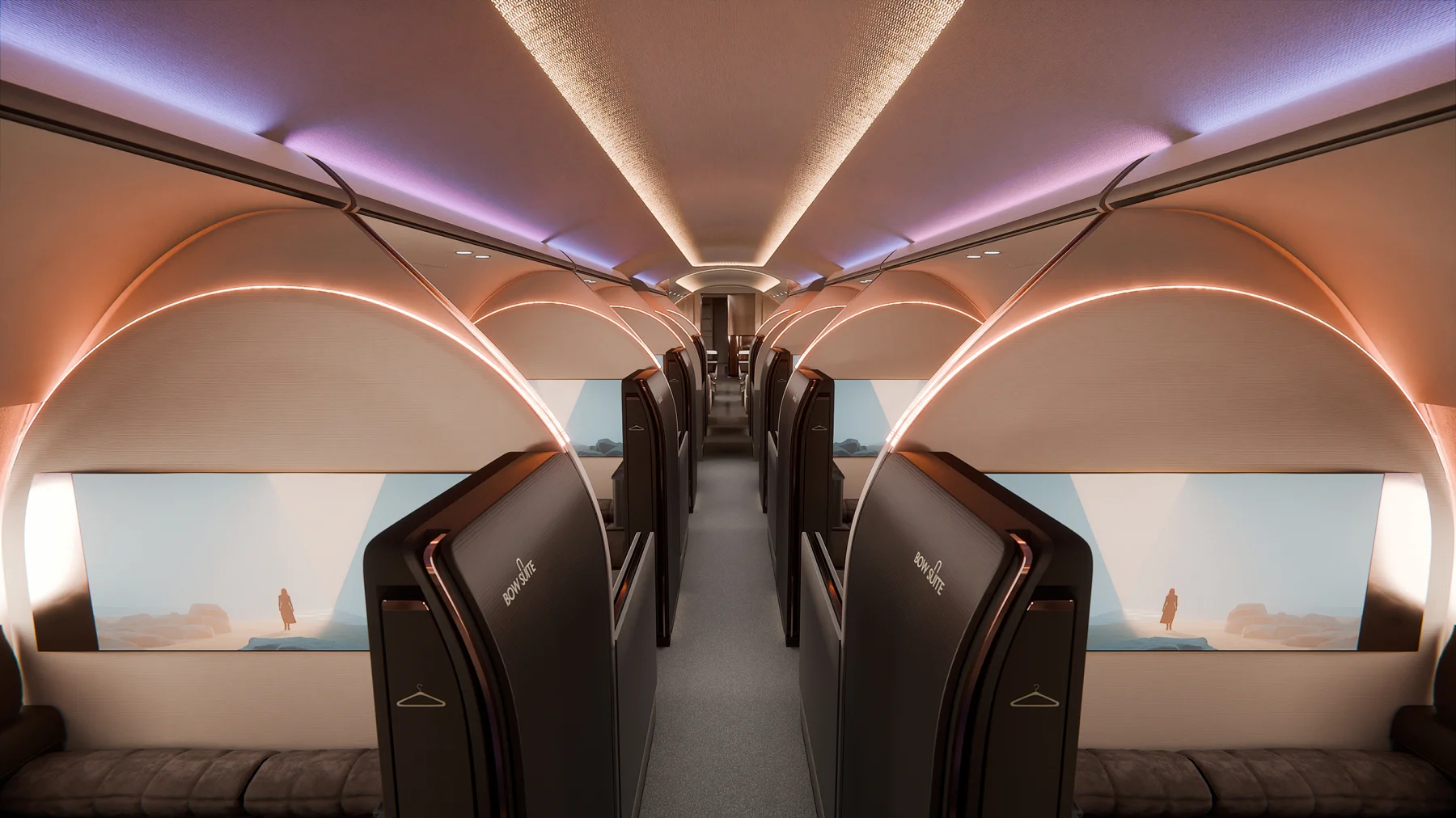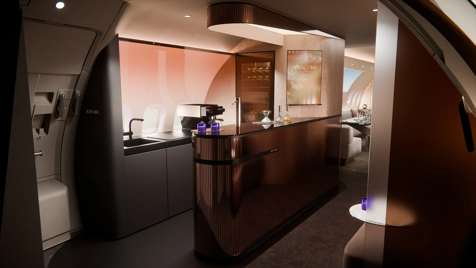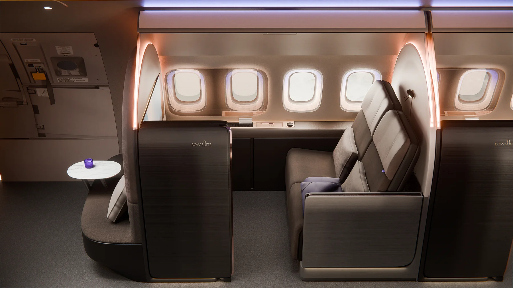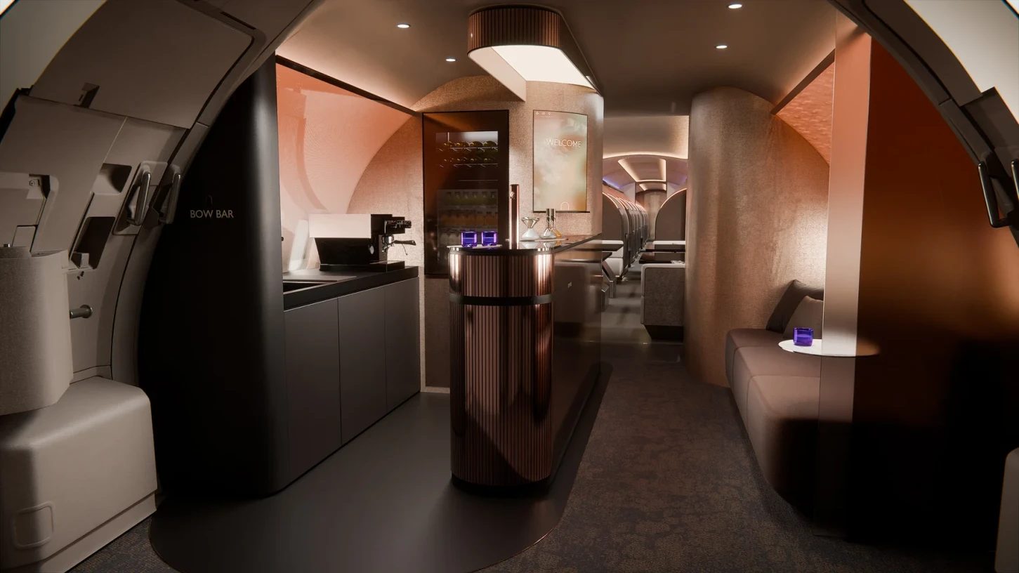 Najważniejszy element „The BOW” to modularność. To nie jest wnętrze zaprojektowane raz na zawsze. Układ można zmieniać – od liczby prywatnych stref po wielkość przestrzeni wspólnych. Można zwiększyć liczbę miejsc do pracy, rozbudować część lounge albo zamknąć przestrzeń w bardziej prywatnym układzie. Wszystko zależy od tego, kto leci i w jakim celu. Projekt zakłada obsługę do 28 pasażerów bez utraty komfortu.