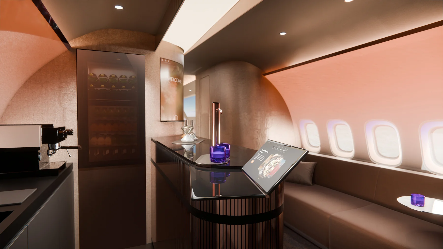 Kabina została podzielona na kilka wyraźnych obszarów. Wejście jest jak lobby – z wyraźną scenografią i elementami, które można zmieniać w zależności od potrzeb. Centralna część to lounge z dużym stołem i ekranami dotykowymi. Ta przestrzeń może działać jako miejsce pracy albo strefa spotkań przy posiłku. Dalej pojawiają się prywatne apartamenty, zaprojektowane w oparciu o miękkie linie i materiały premium. Kluczowe są tu detale – oświetlenie, akustyka, zapach, ukryte schowki.