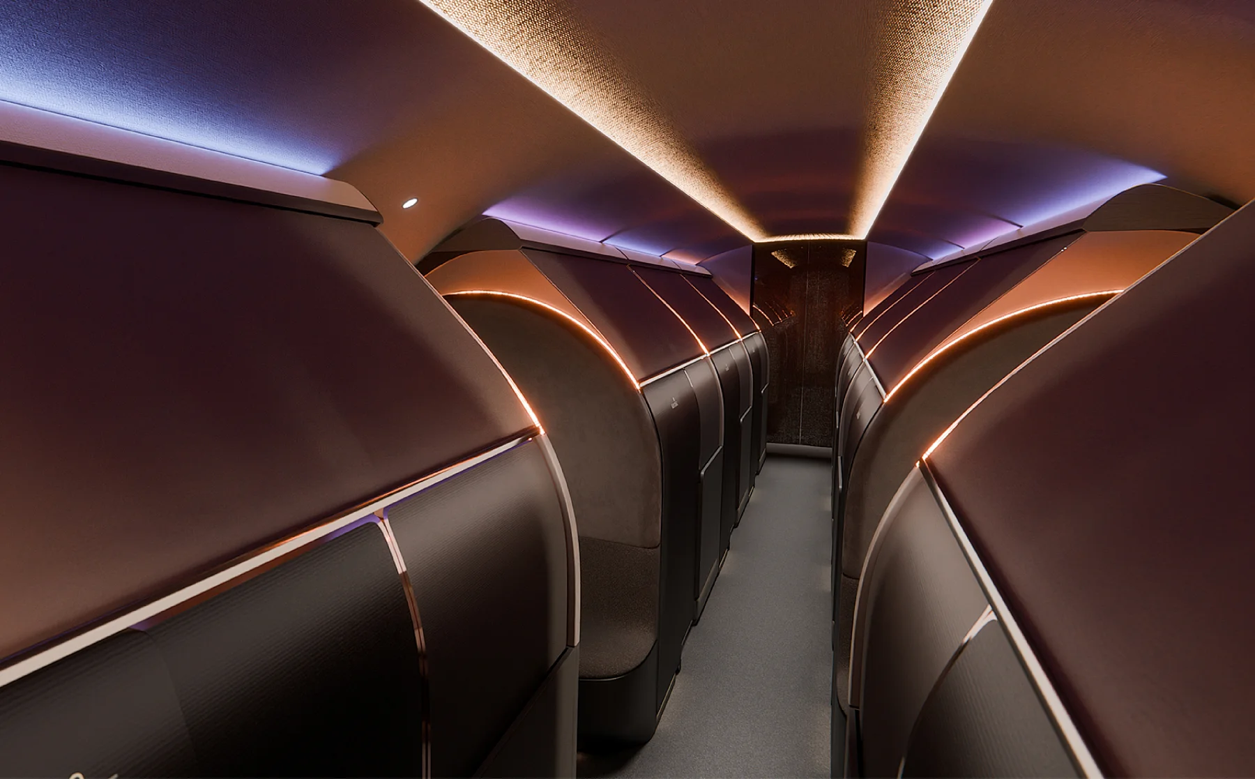 Ten koncept nie jest skierowany do jednej osoby. Chodzi o grupy – zarządy firm, zespoły sportowe, artyści w trasie. To zmienia sposób myślenia o przestrzeni. Zamiast jednej głównej kabiny pojawia się układ stref, które można łączyć lub oddzielać. Prywatne apartamenty mieszczą jedną lub dwie osoby. Mogą służyć do odpoczynku, pracy albo spotkań. Każda przestrzeń ma własne miejsce do przechowywania – od sprzętu po rzeczy osobiste.