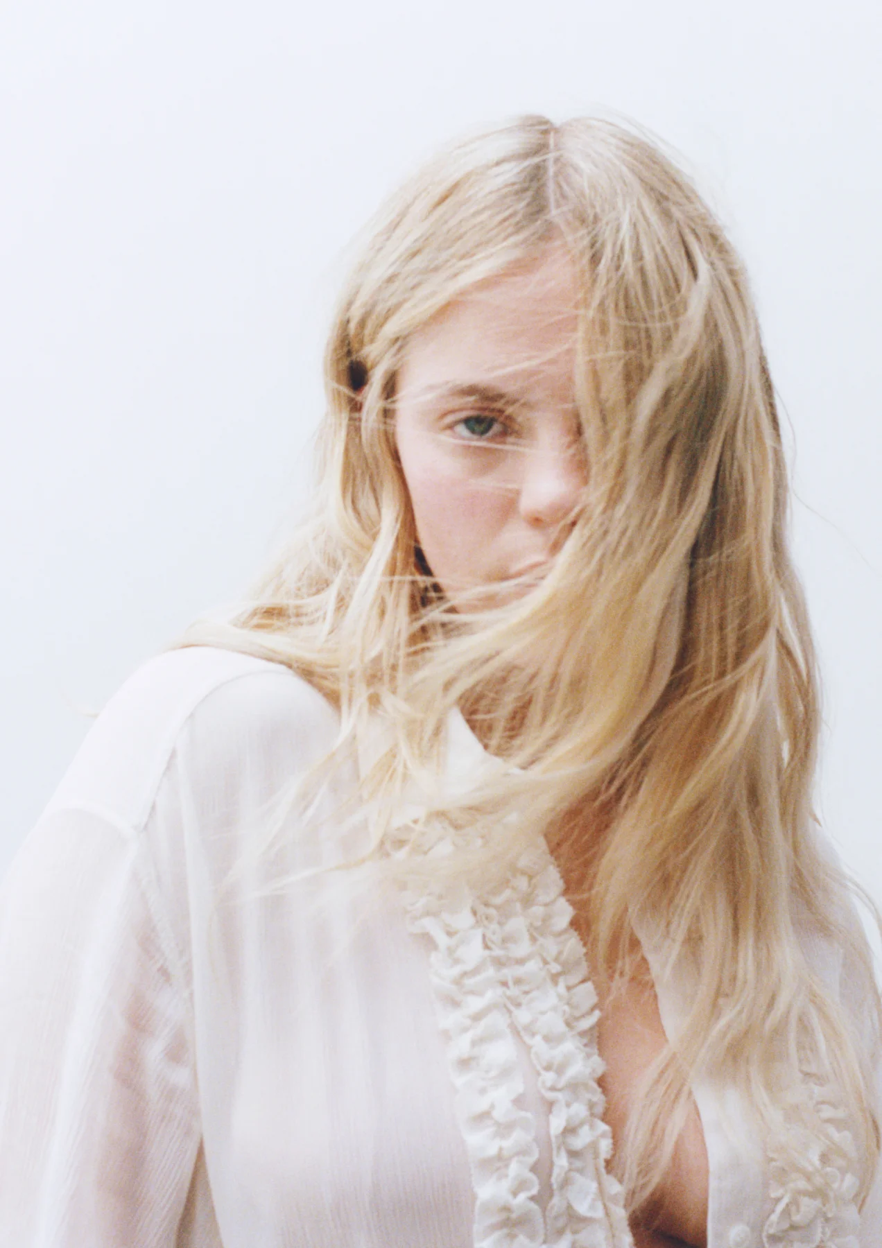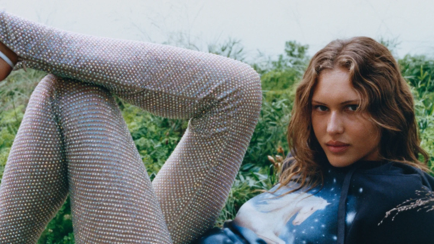 Pojawia się też długa biała suknia z pelerynowym rękawem, który przechodzi w dół sylwetki, tworząc zamkniętą linię materiału. Obok niej kolekcja oferuje bardziej codzienne elementy – denim, zestawy separowane oraz transparentne topy i sukienki z archiwalnym printem cherry.